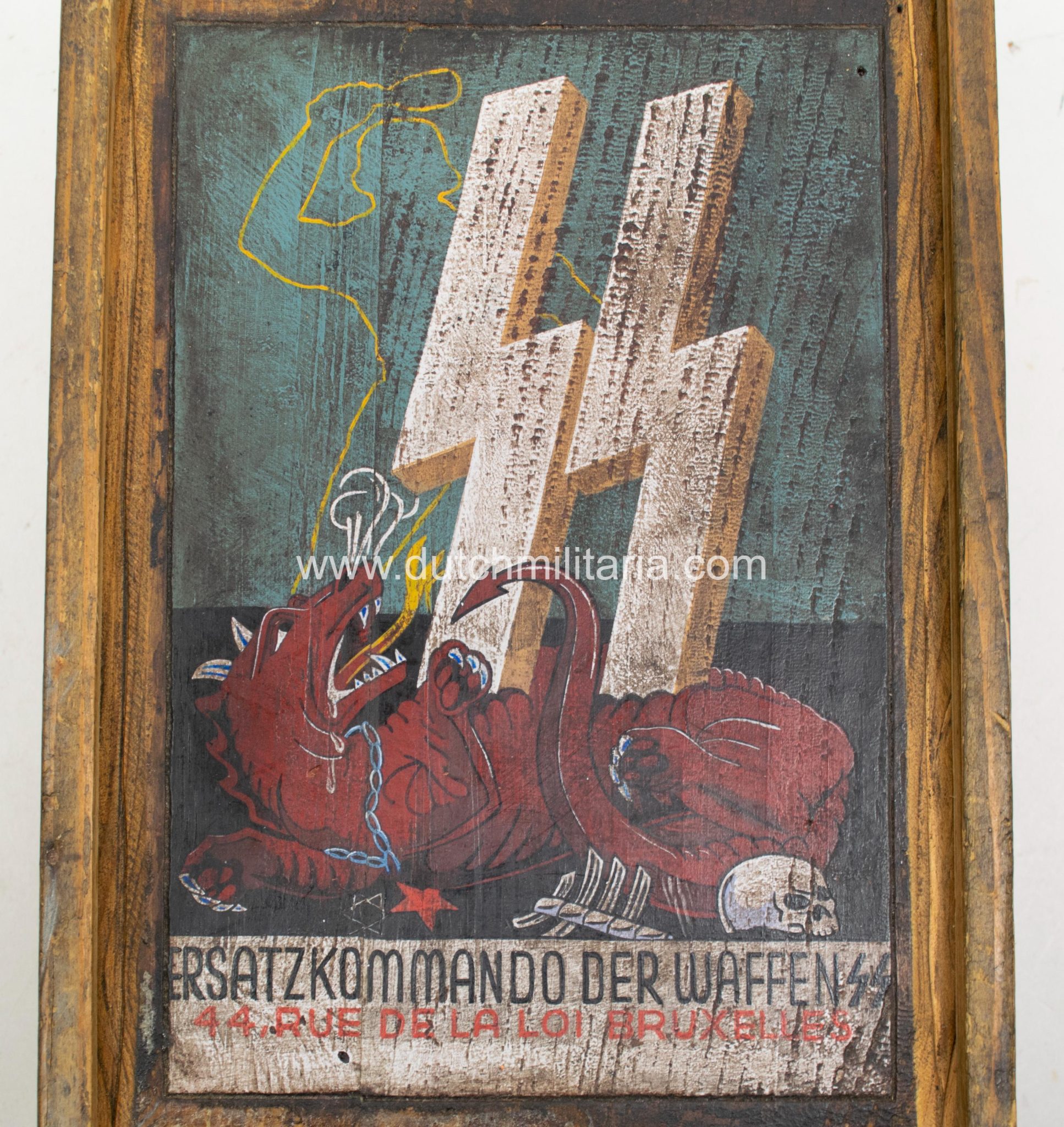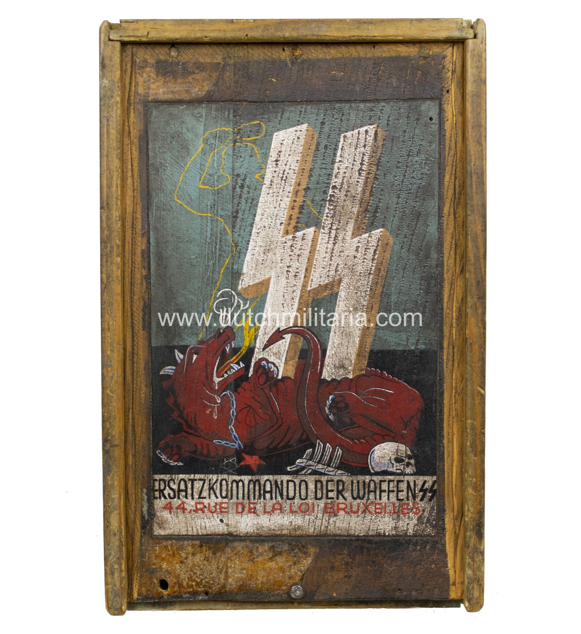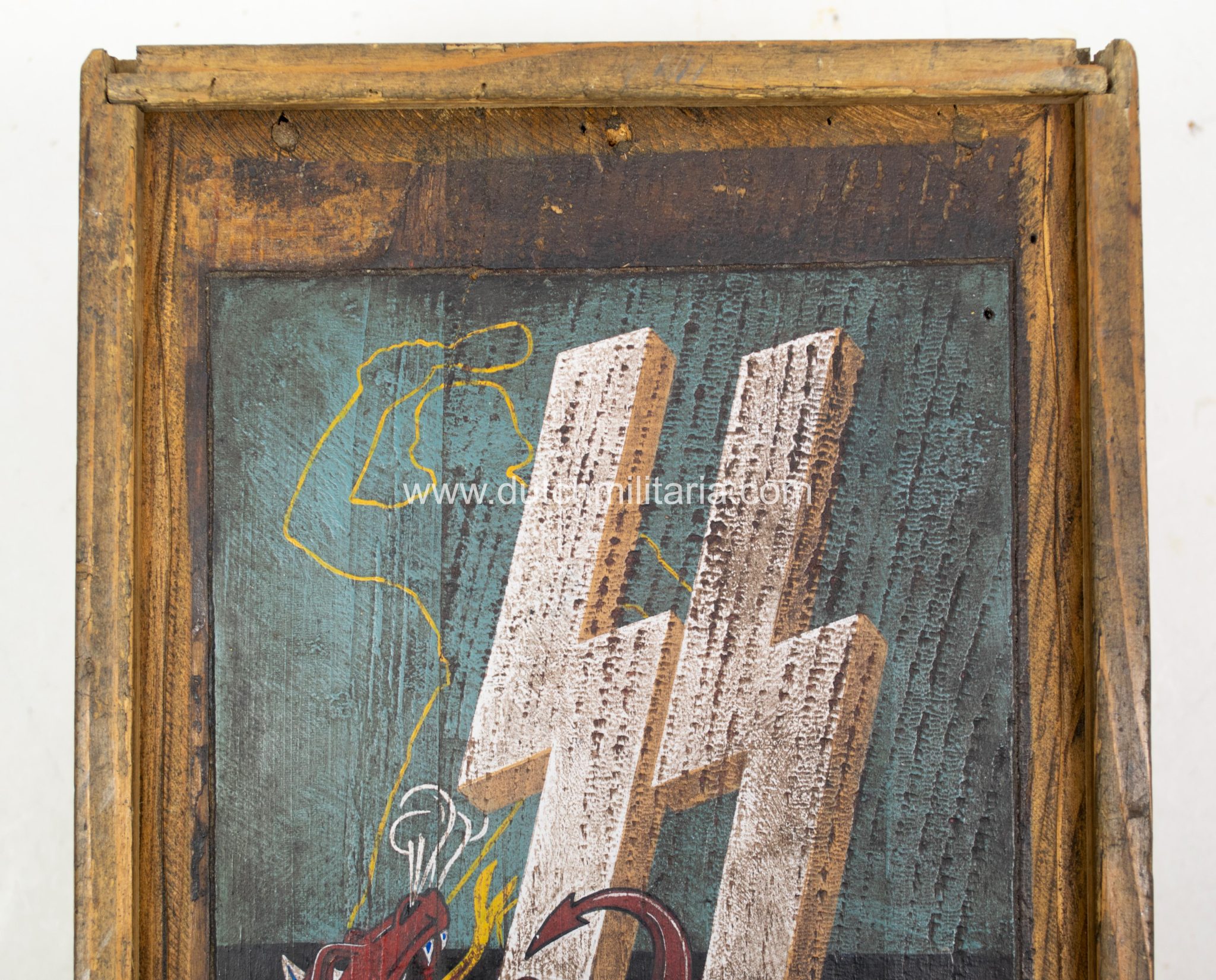 On top is a painted image of a very famous Belgian wartime SS poster: “Ersatzkommando der Waffen SS. 44. Rue de la Loi Bruxelles“, it shows a Bolshevik dragon that is being crushed by SS runes. The symbolism is obvious. On one of the sides is an impression where as it seems at one time was attached a SS metal cap eagle and metallic SS runes. Again i can not tell if this is an original wartime veterans home made piece or a postwar made box. Whoever made it must have had some artistic skills as it is very well done. In all my years of collecting i have seen never before a piece like this.