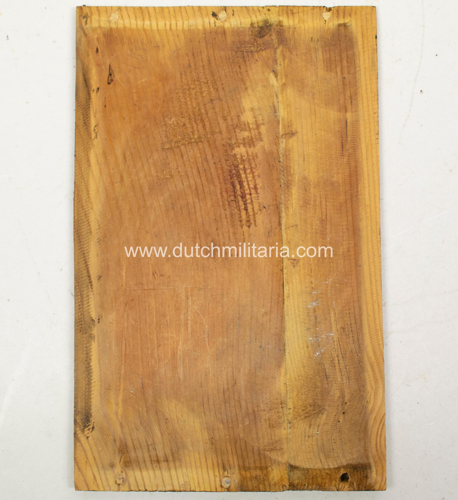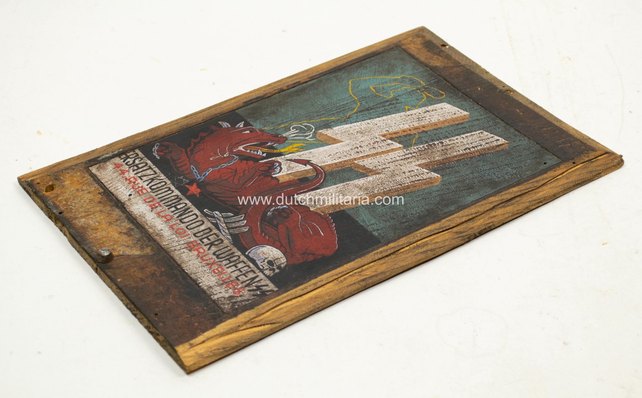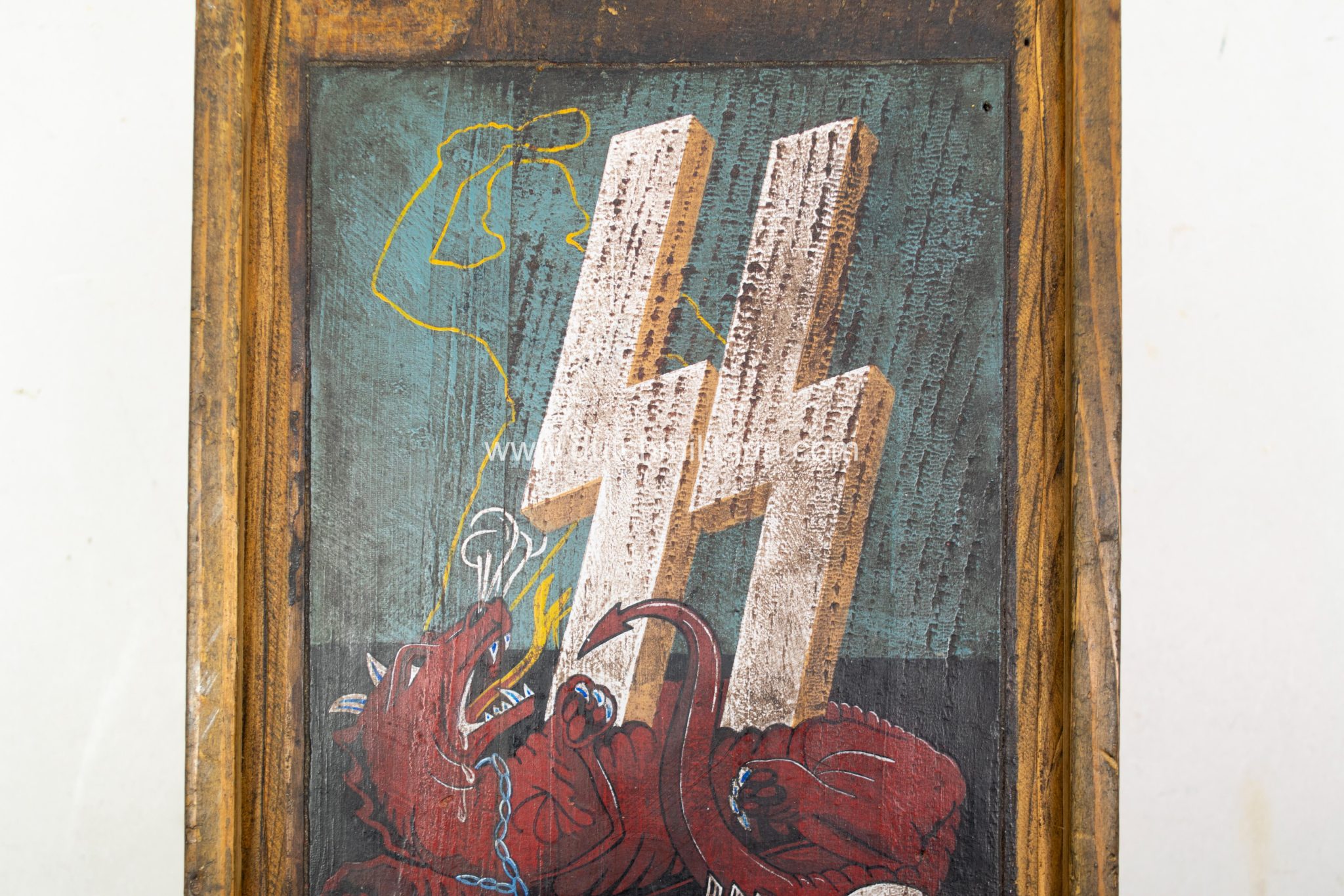 On top is a painted image of a very famous Belgian wartime SS poster: “Ersatzkommando der Waffen SS. 44. Rue de la Loi Bruxelles“, it shows a Bolshevik dragon that is being crushed by SS runes. The symbolism is obvious. On one of the sides is an impression where as it seems at one time was attached a SS metal cap eagle and metallic SS runes. Again i can not tell if this is an original wartime veterans home made piece or a postwar made box. Whoever made it must have had some artistic skills as it is very well done. In all my years of collecting i have seen never before a piece like this.