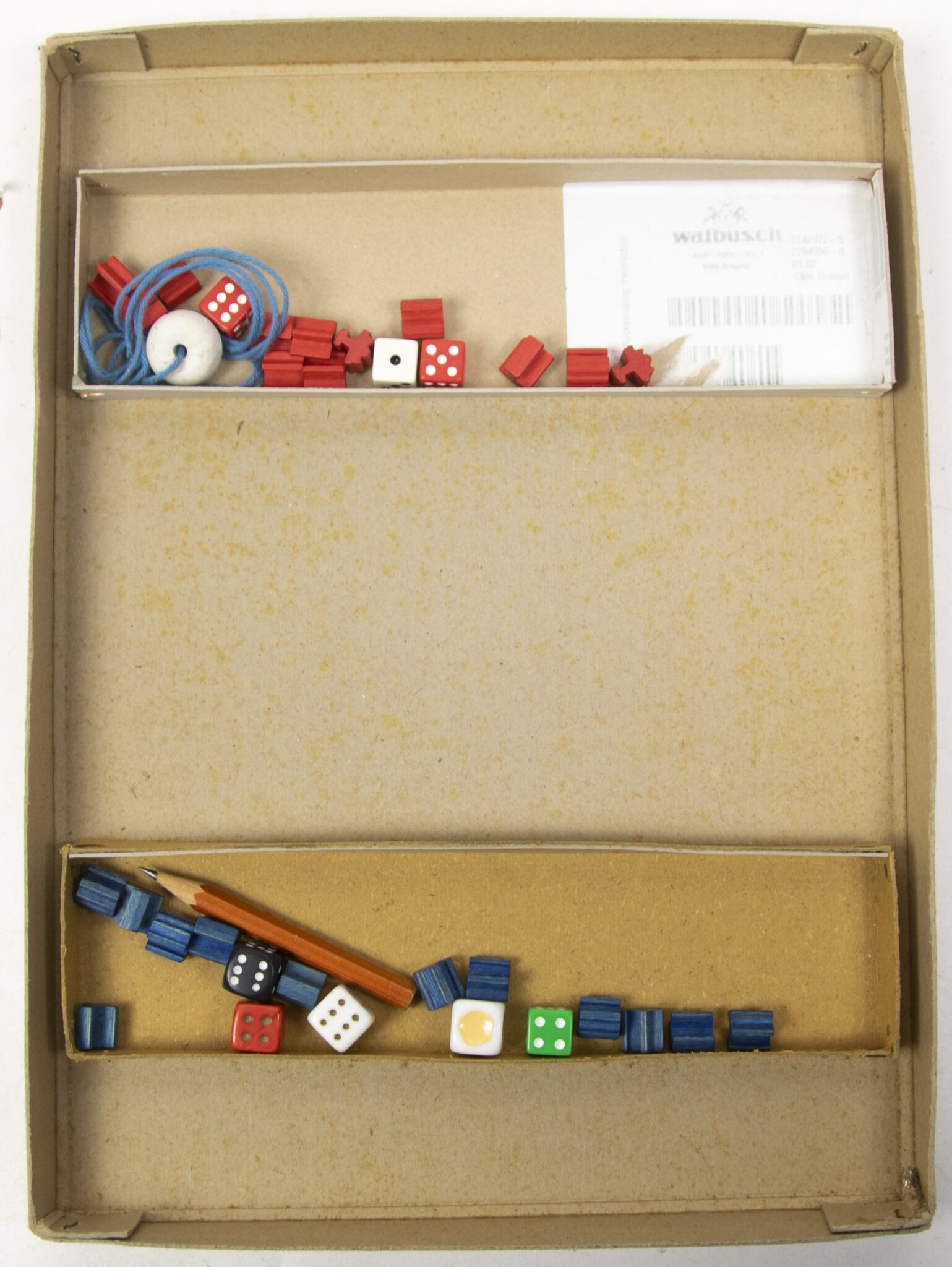 Inside the box is a foldable boardgame floorplan, dice and a number of figures (incomplete?), as well as an instructionsheet.
