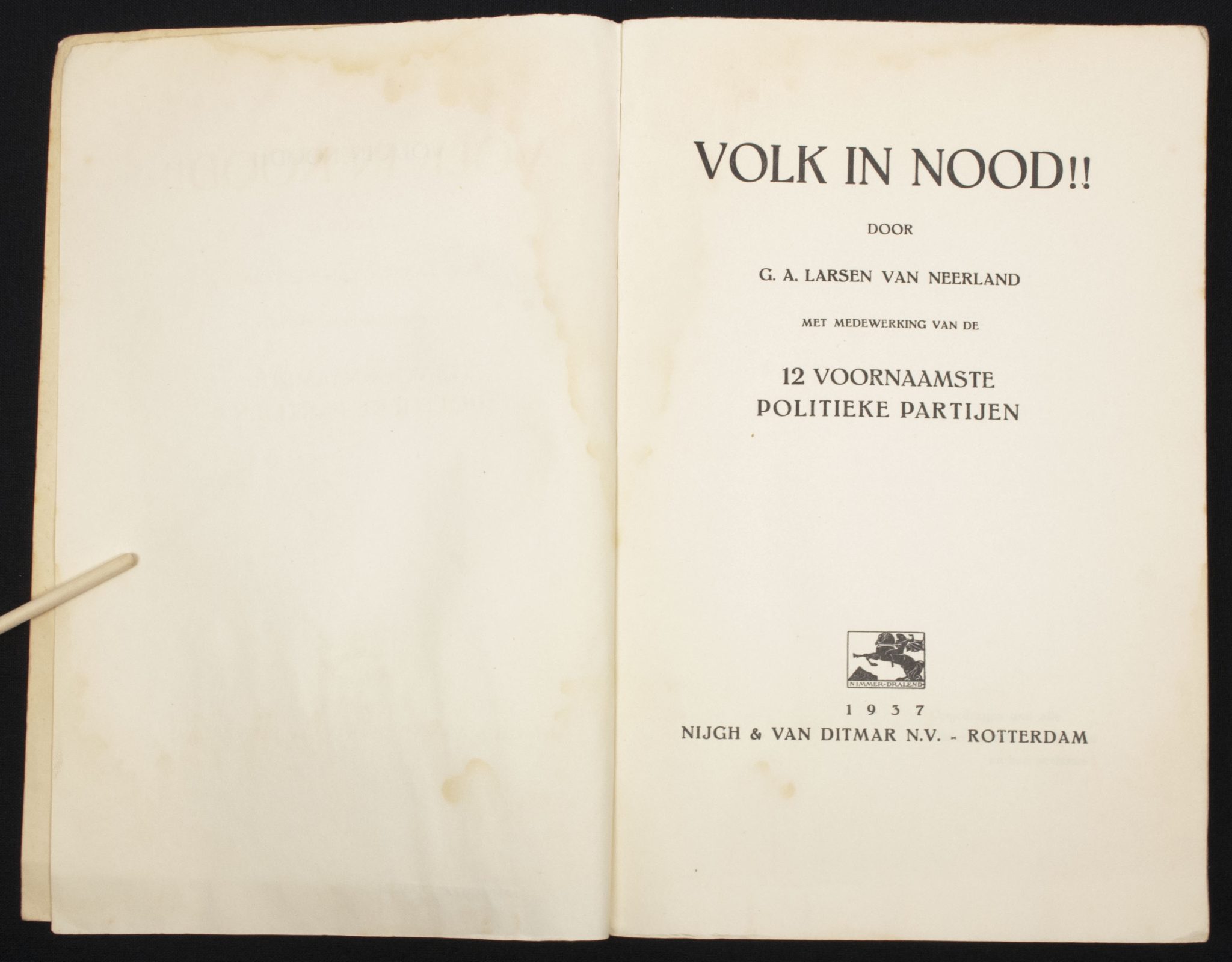 (Book) G.A. Larsen van neerland – Volk in Nood, Nigh & van Ditmar N.V., Rotterdam, (1937), cardboard cover.