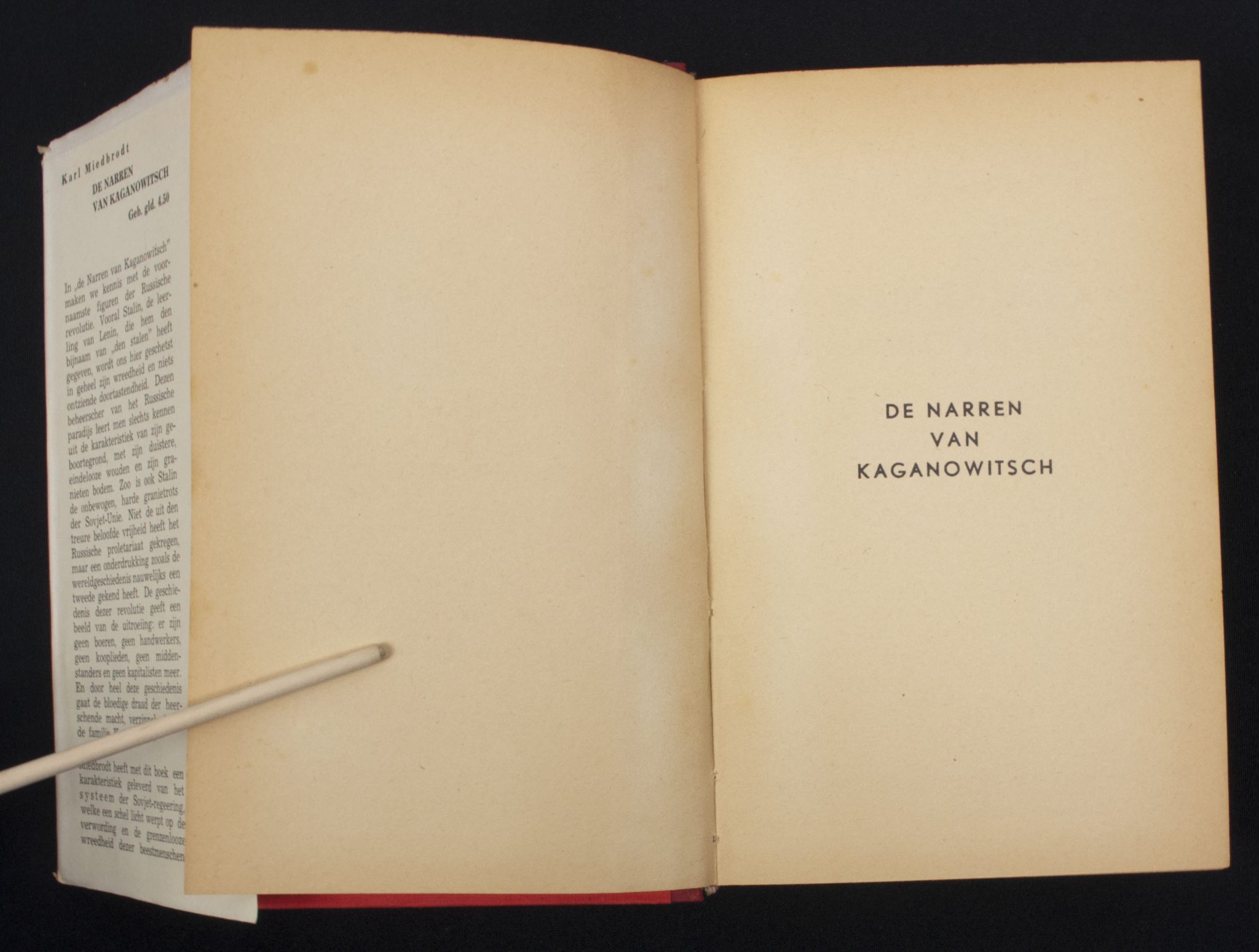 (Book) Karl Miedtbrodt – De narren van Kaganowitsch, Volksche Uitgeverij Westland, (1943), tweede druk. Halflinnen bound.