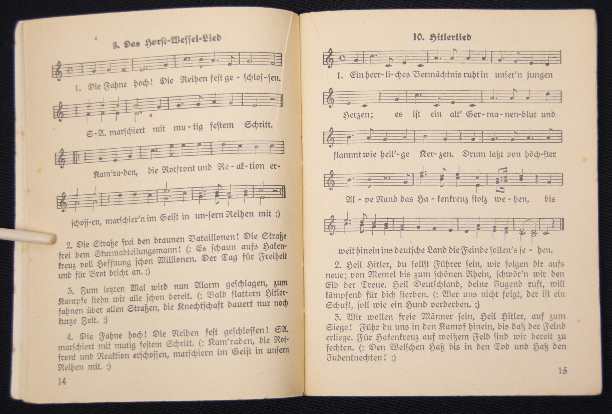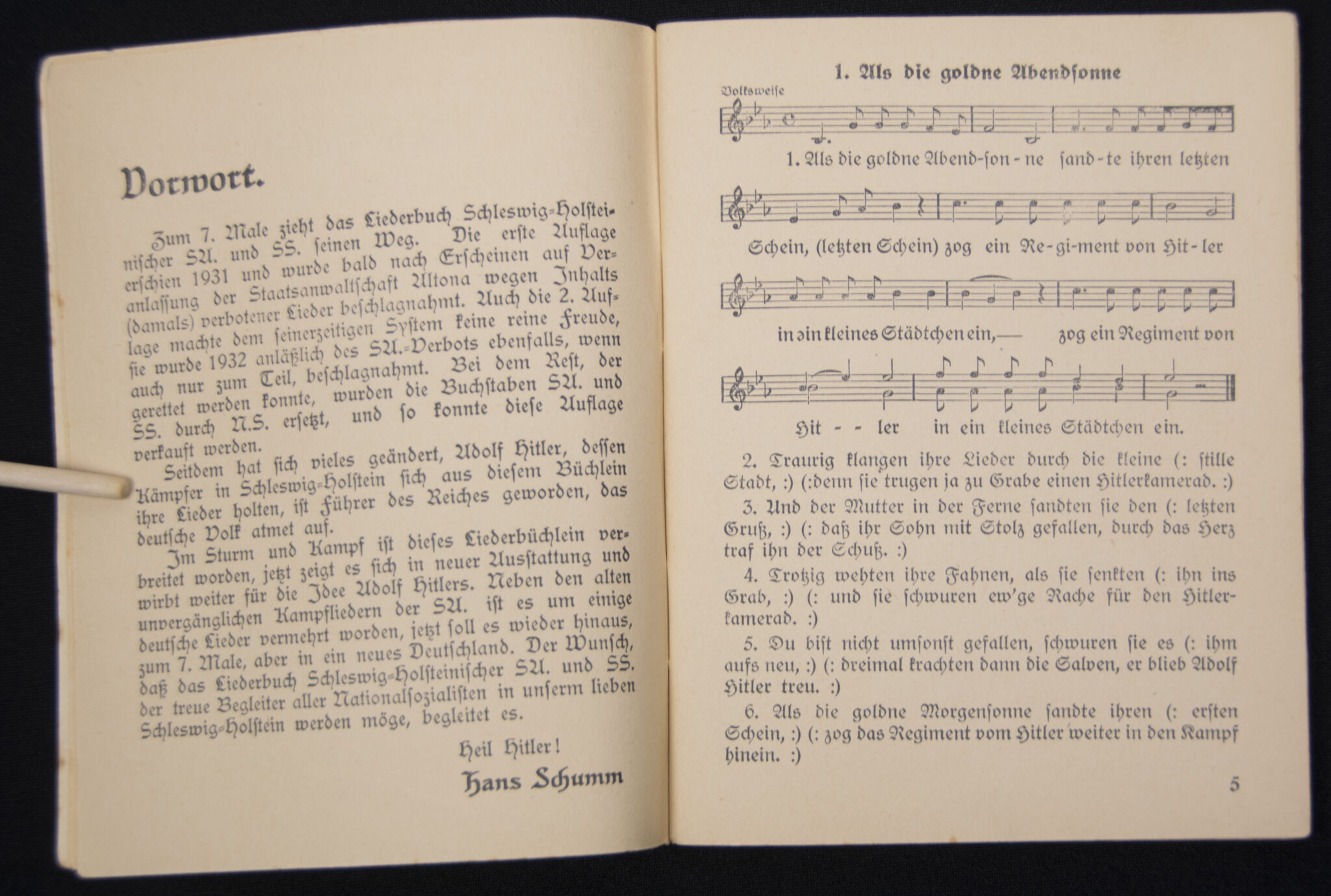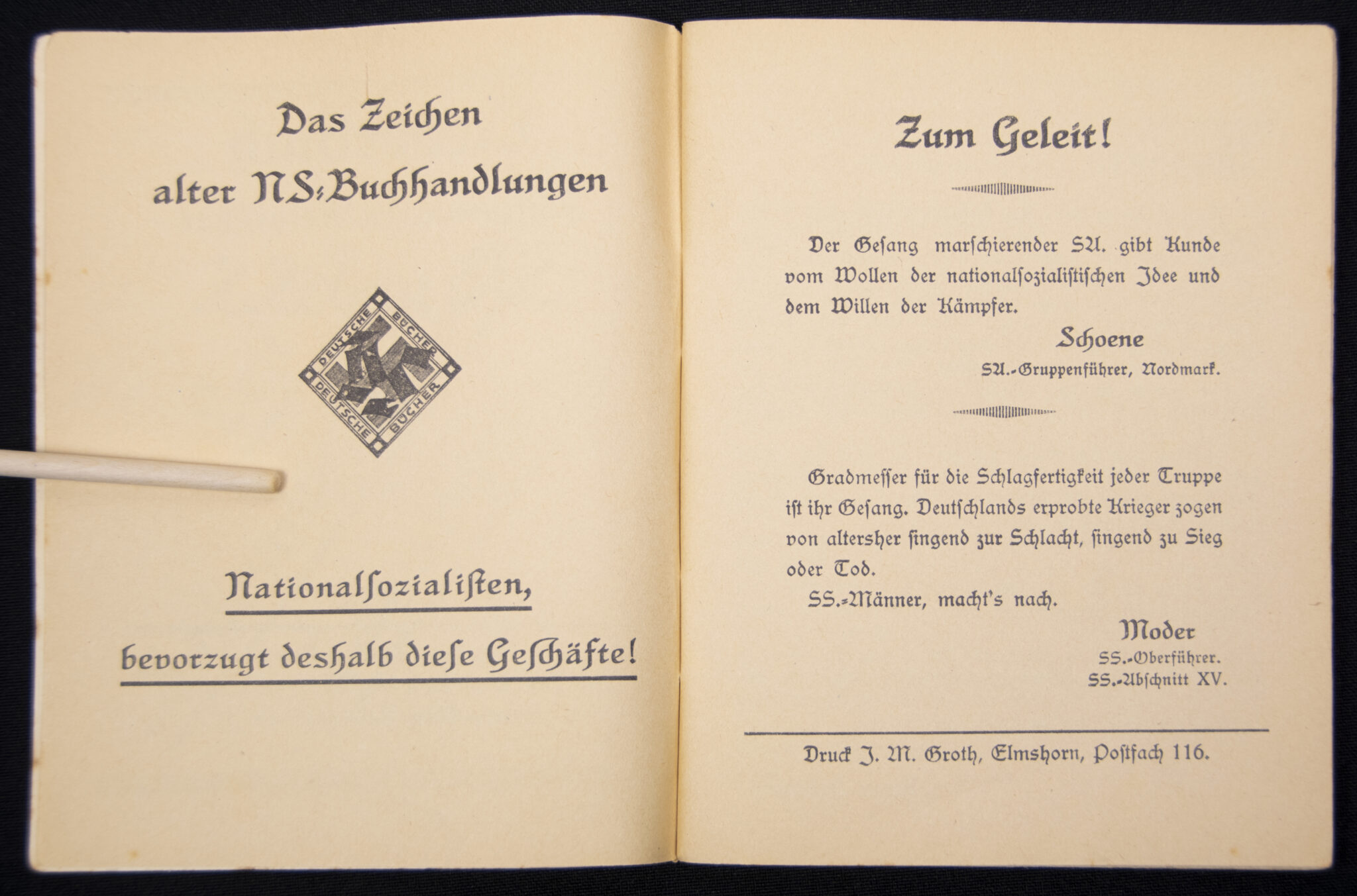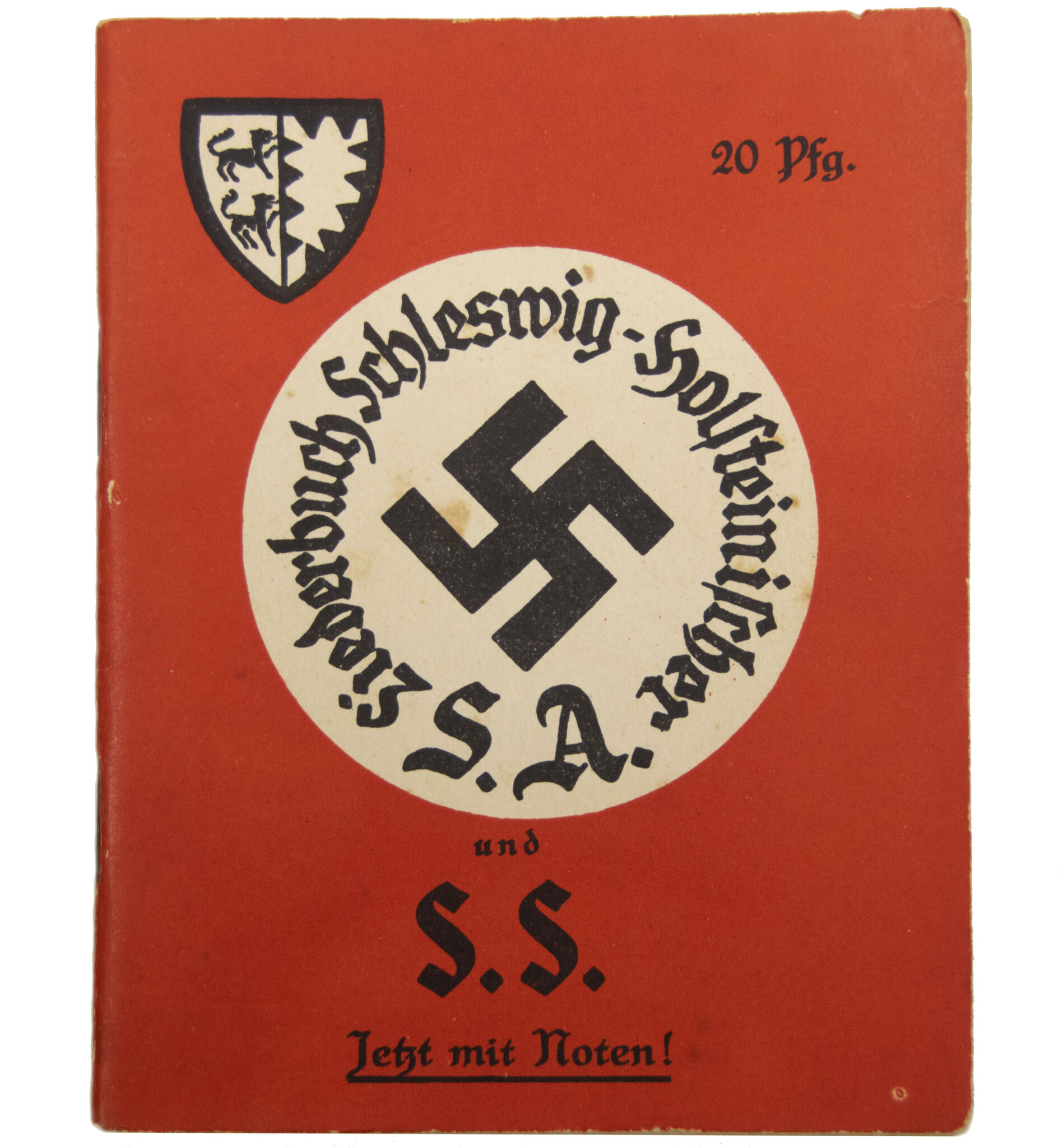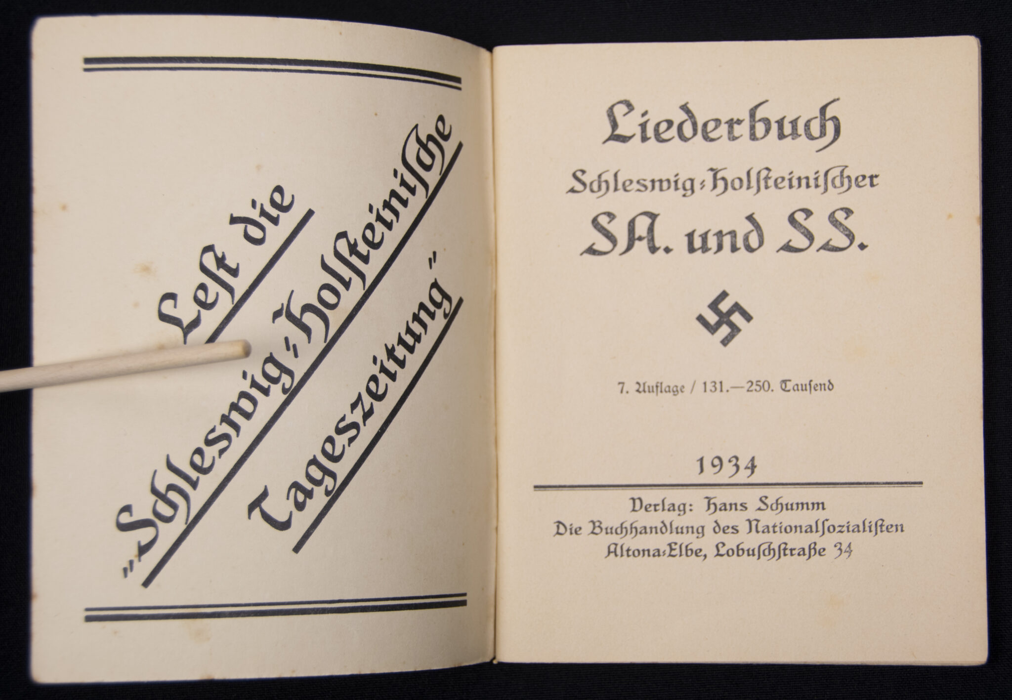 Please note that this is the the Schleswig-Holseiner edition. A similar brochure also exist for the Hamburgischer S.A (see here for reference: https://dutchmilitaria.com/product/brochure-liederbuch-hamburgischer-sa-1933/)