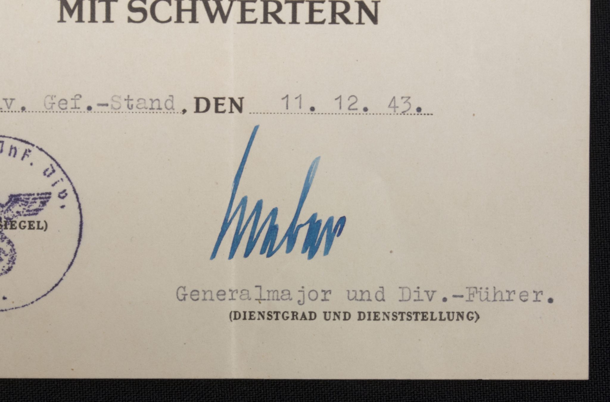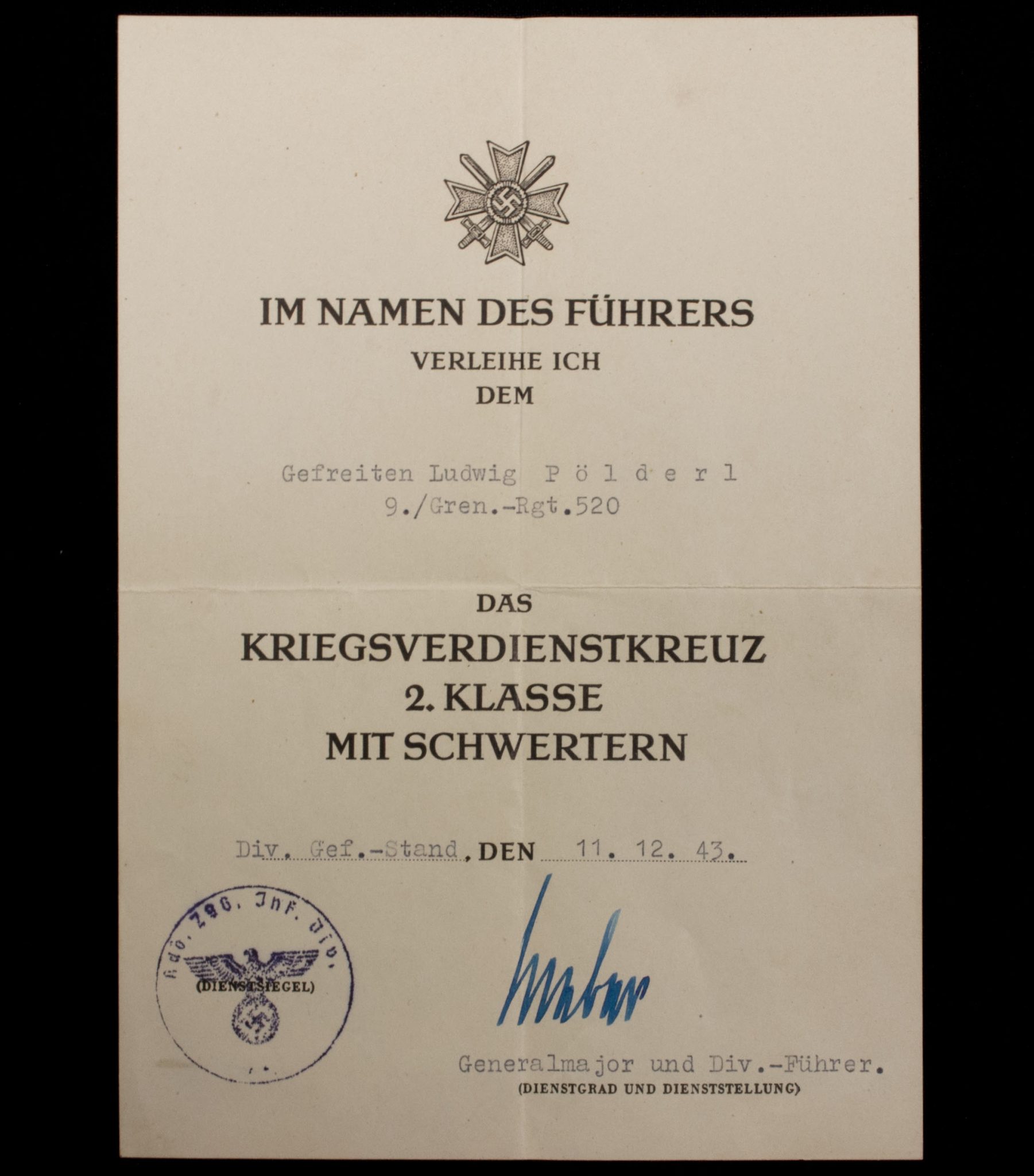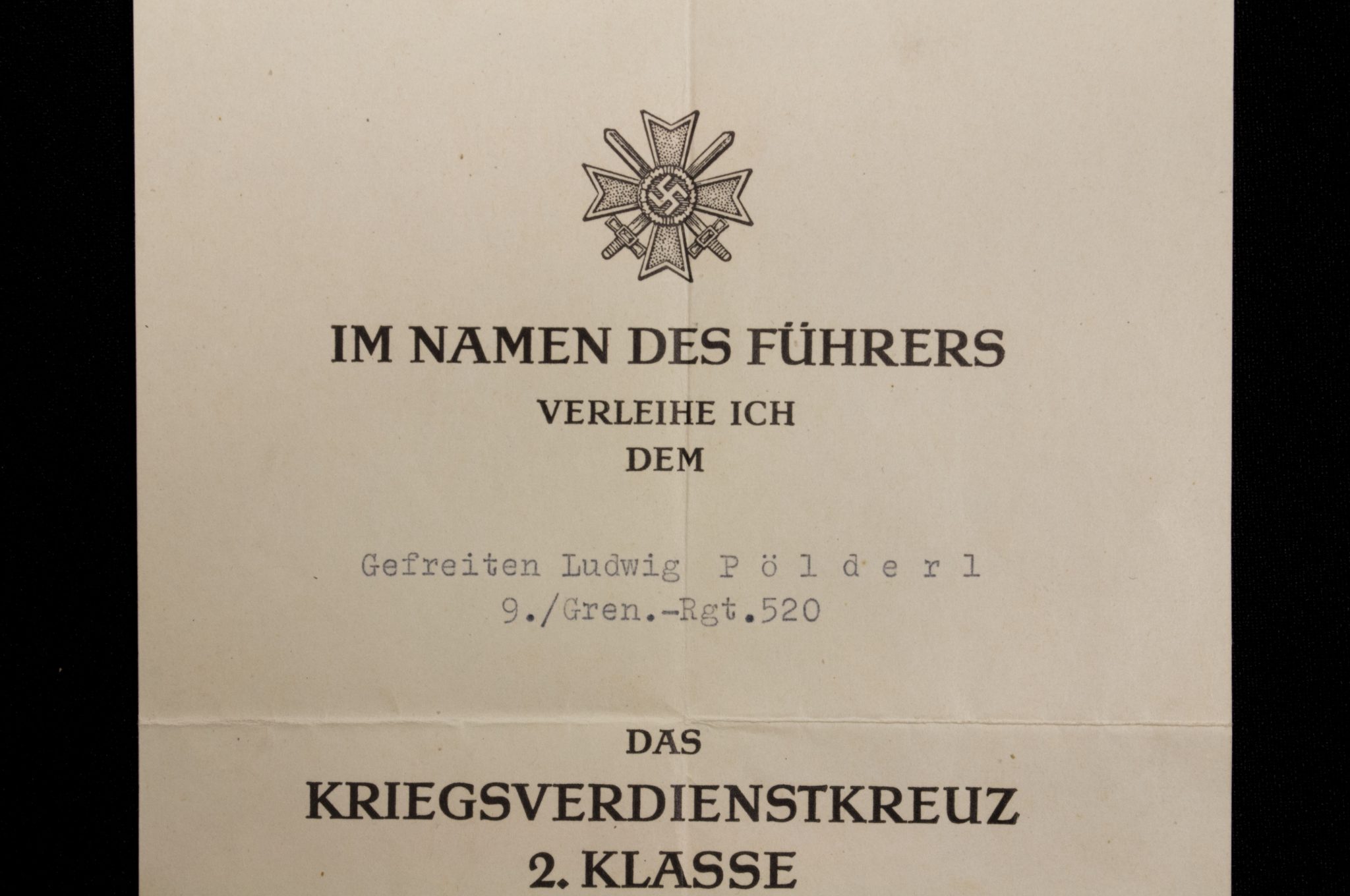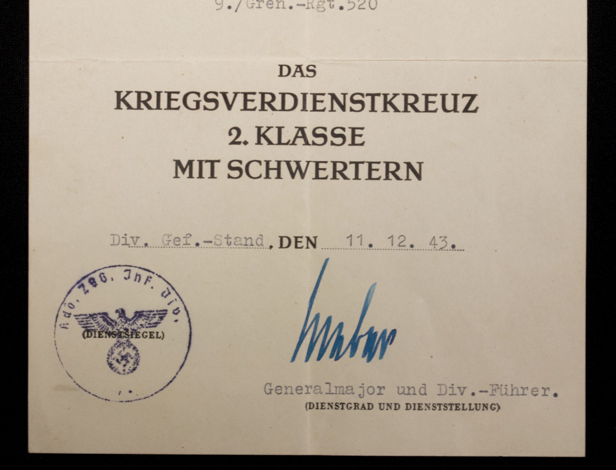 (Citation) Kriegsverdienstkreuz 2. Klasse mit Schwertern urkunde 9./Gren.-Rgt.520.
