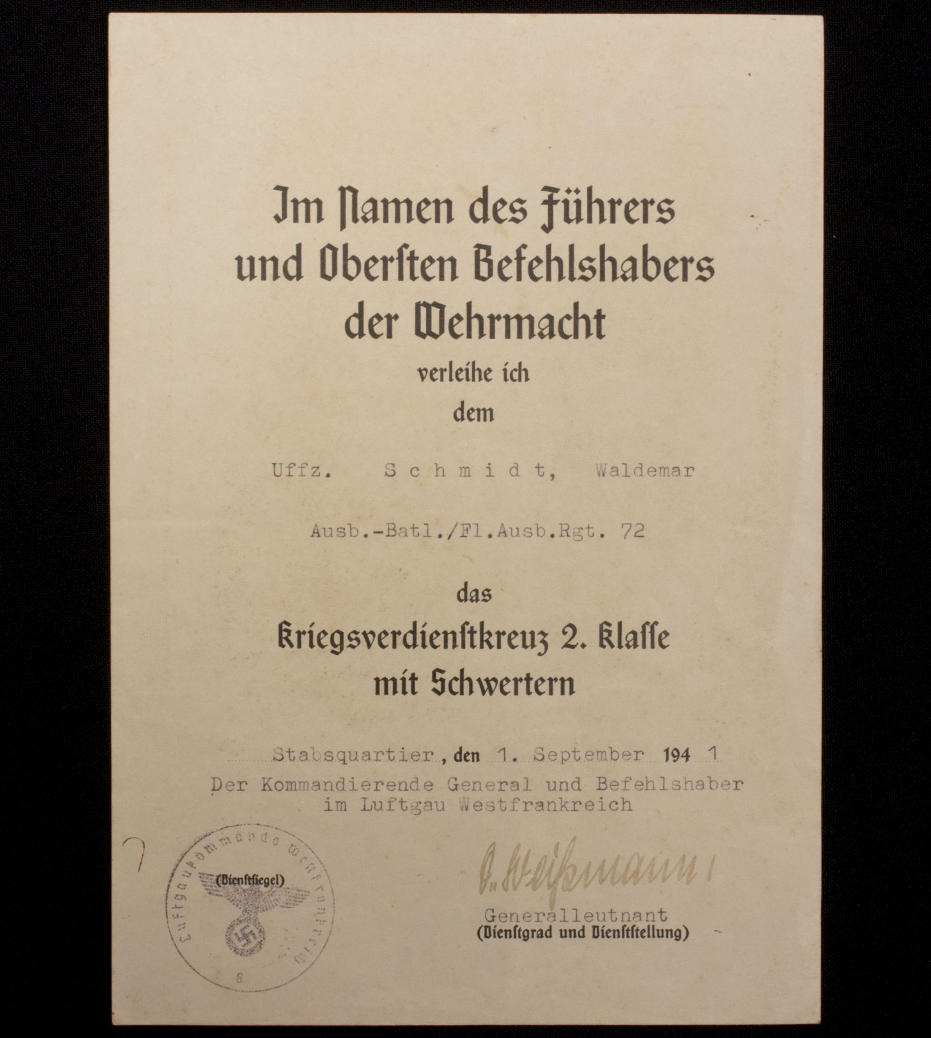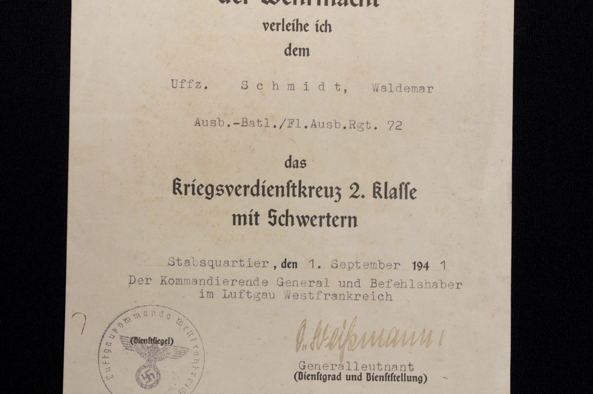 (Citation) Kriegsverdienstkreuz 2. Klasse mit Schwertern urkunde Ausb.-Batl./Fl.Ausb.Rgt.72.