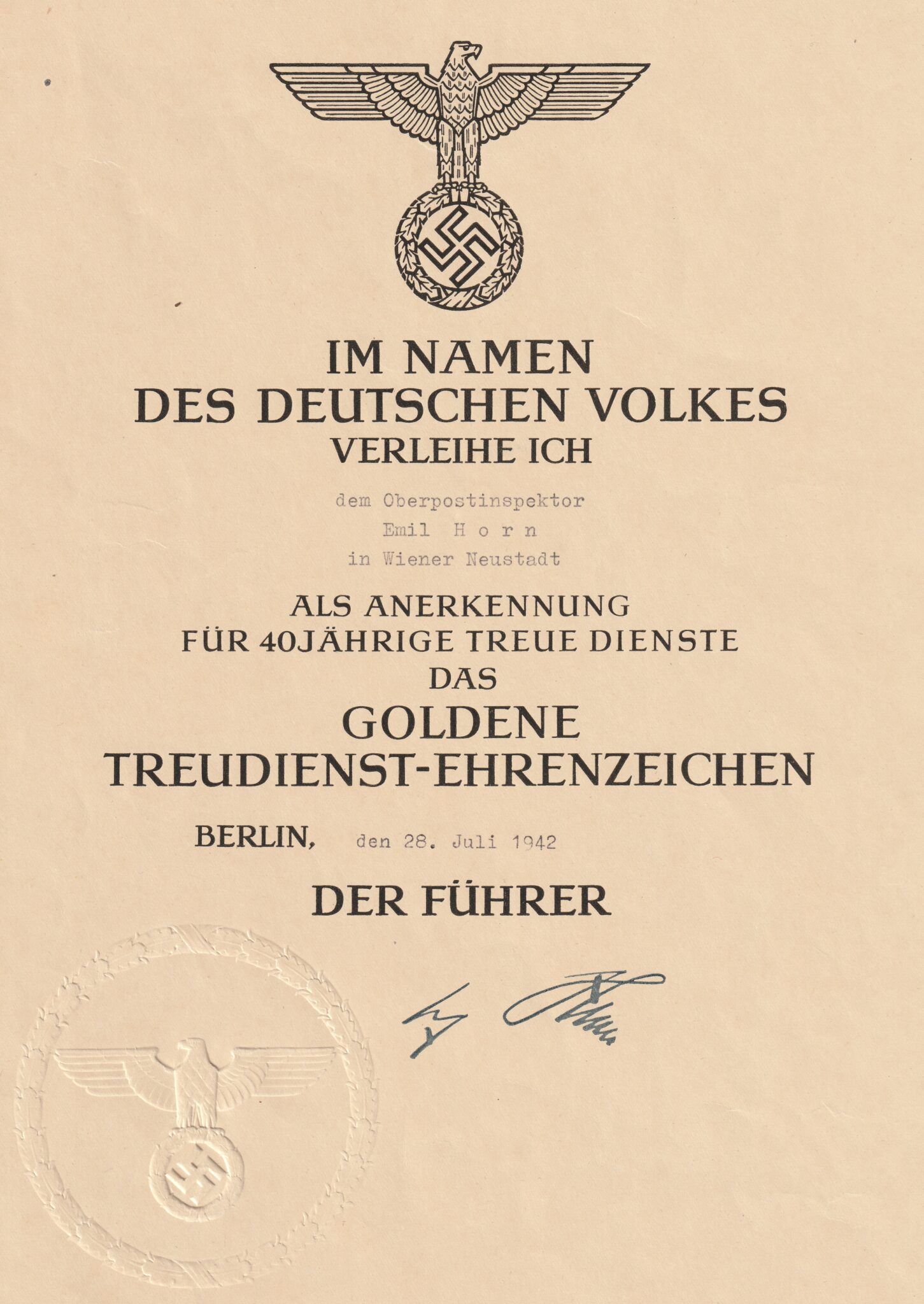 You are here: Home / Passes, Documents and Citations / (Citation / Urkunde) Das Goldene Treudienst-Ehrenzeichen (1942)