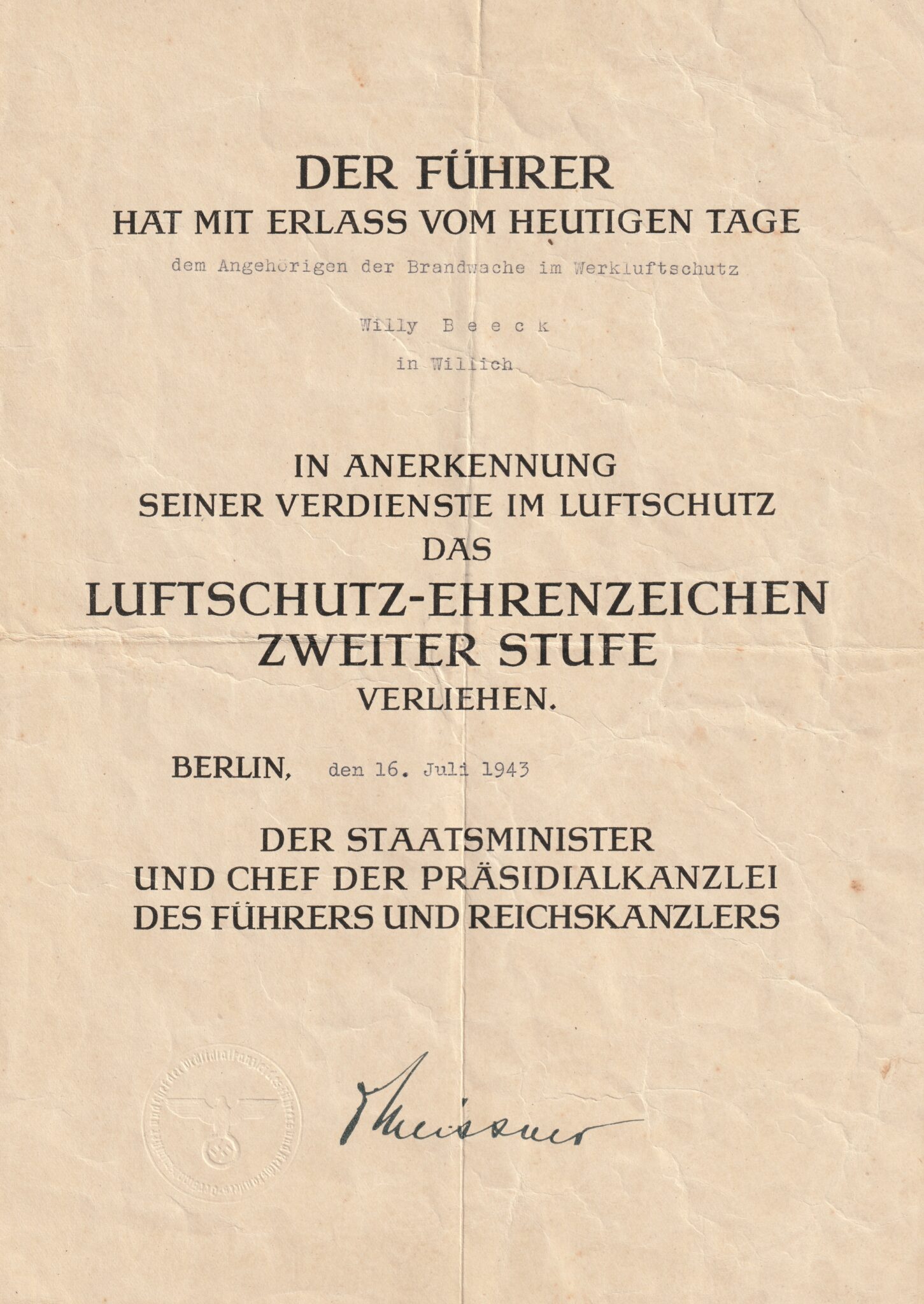 (Citation / Urkunde) Luftschutz Ehrenzeichen Zweiter Stufe (1943).