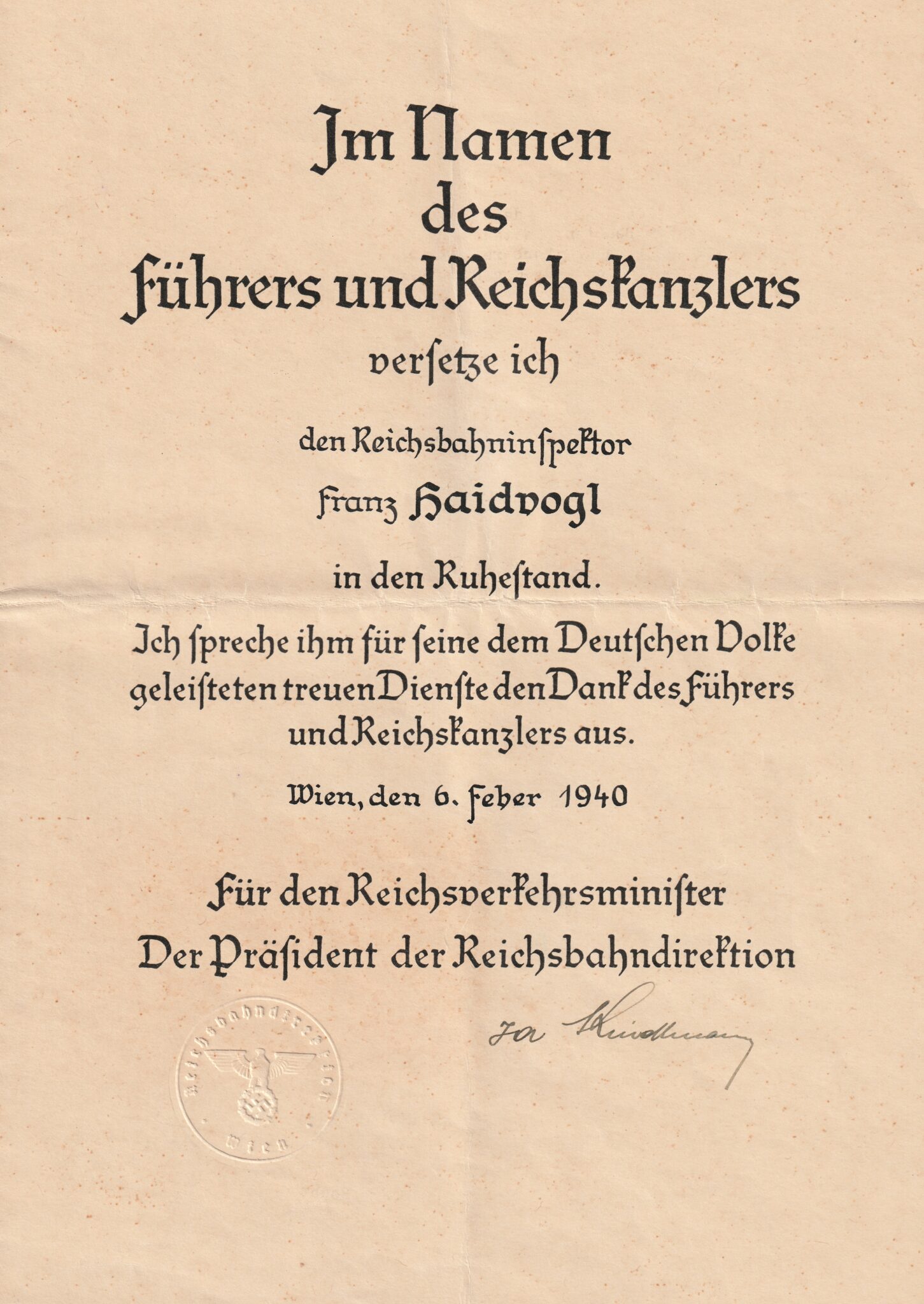 (Citation / Urkunde) Ruhestand / Retirement (1940).