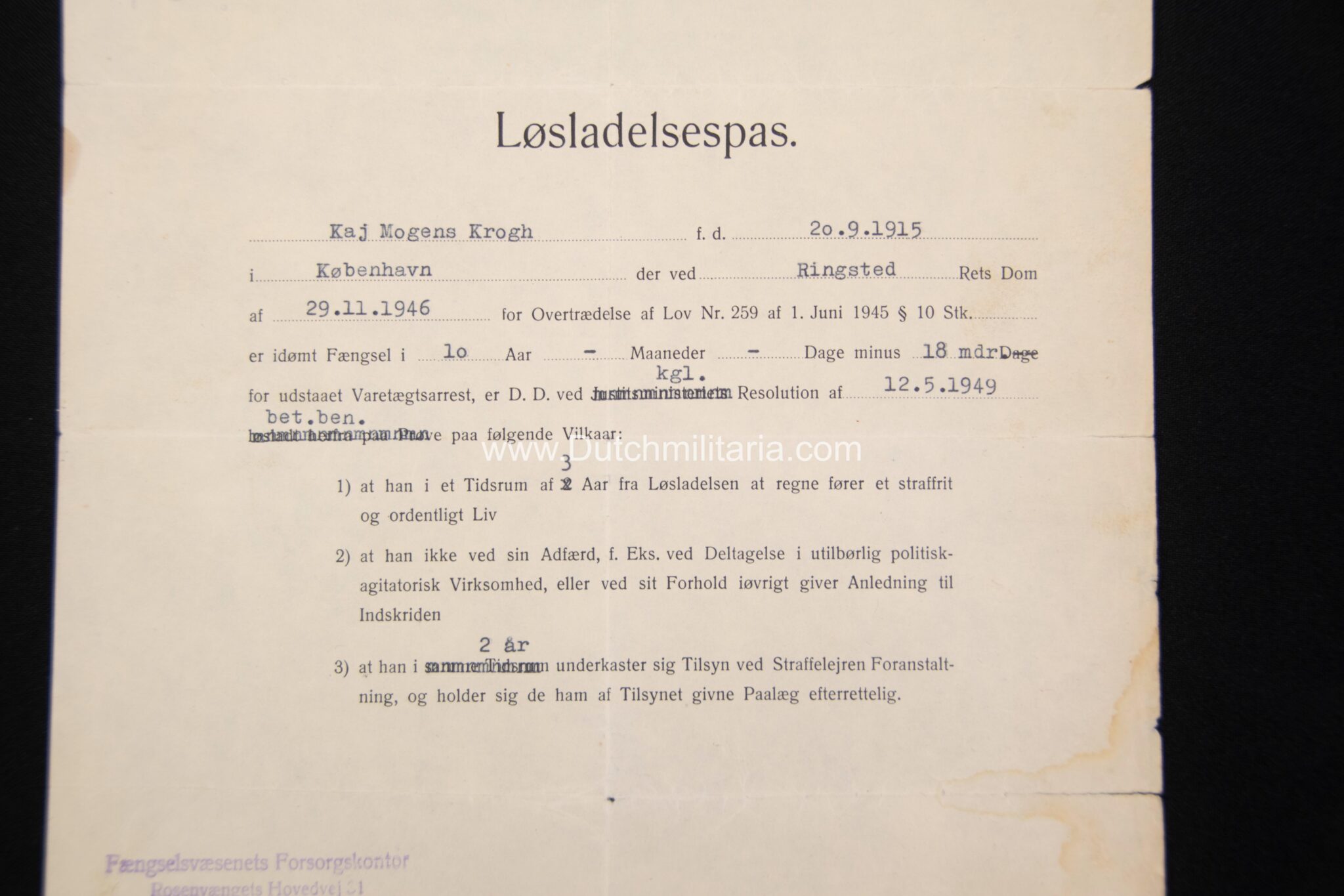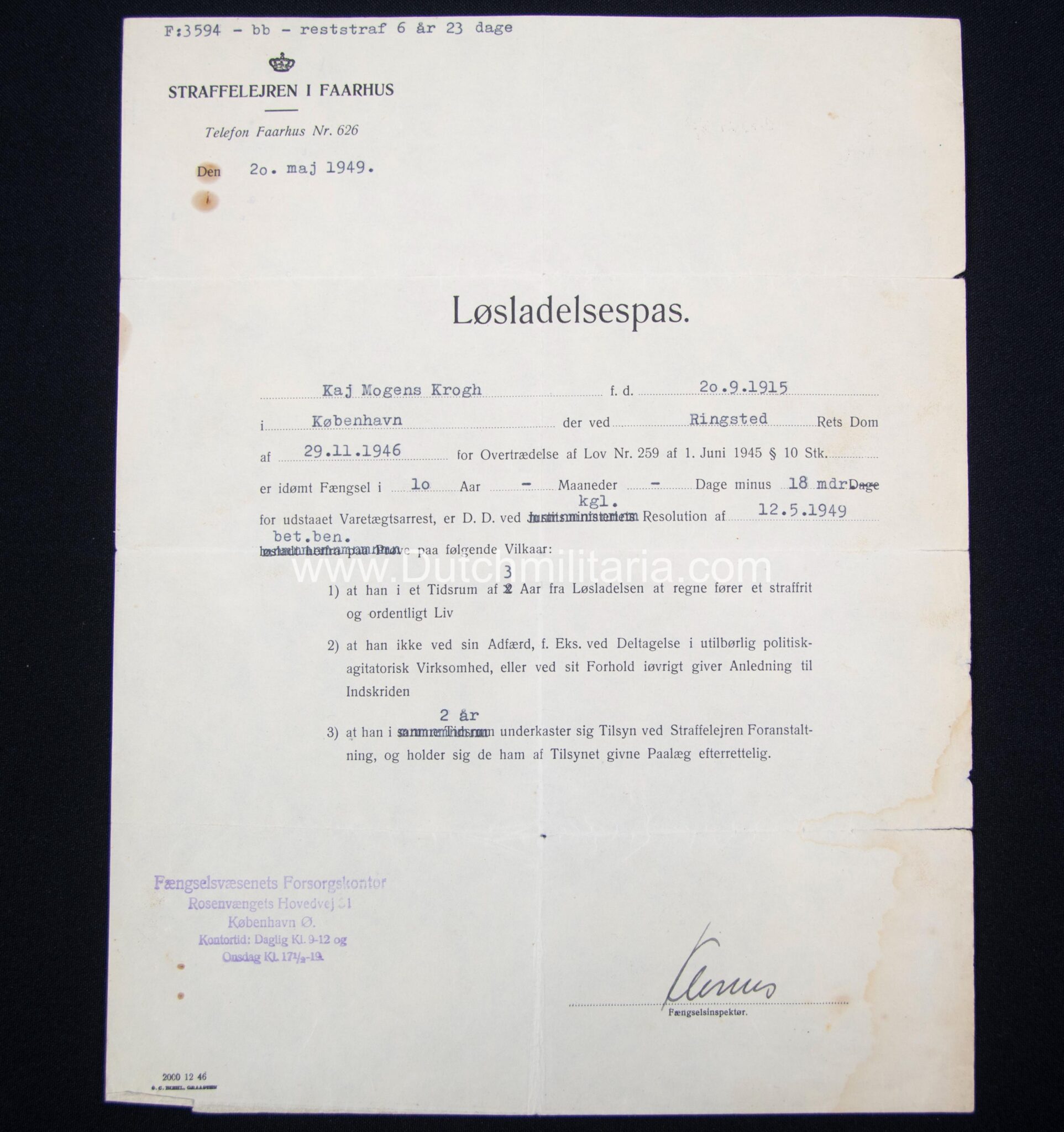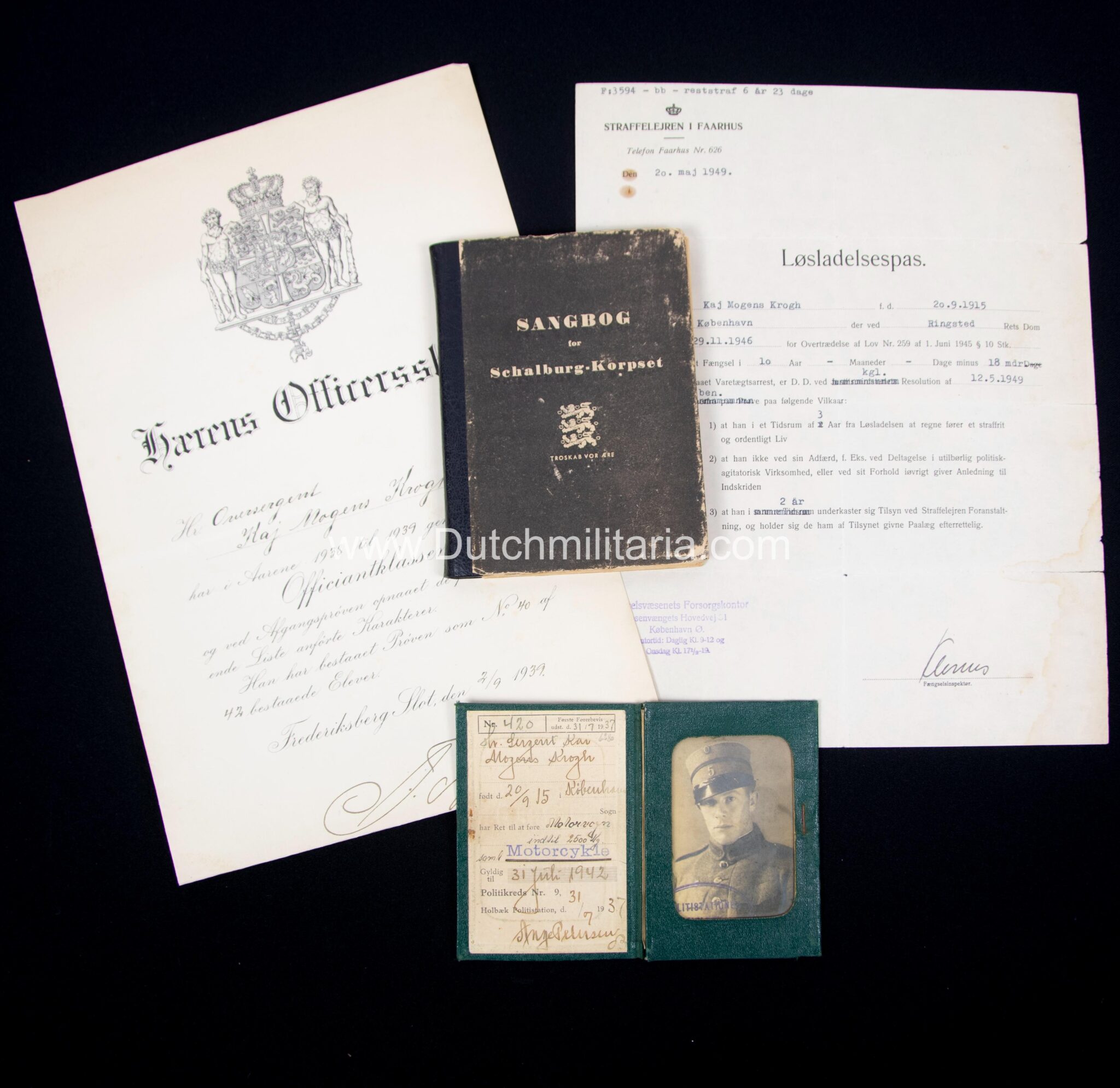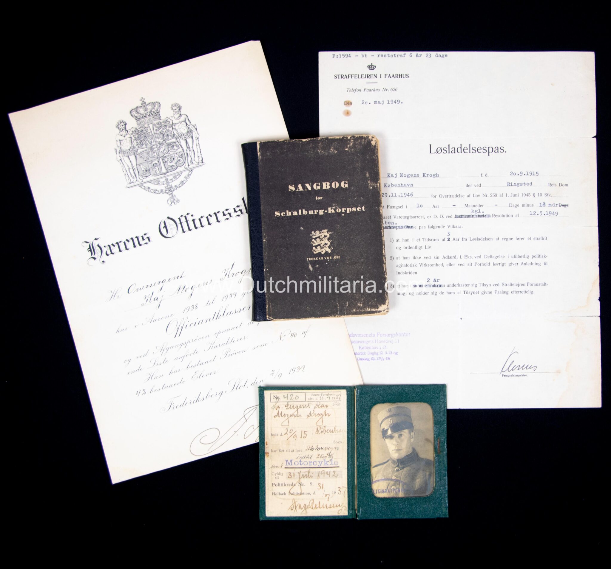 Krogh was at the end of the Second World War taken prisoner and released on 20 Mai 1949 from prison “Straffelejren i Faarhus”. He had at this point still a remaing prisontime of 6 year and 23 days to go. There is also a document from the Danish officersschool (pre-war) Krogh attended from 1938/1939, as well as his pre war military drivers licence (with photo in uniform), which states he was allowed to drive vehicles up to 2500 kilos.