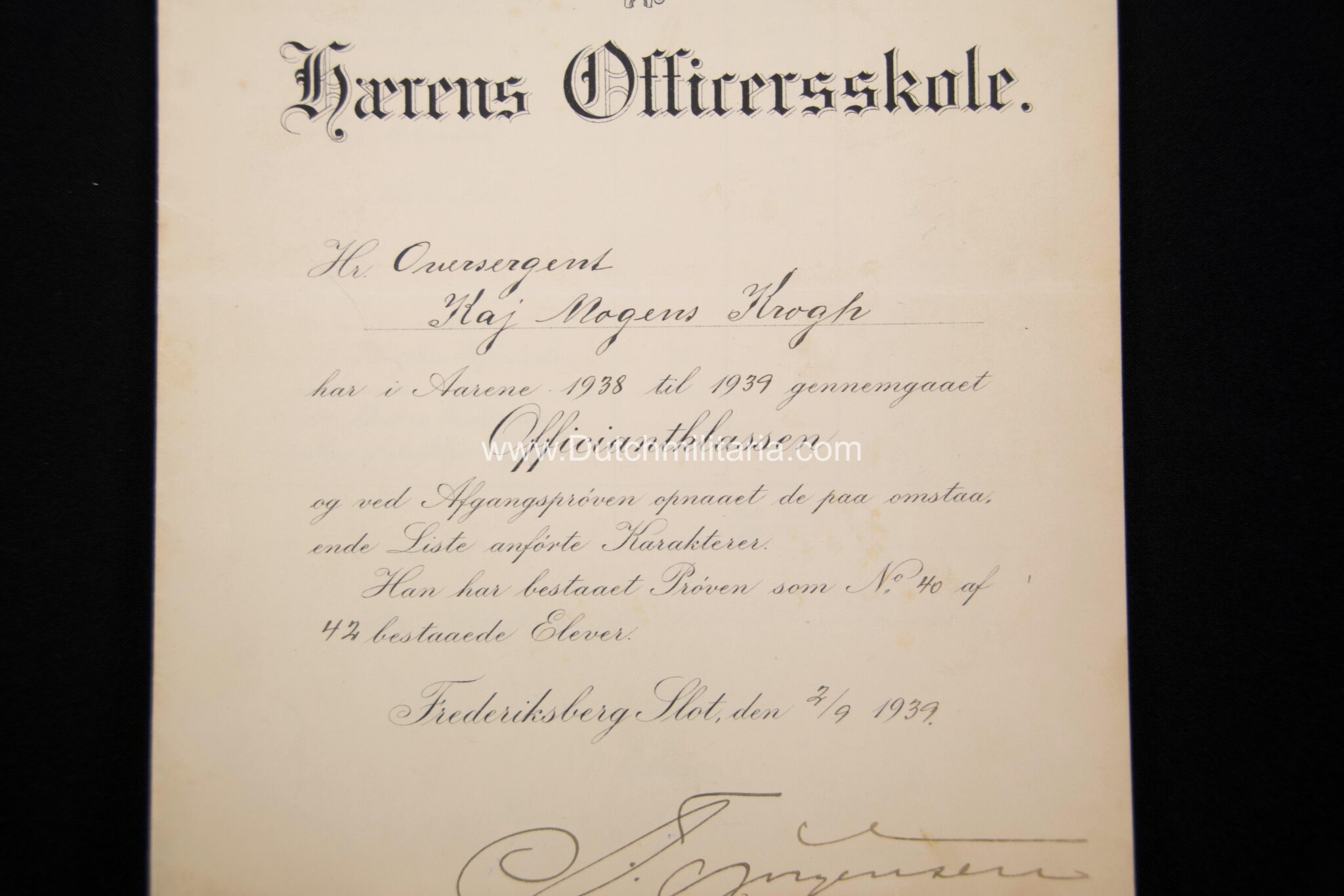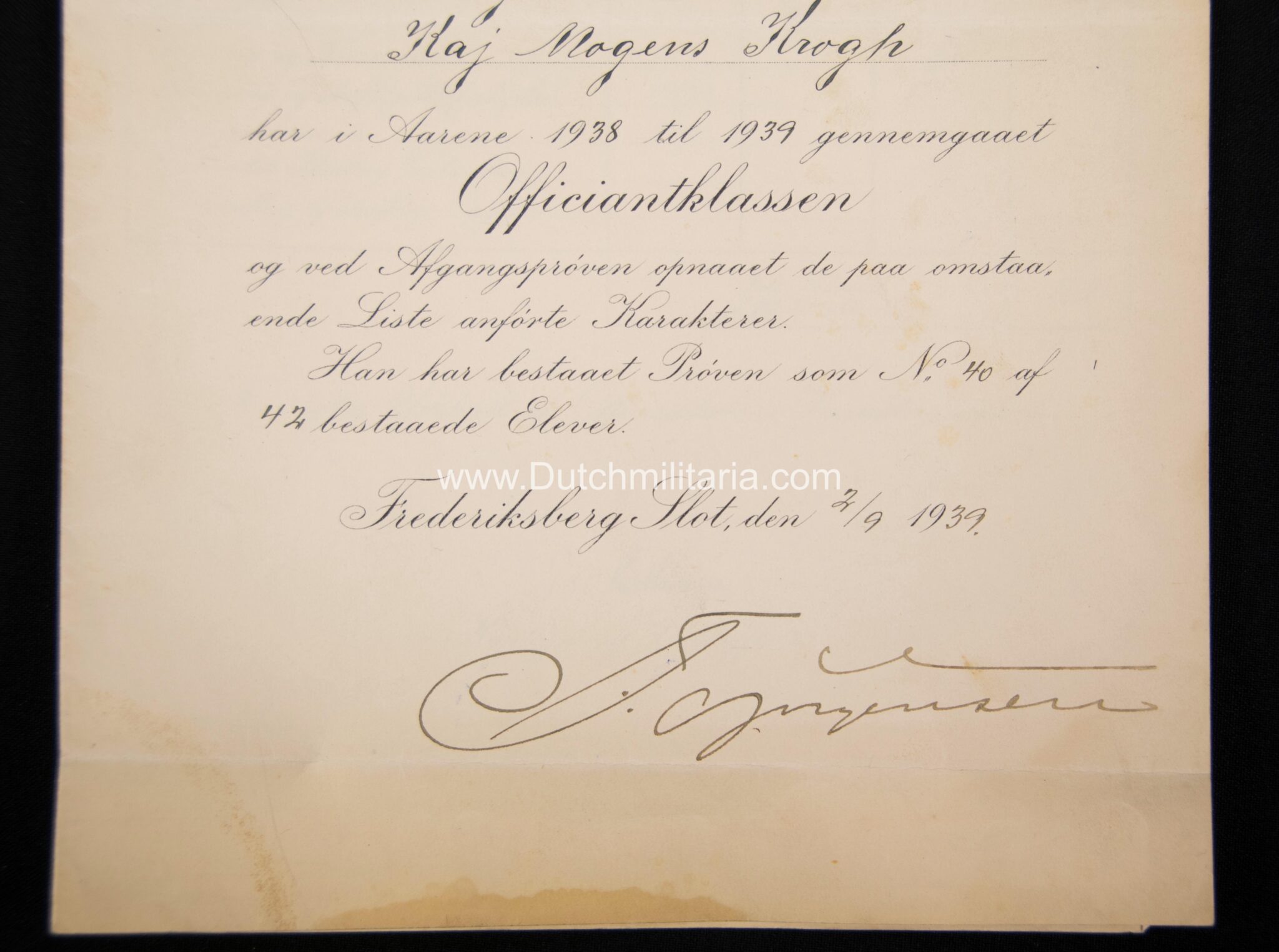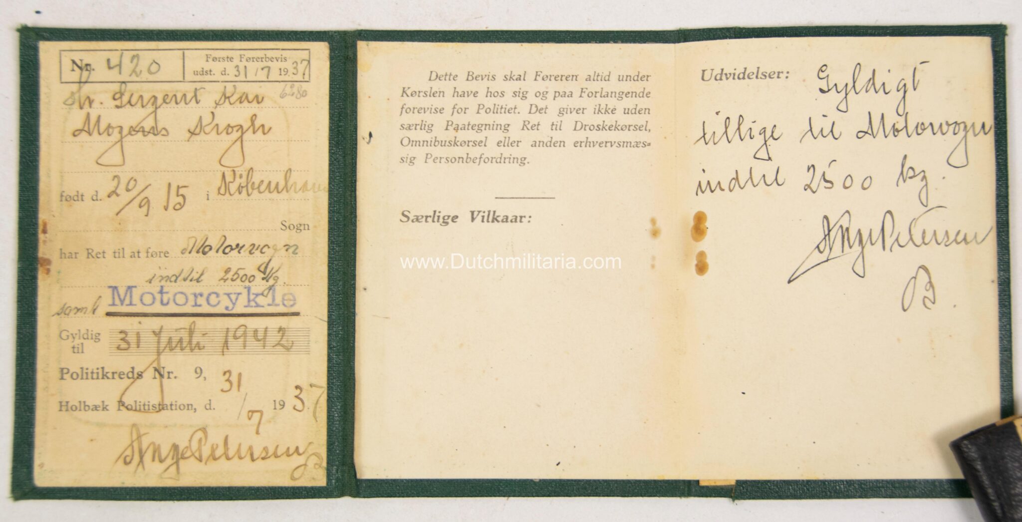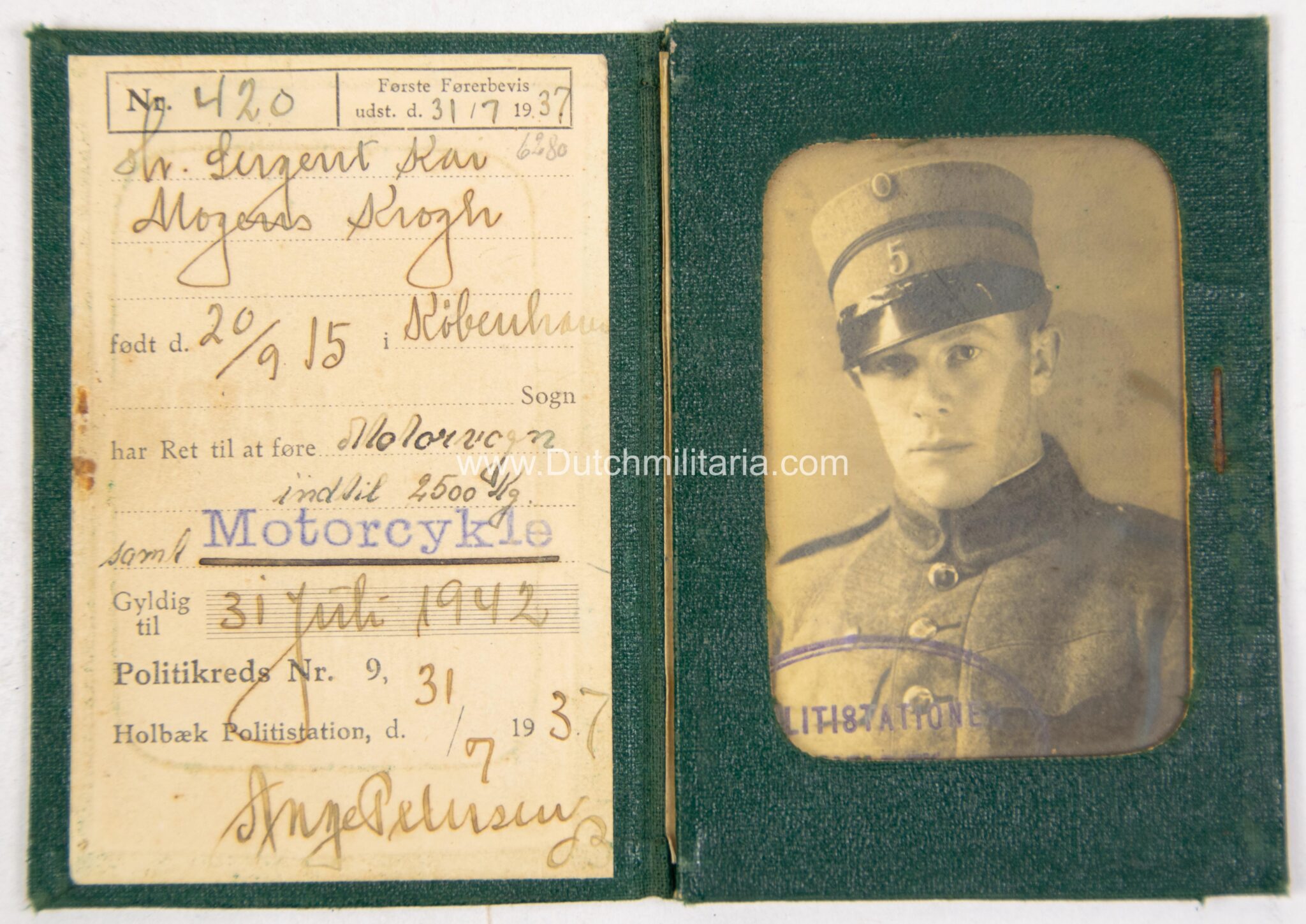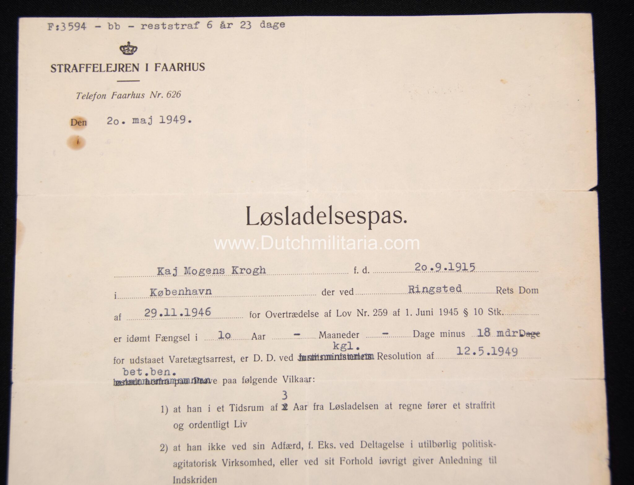 Krogh was at the end of the Second World War taken prisoner and released on 20 Mai 1949 from prison “Straffelejren i Faarhus”. He had at this point still a remaing prisontime of 6 year and 23 days to go. There is also a document from the Danish officersschool (pre-war) Krogh attended from 1938/1939, as well as his pre war military drivers licence (with photo in uniform), which states he was allowed to drive vehicles up to 2500 kilos.
