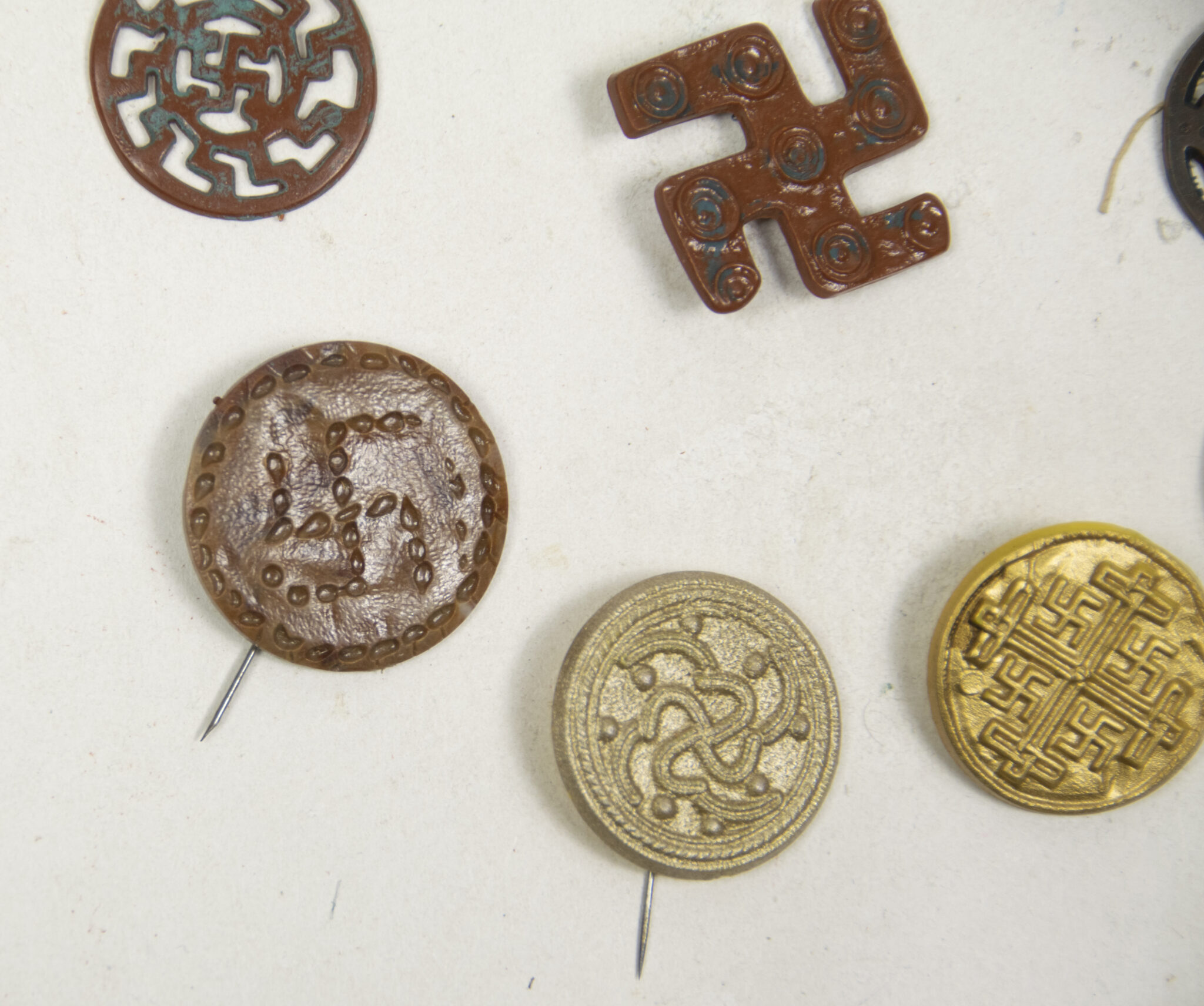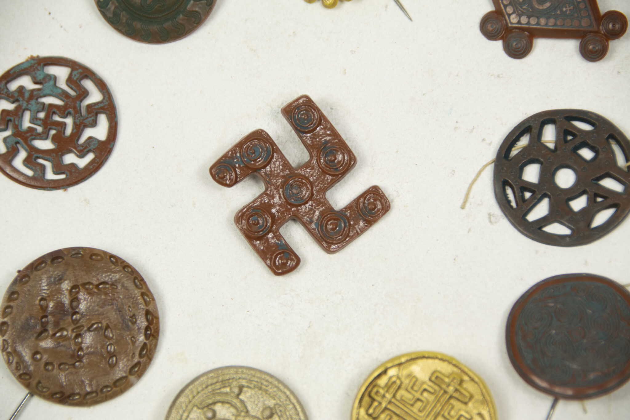 This is a complete series of ten badges of the German Winterhilfswerk (WHW). It is called the “Deutsche Kulturvölker” series, with all badges having German ancient/pagan sunwheel/swastika designs.