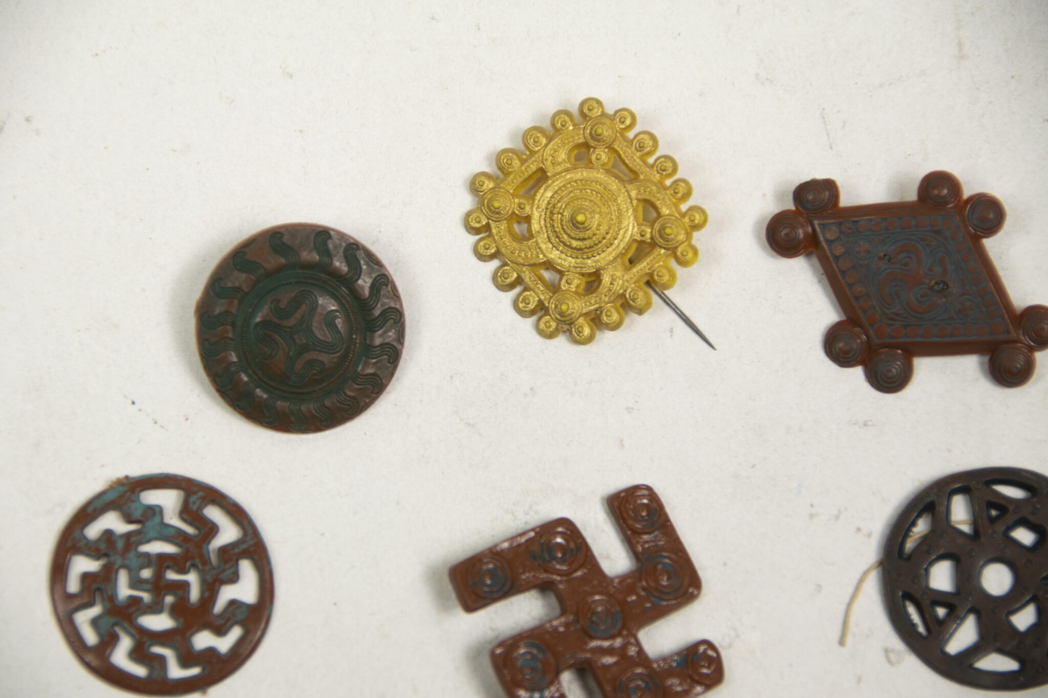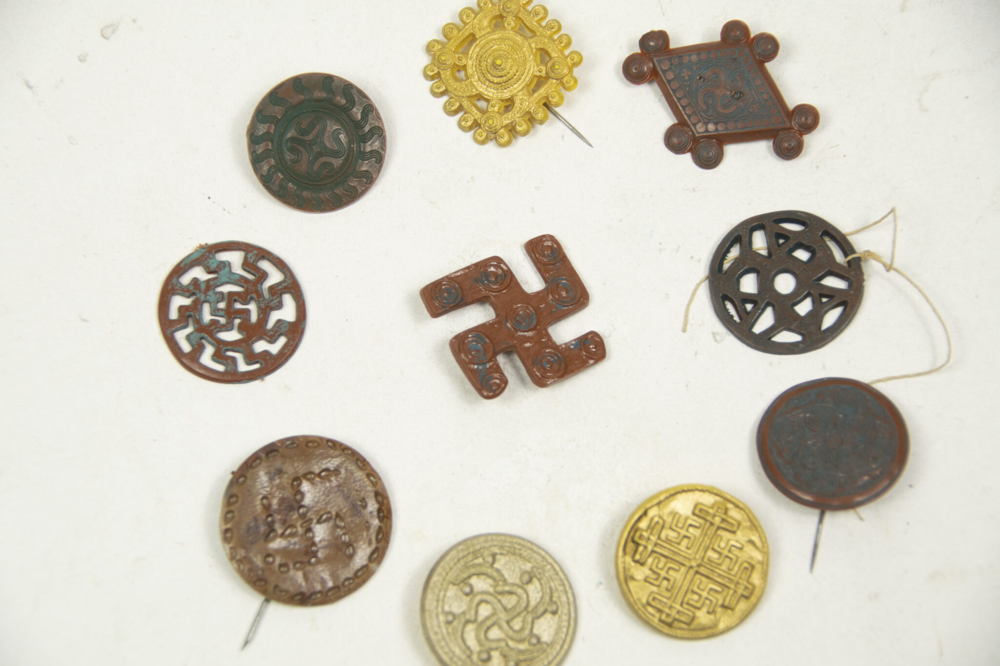 You are here: Home / WW2 German Badges and Memberpins / Deutsche Kulturvölker complete series 10 badges ancient German sunwheel / swastika designs