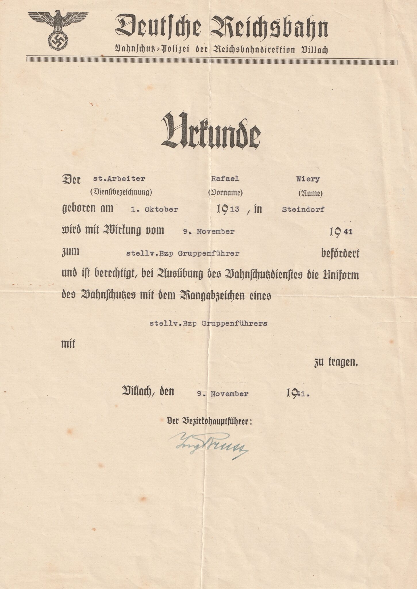 Deutsche Reichsbahn Urkunde (1941). For grating the member to wear the uniform of the Rechsbahn Stellvertreter bzp. Gruppenführer.