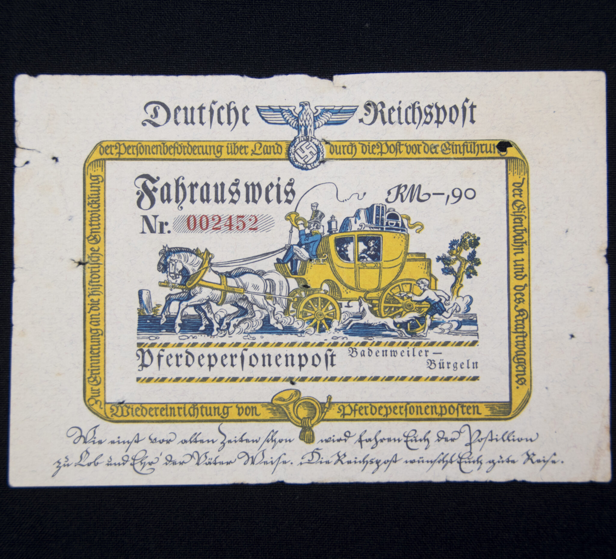 Deutsche Reichspost Fahrausweis Pferdepersonenpost.