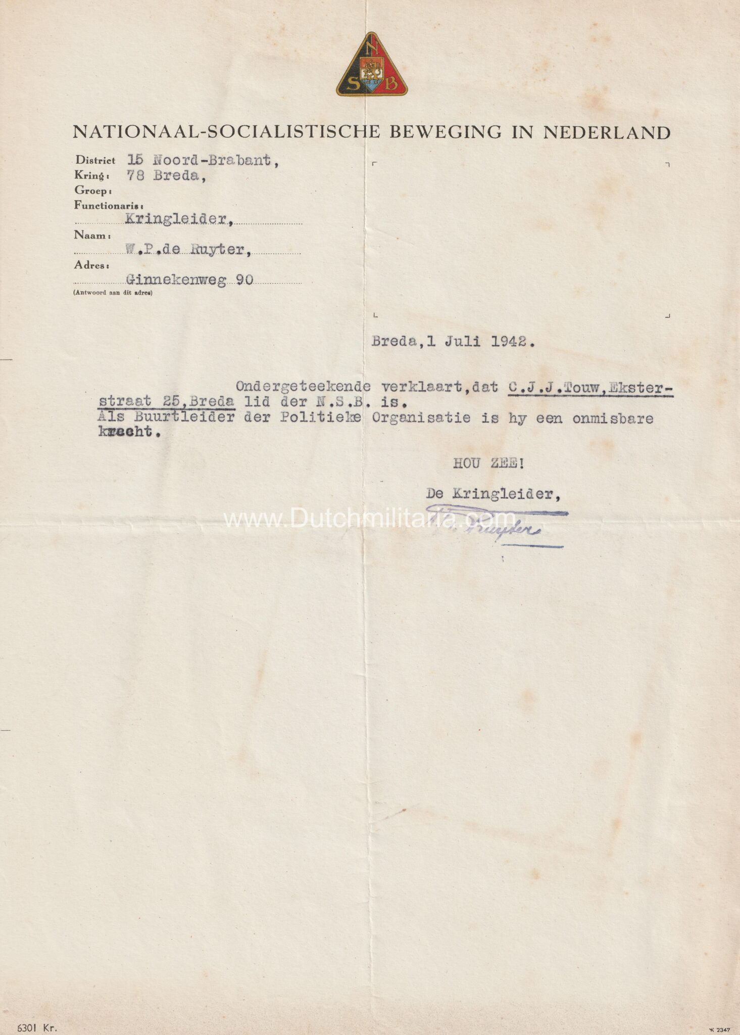 (Document) NSB Nationaal Socialistische Beweging in Nederland – Kring Breda (1942)