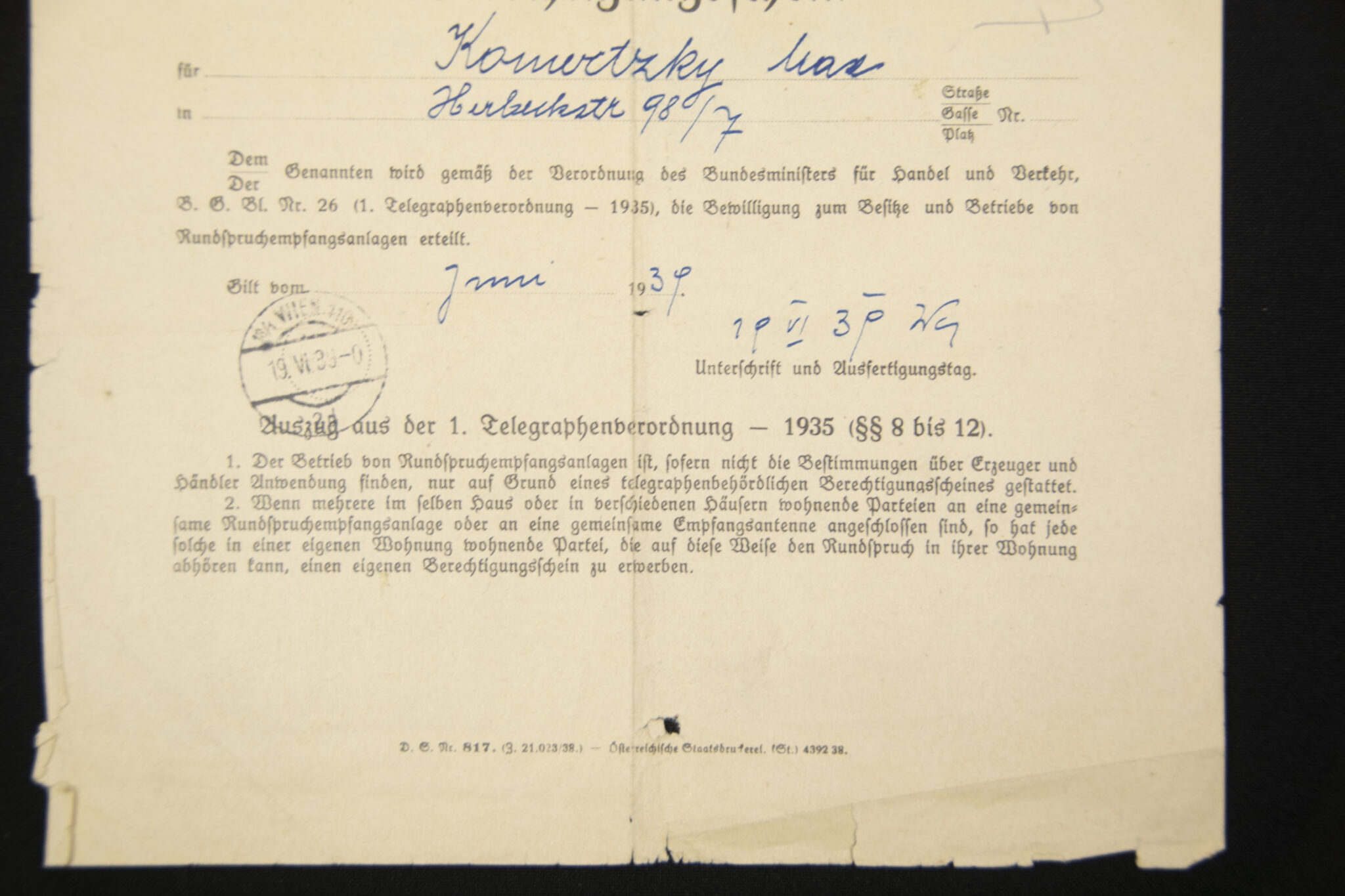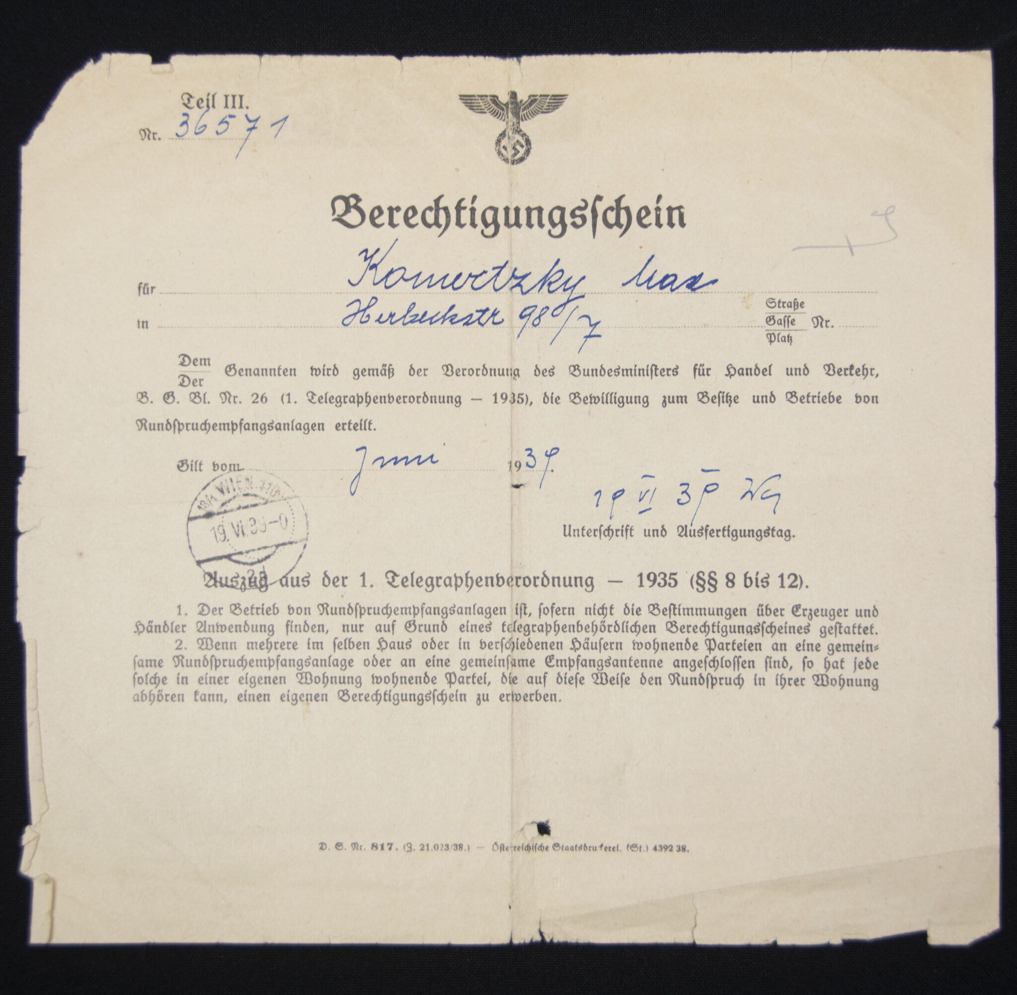 Category: Passes, Documents and Citations Tag: (Document) NSDAP Berechtigungsschein Rundfunkempfangsanlagen (1939)