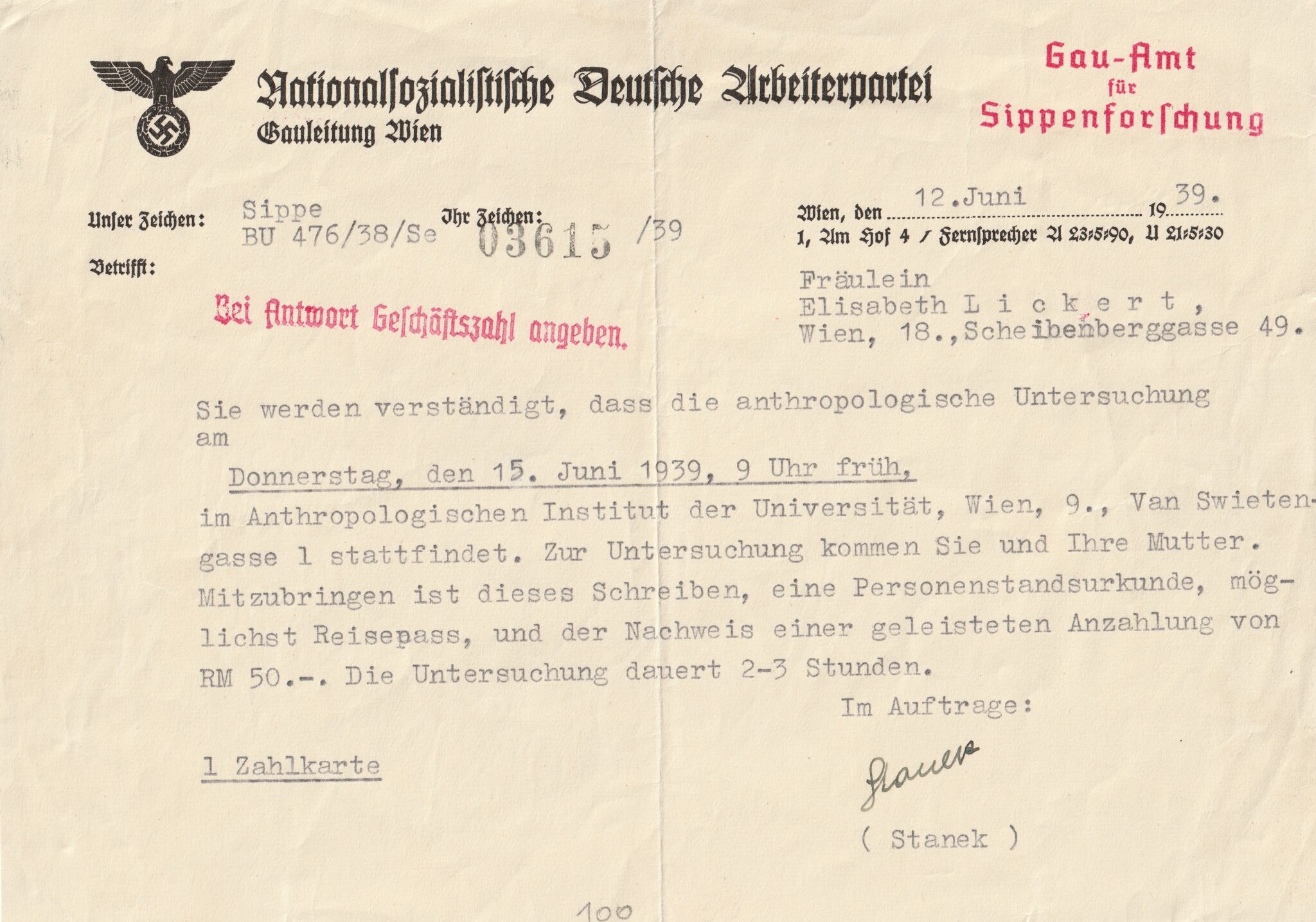 (Document) NSDAP Gauleitung Wien – Anthorpologische Untersuchung (1939).