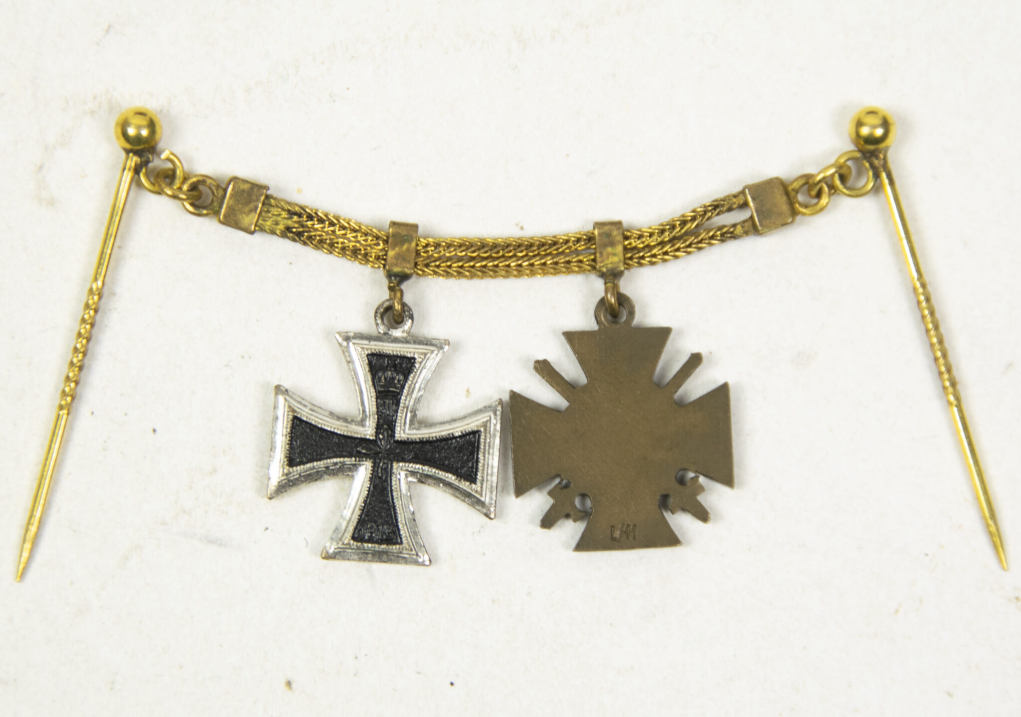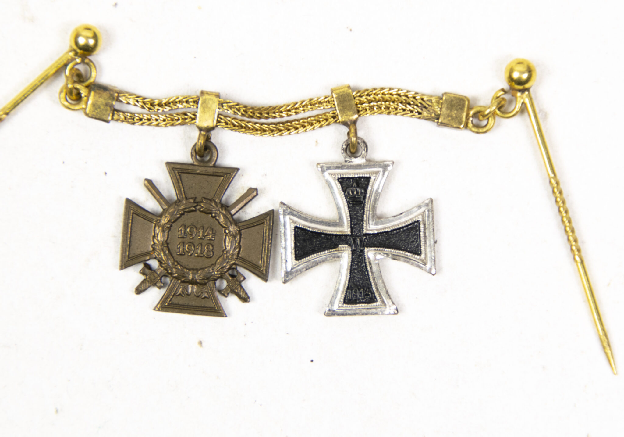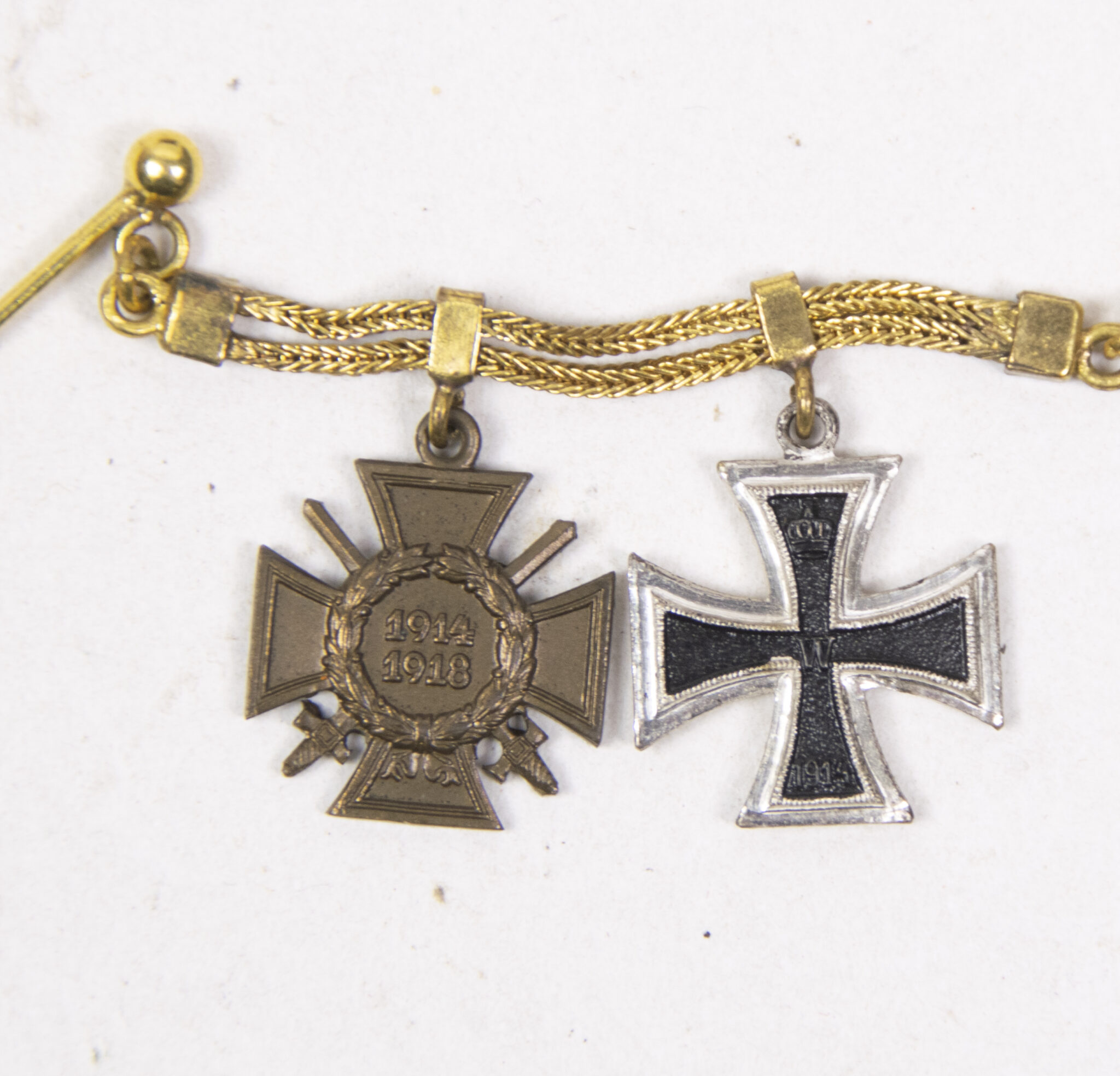 German World War I Frackkette mini medals with Iron Cross second class (Ek2) + Frontkämpfer Ehrenkreuz.