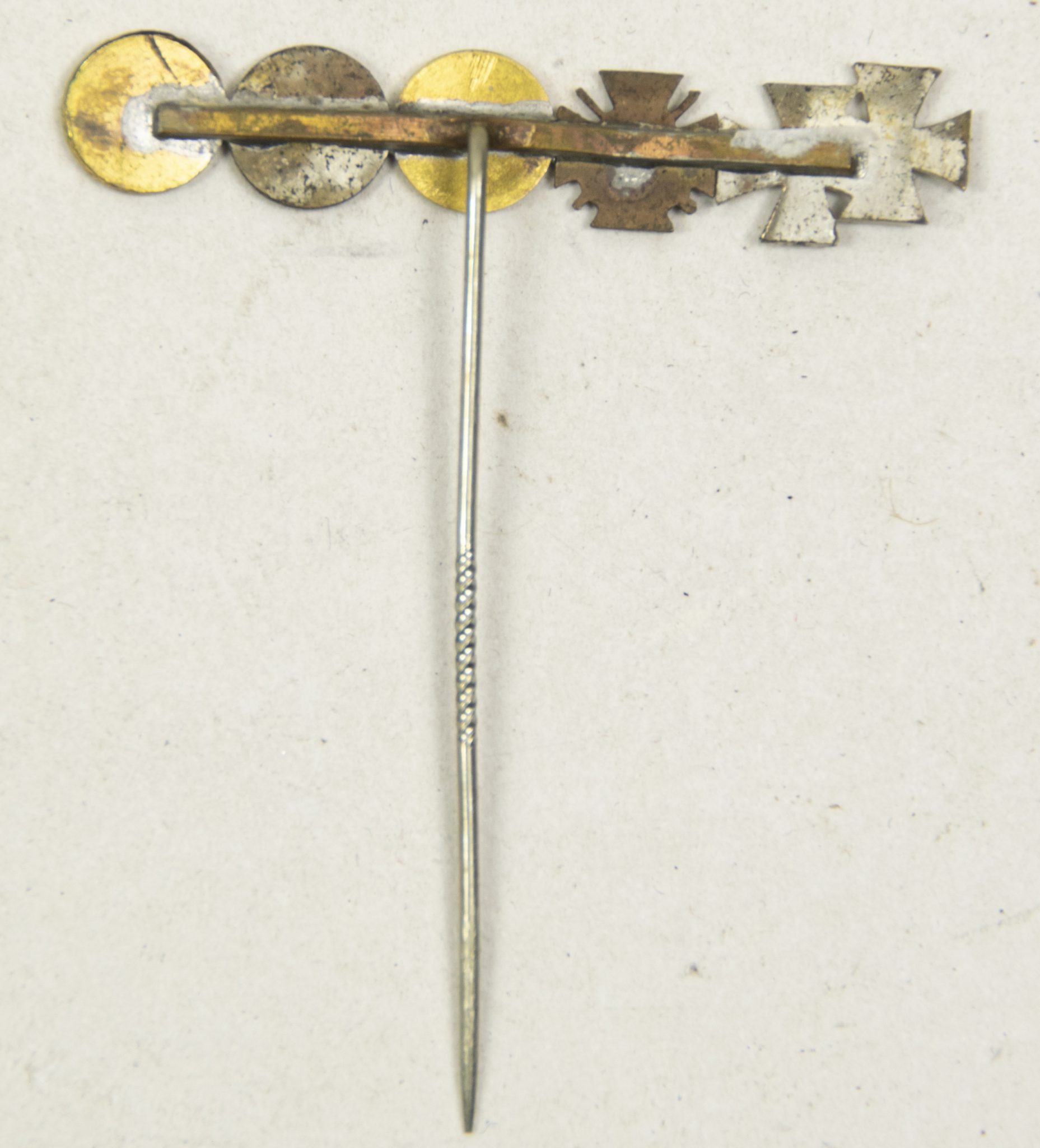 German WWI lapel stickpin with Ek1 + EK2 + Frontkämpfer Ehrenkreuz + Treue Dienste + Hungarian + Bulgarian commemorative medals.
