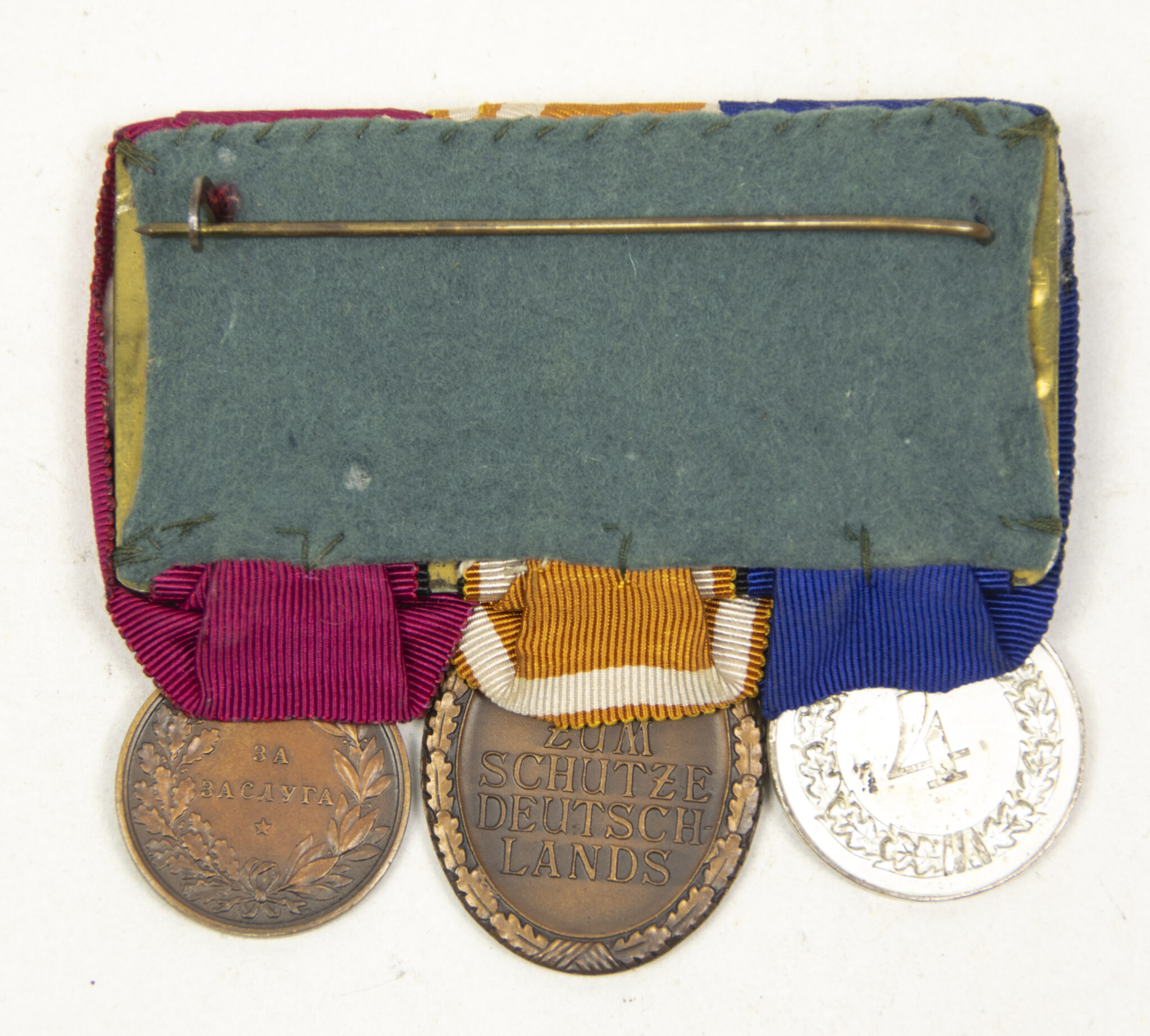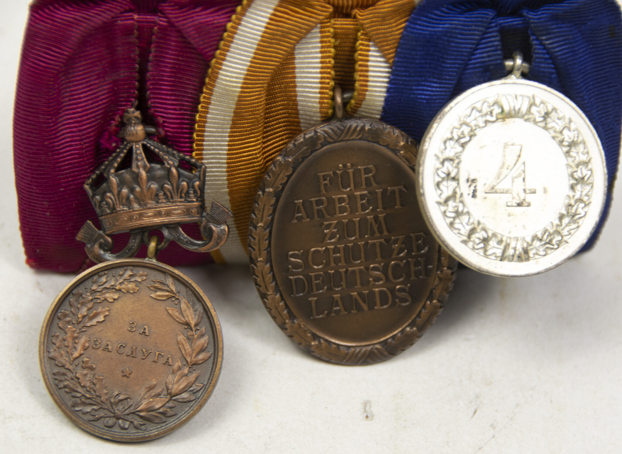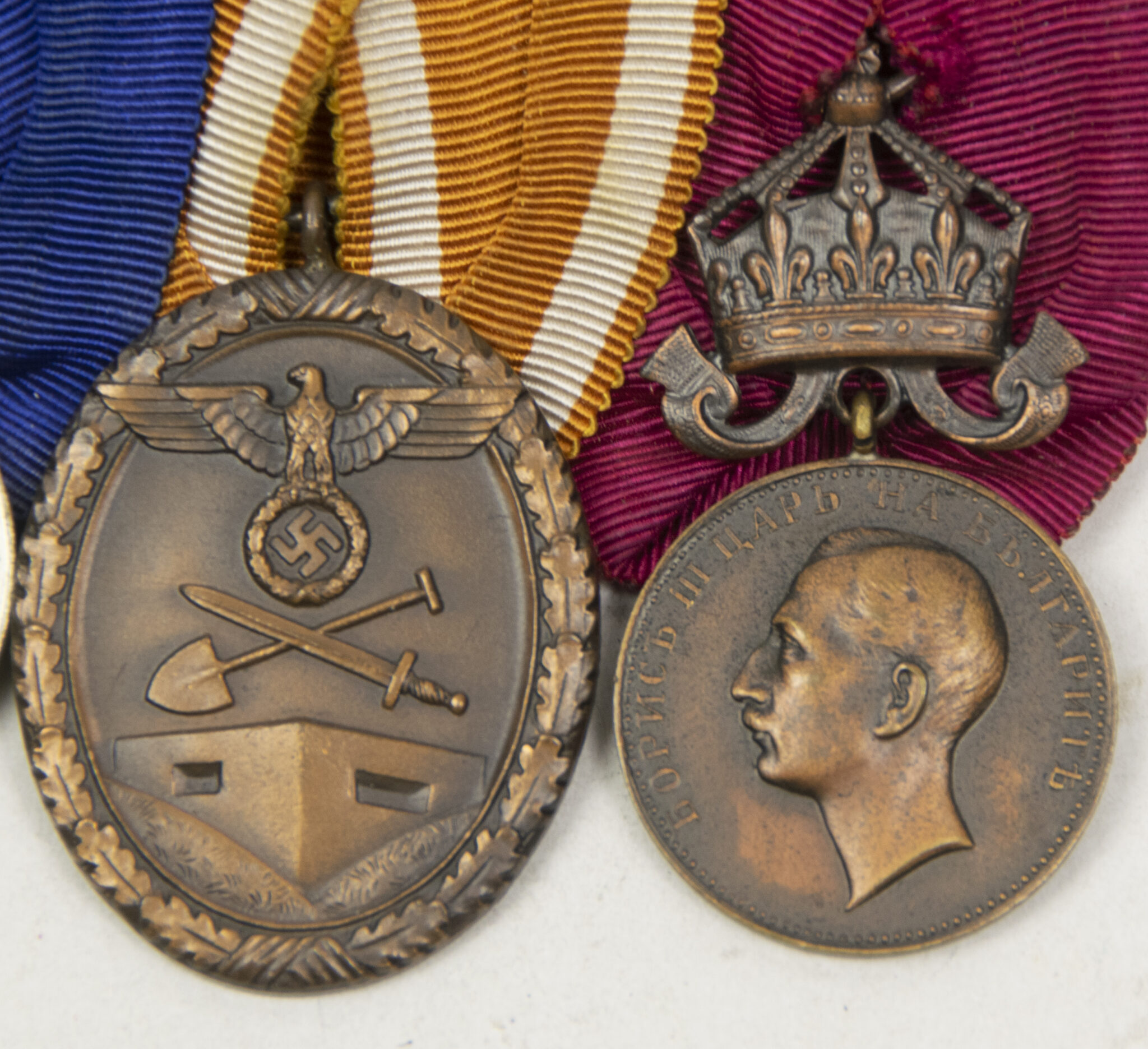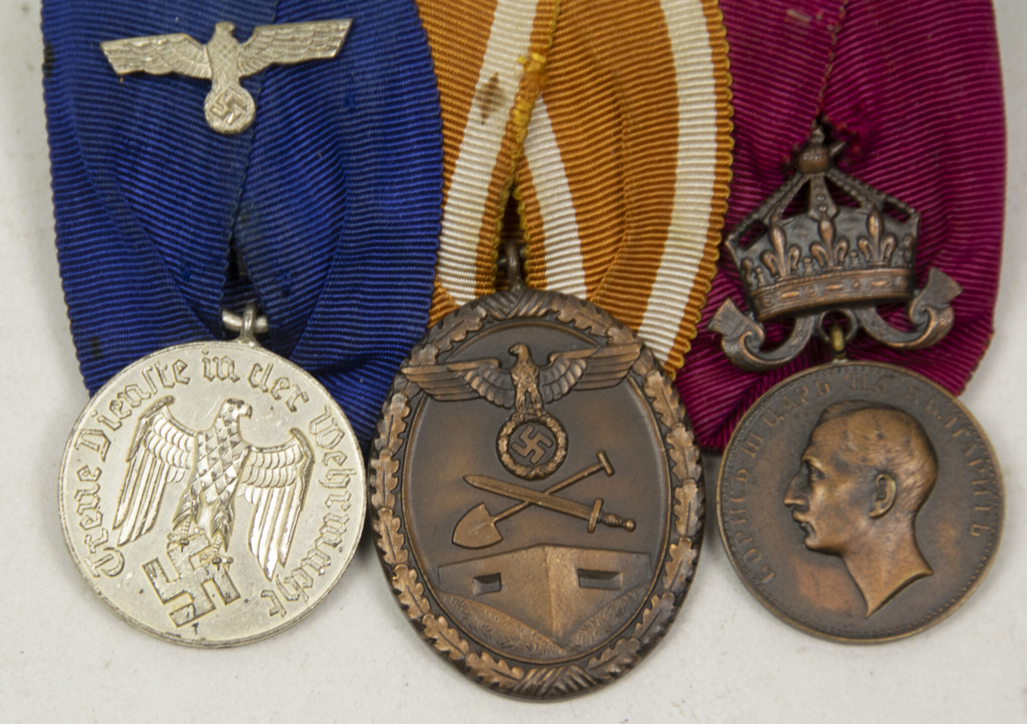This is a WWII Medalbar with Wehrmacht (Heer) Dienstauszeichnung 4 Jahre + Westwall medal + Bulgarian WW1 Royal Medal of Merit Bronze 3rd Class with Crown King Ferdinand 1908-1918.