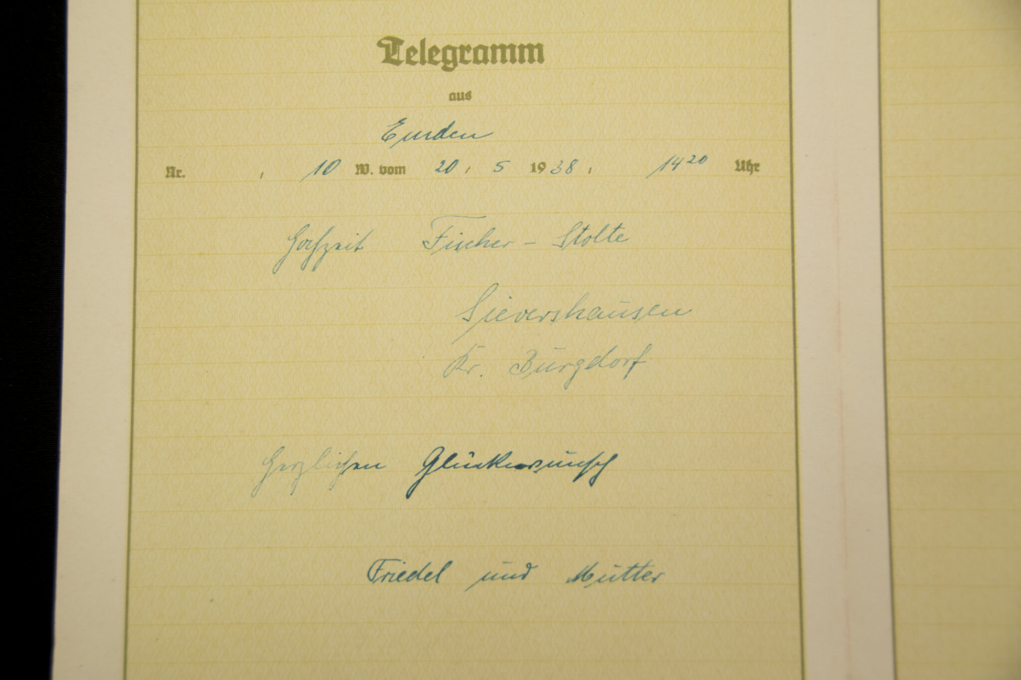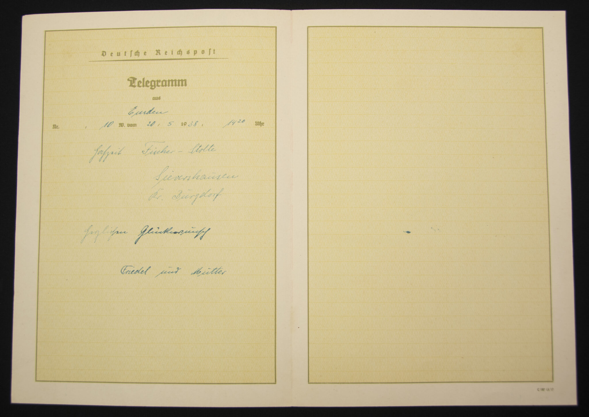 German WWII Telegram from Emden to Sievershausen (1938).