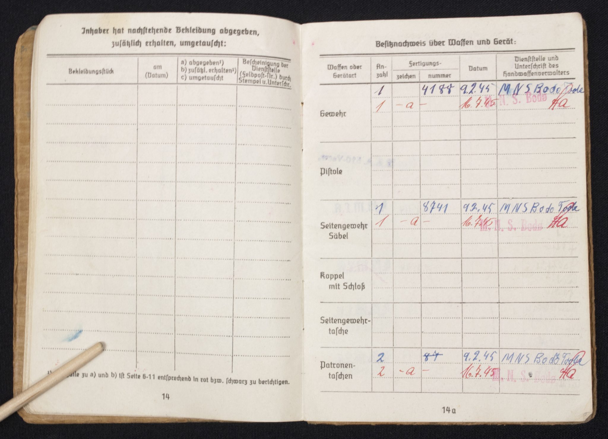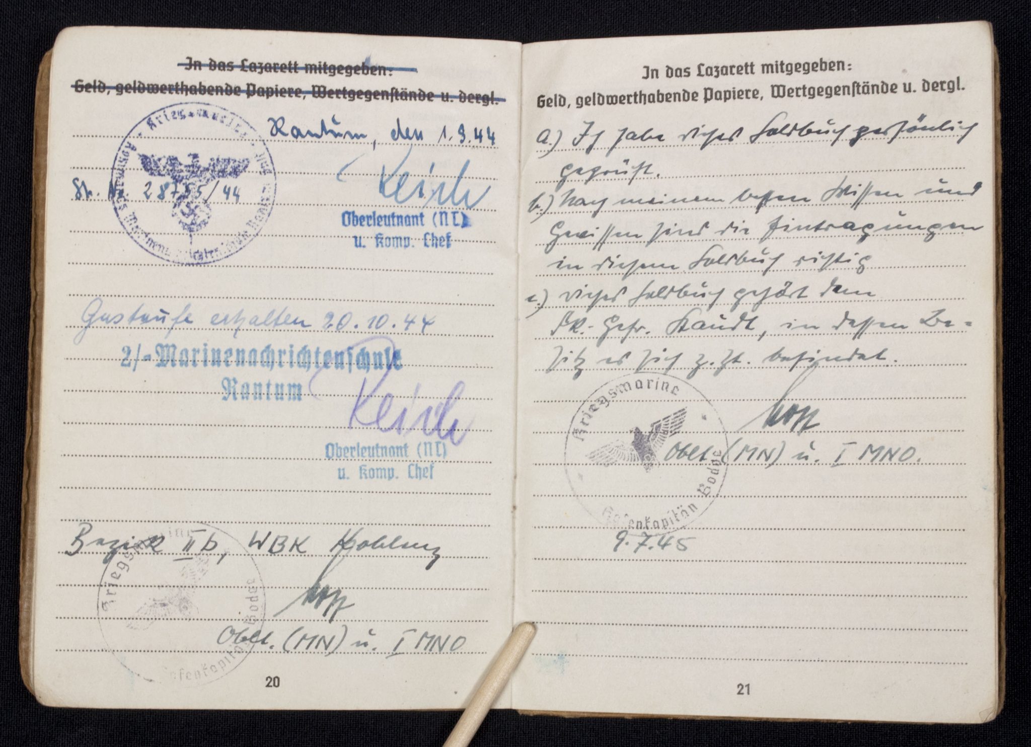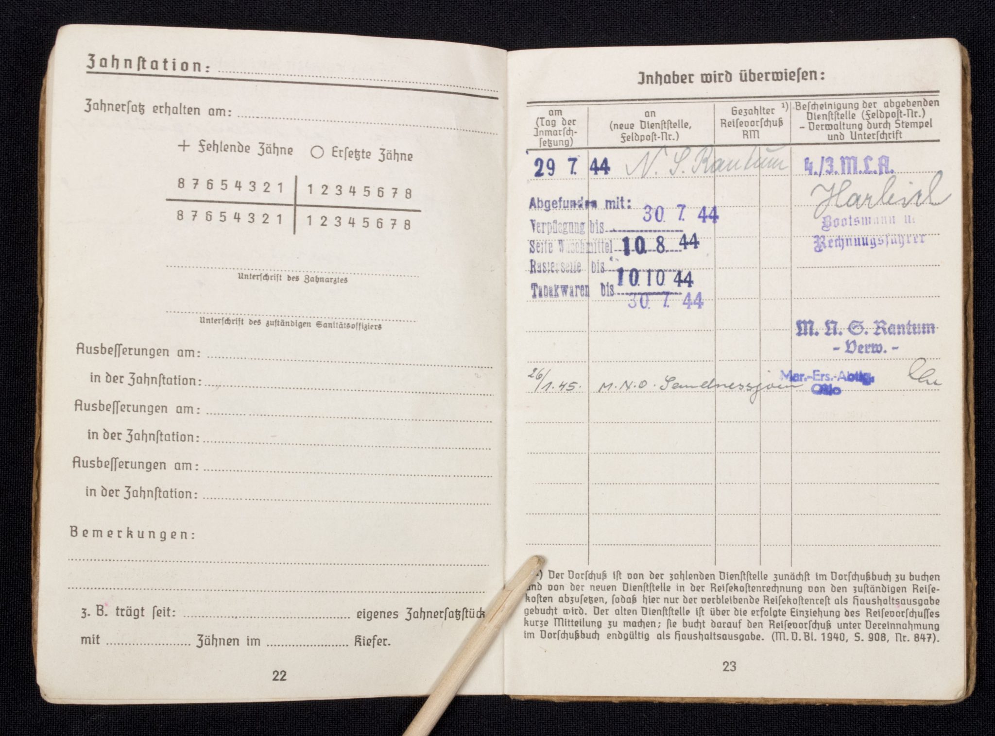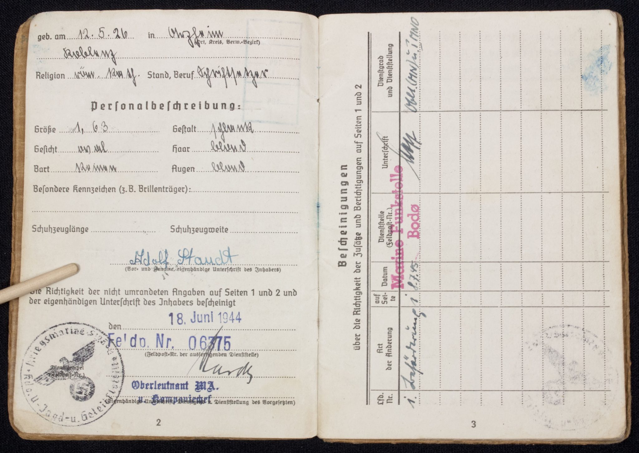 Kriegsmarine (KM) Soldbuch, opened 18 June 1944. Marine Funkstelle Bodo.