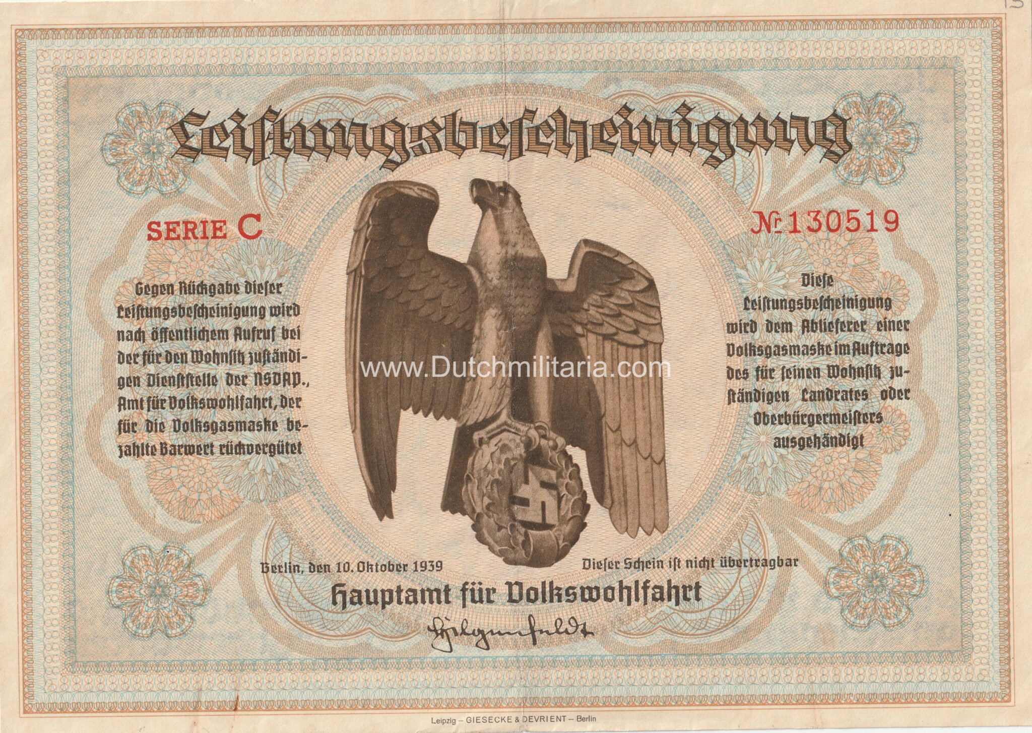 Leistungsbescheinigung Hauptamt für Volkswohlfahrt (1939) – rare.