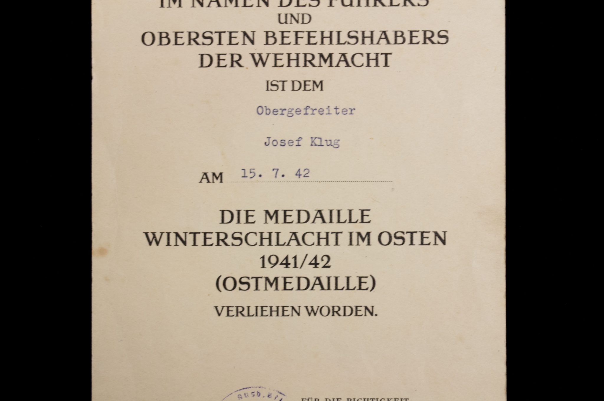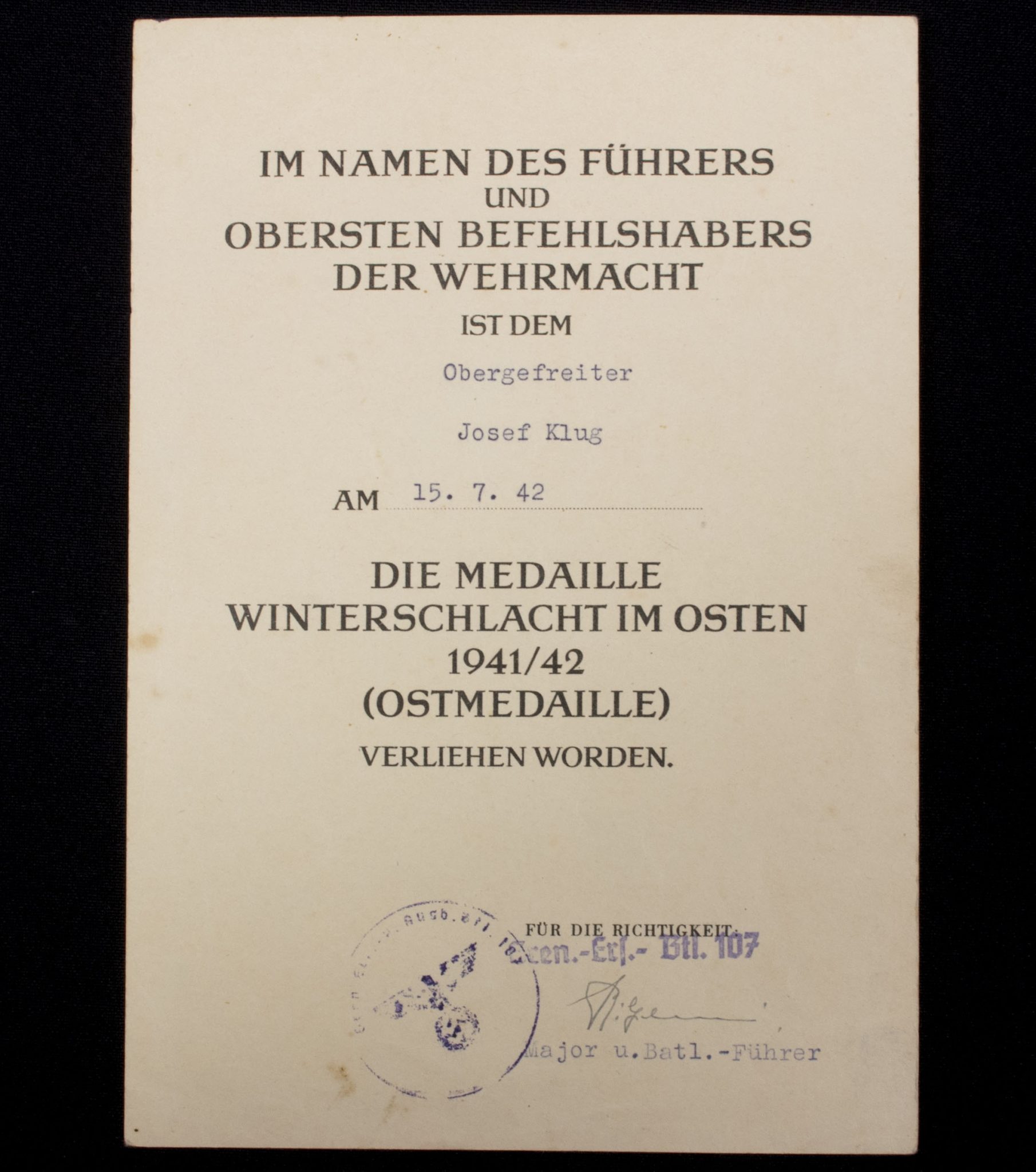Awarded to Obergefreiten Josef Klugg on 15 July 1942.