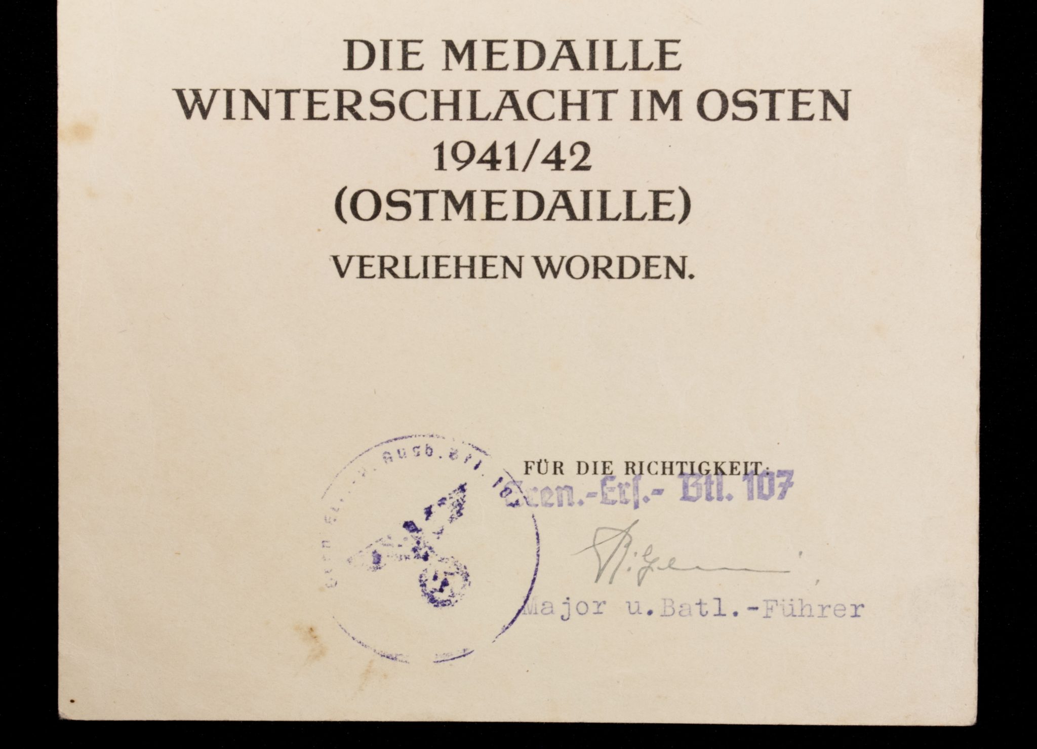 Medaille Winterschlacht im Osten / Ostmedaille Urkunde Gren.-Ers.-Btl.107 (1942).