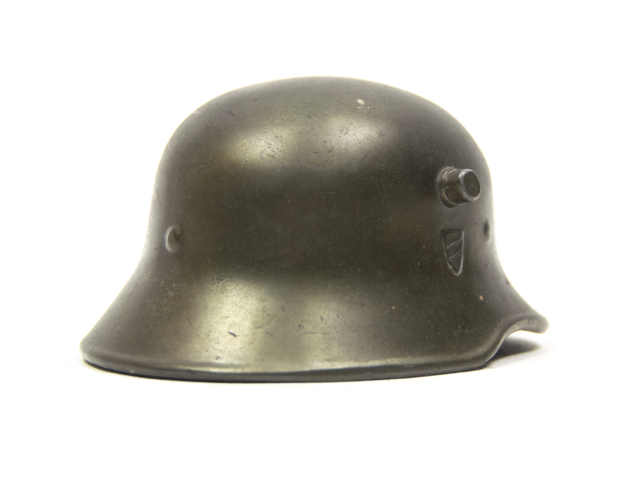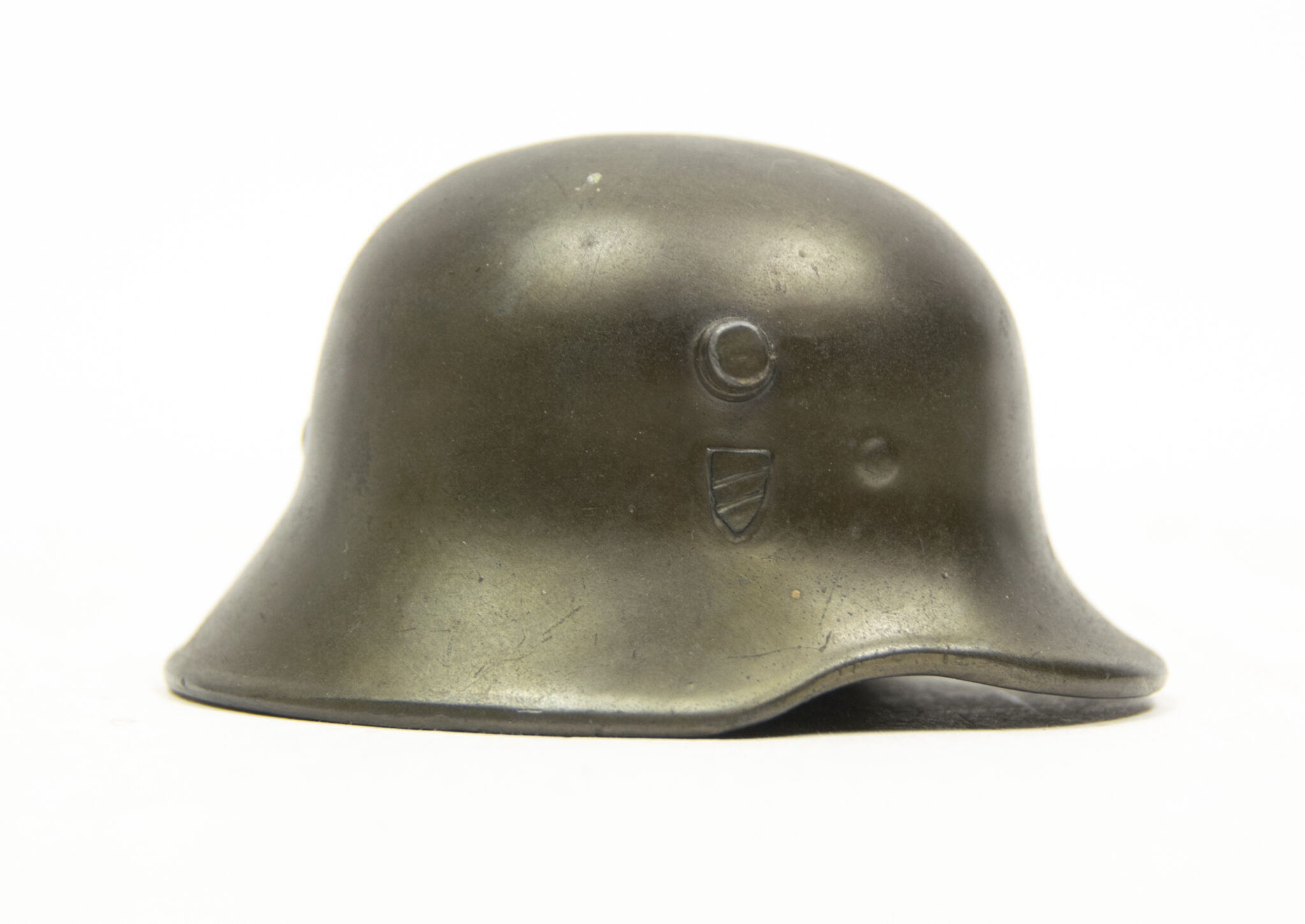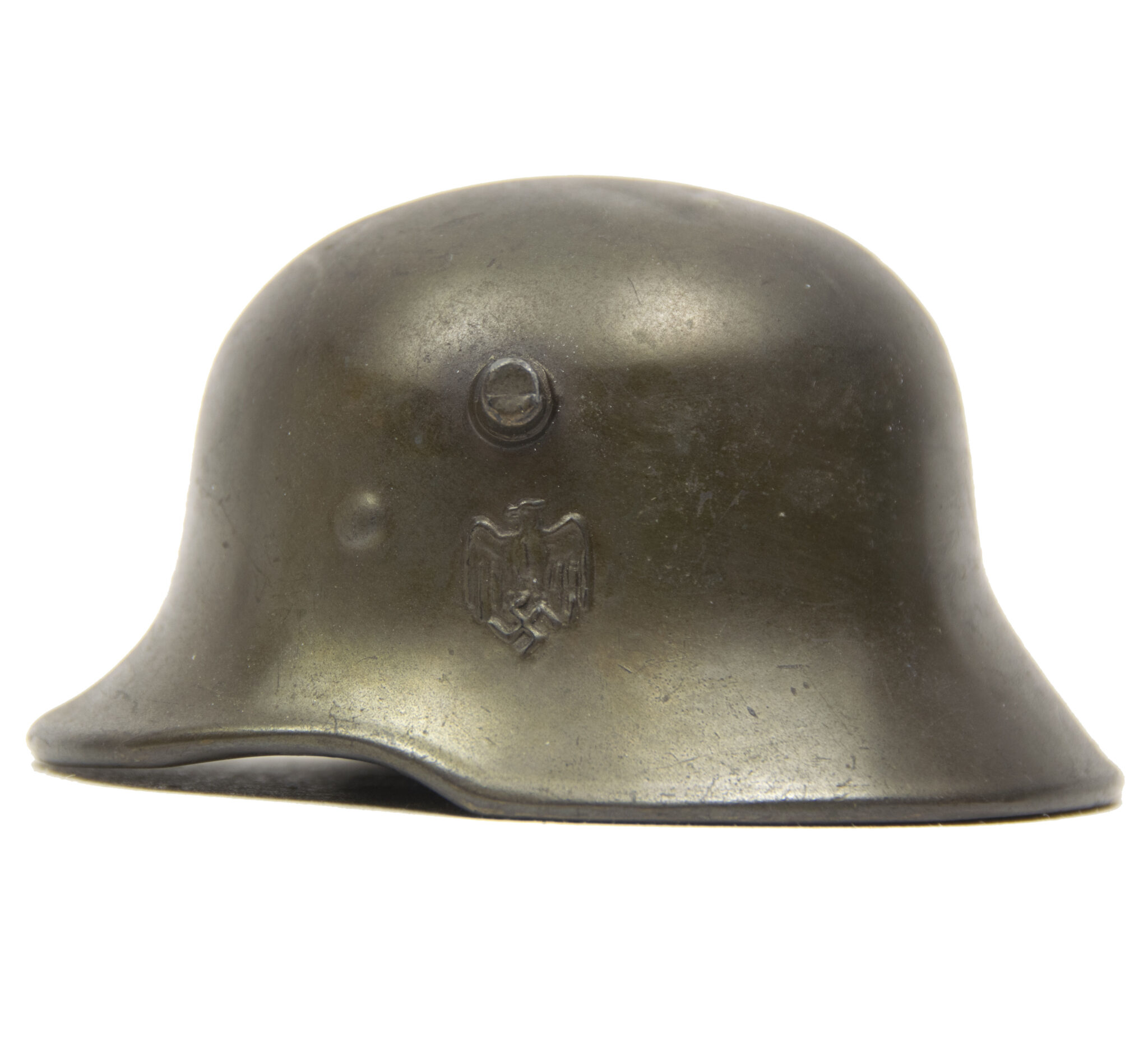 It is in good condition and was probably once intended to be used as a desc ornament. While it is as can be seen by the airvents clearly a World War I helmet model, there is an eagle with swastika on one side and a decal on the obverse, this in line with the at the time of the Third Reich period refurbished german Great War helmets.