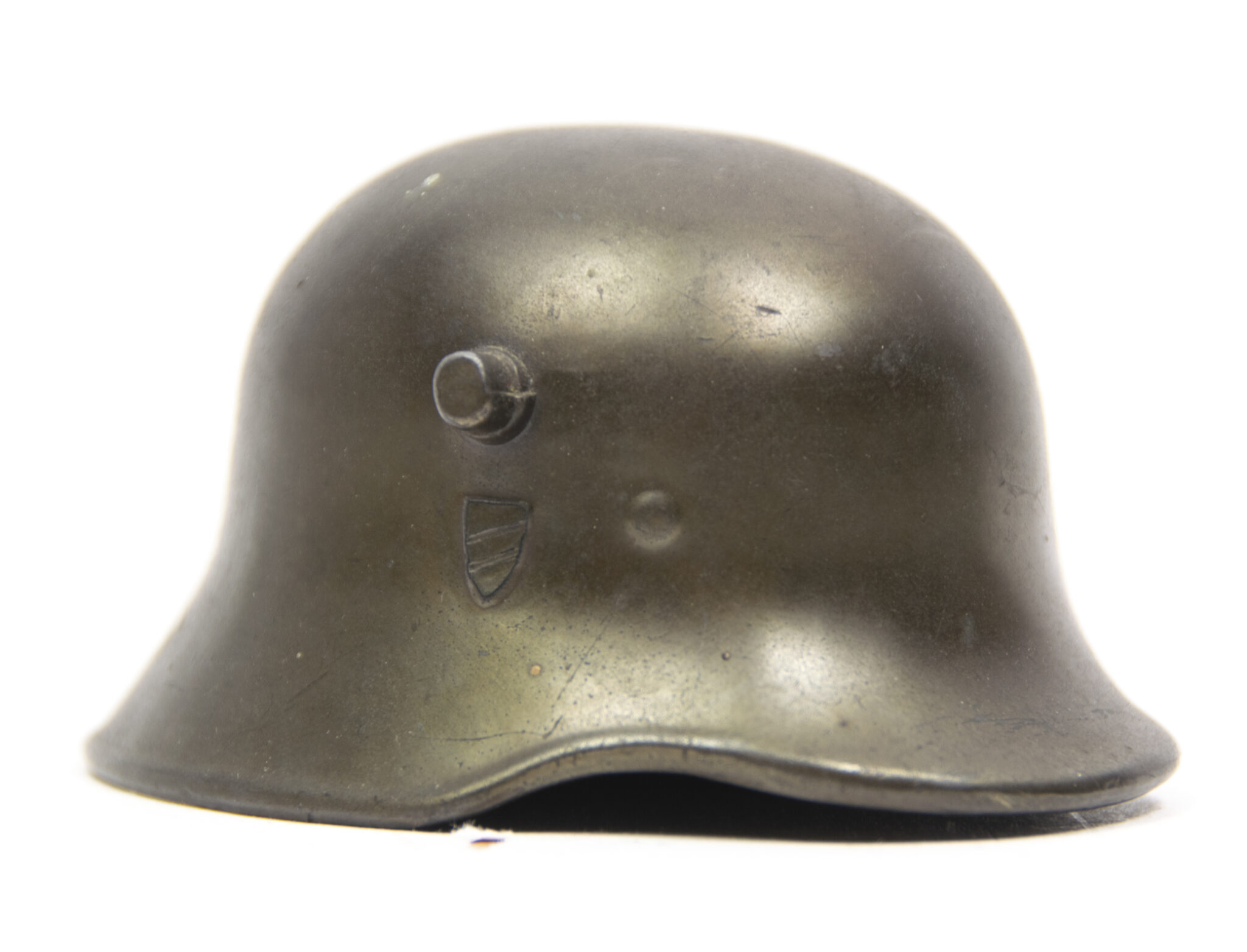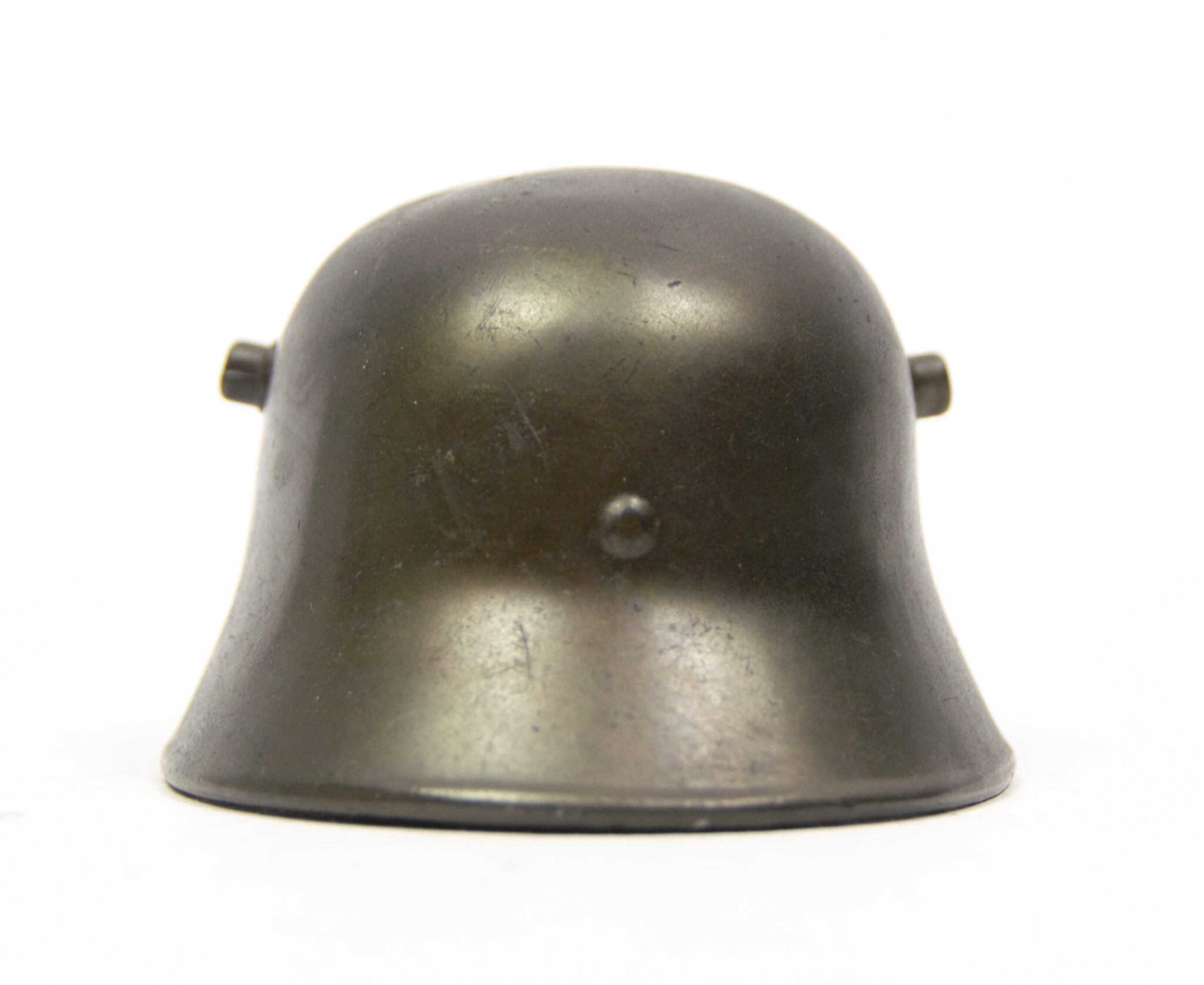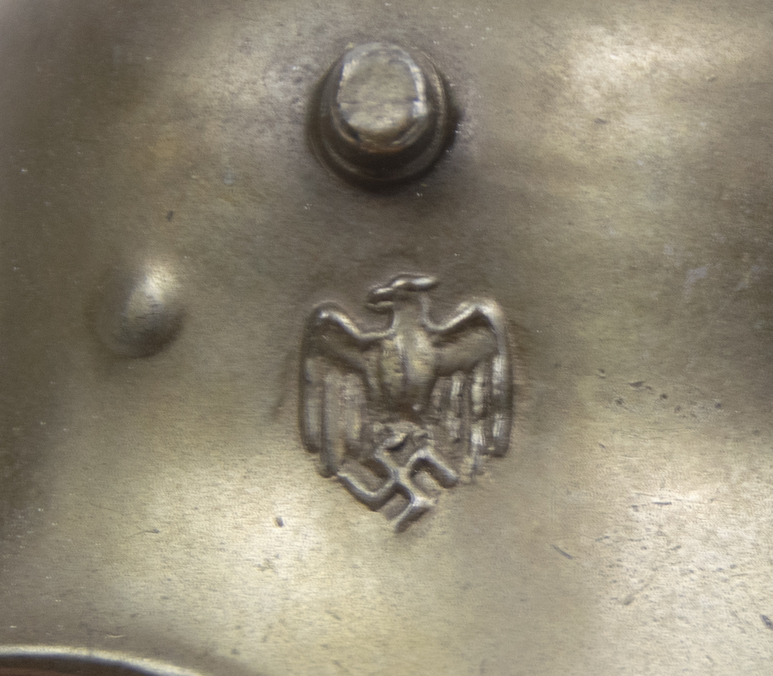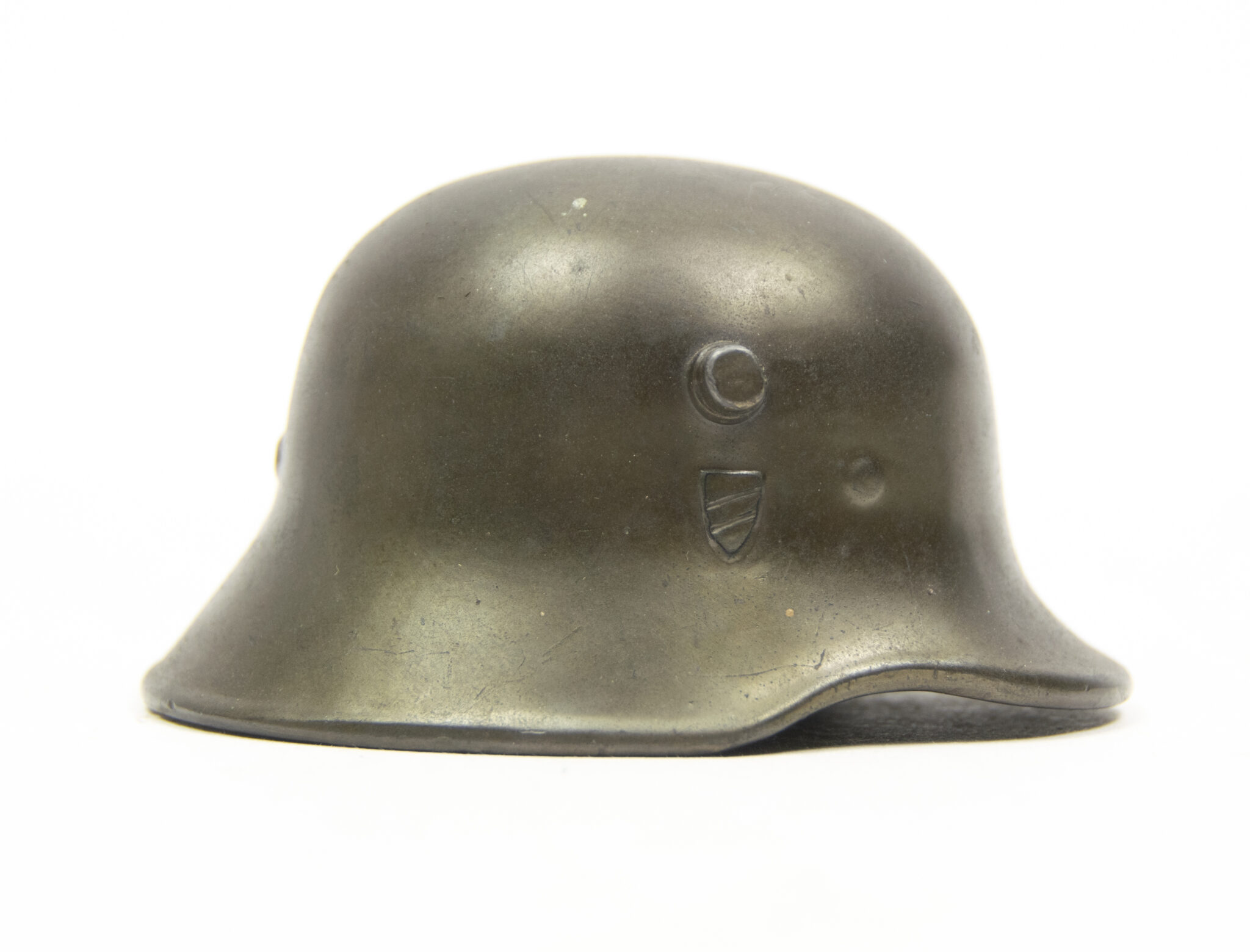 It is in good condition and was probably once intended to be used as a desc ornament. While it is as can be seen by the airvents clearly a World War I helmet model, there is an eagle with swastika on one side and a decal on the obverse, this in line with the at the time of the Third Reich period refurbished german Great War helmets.