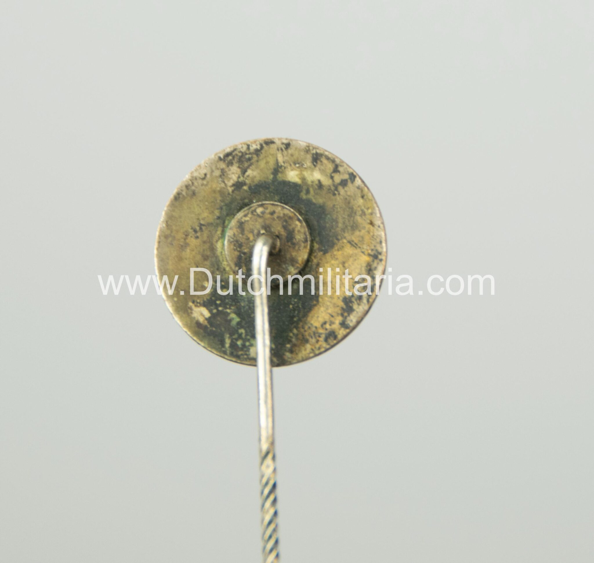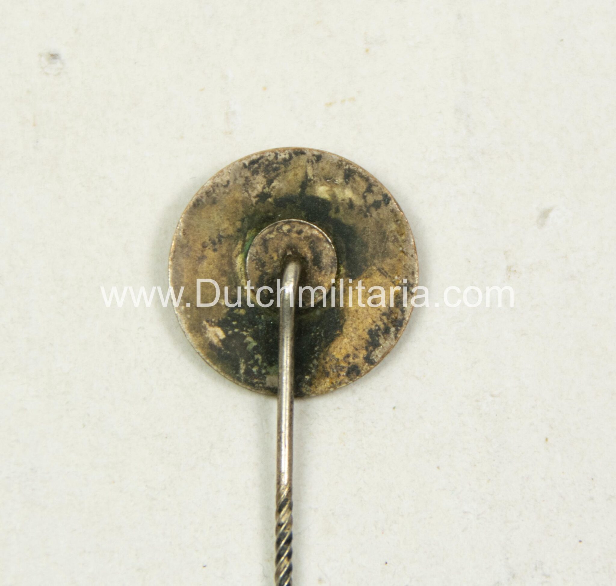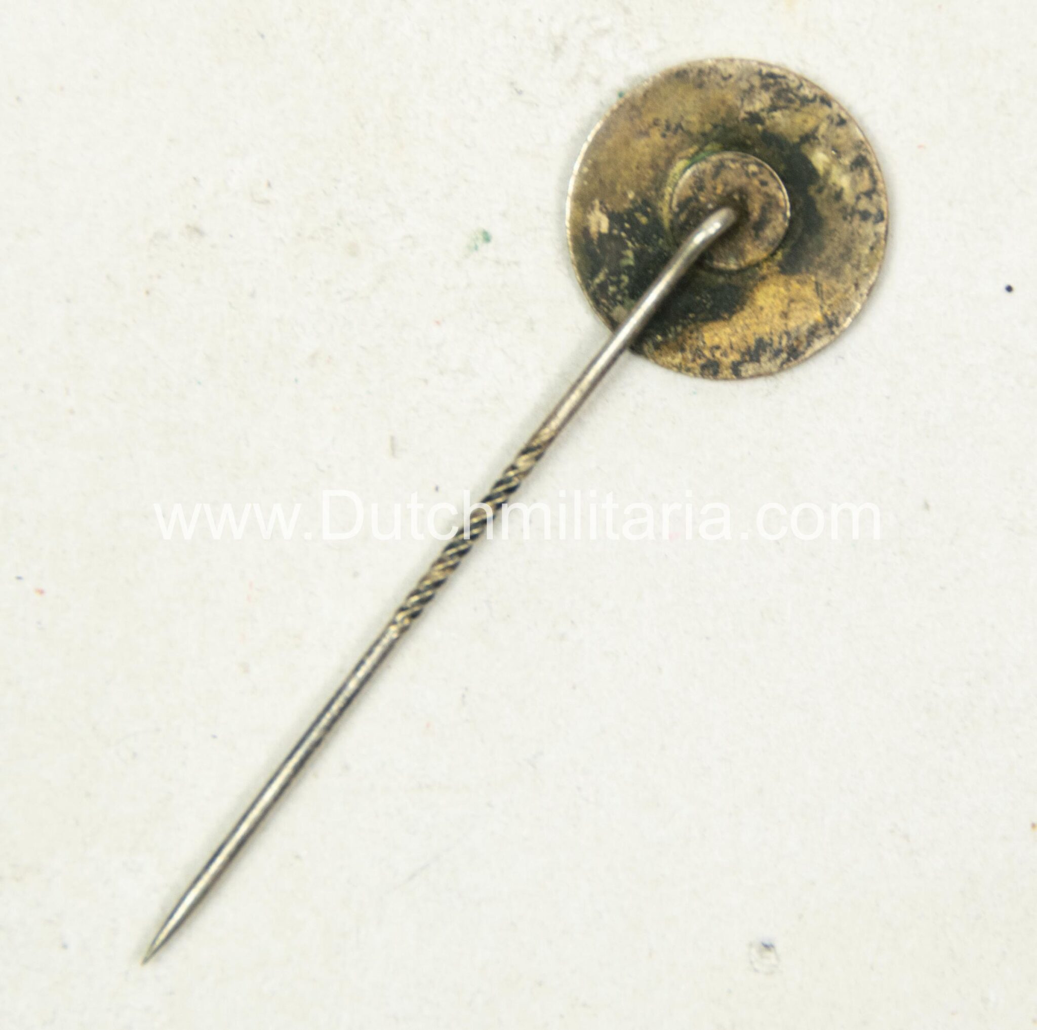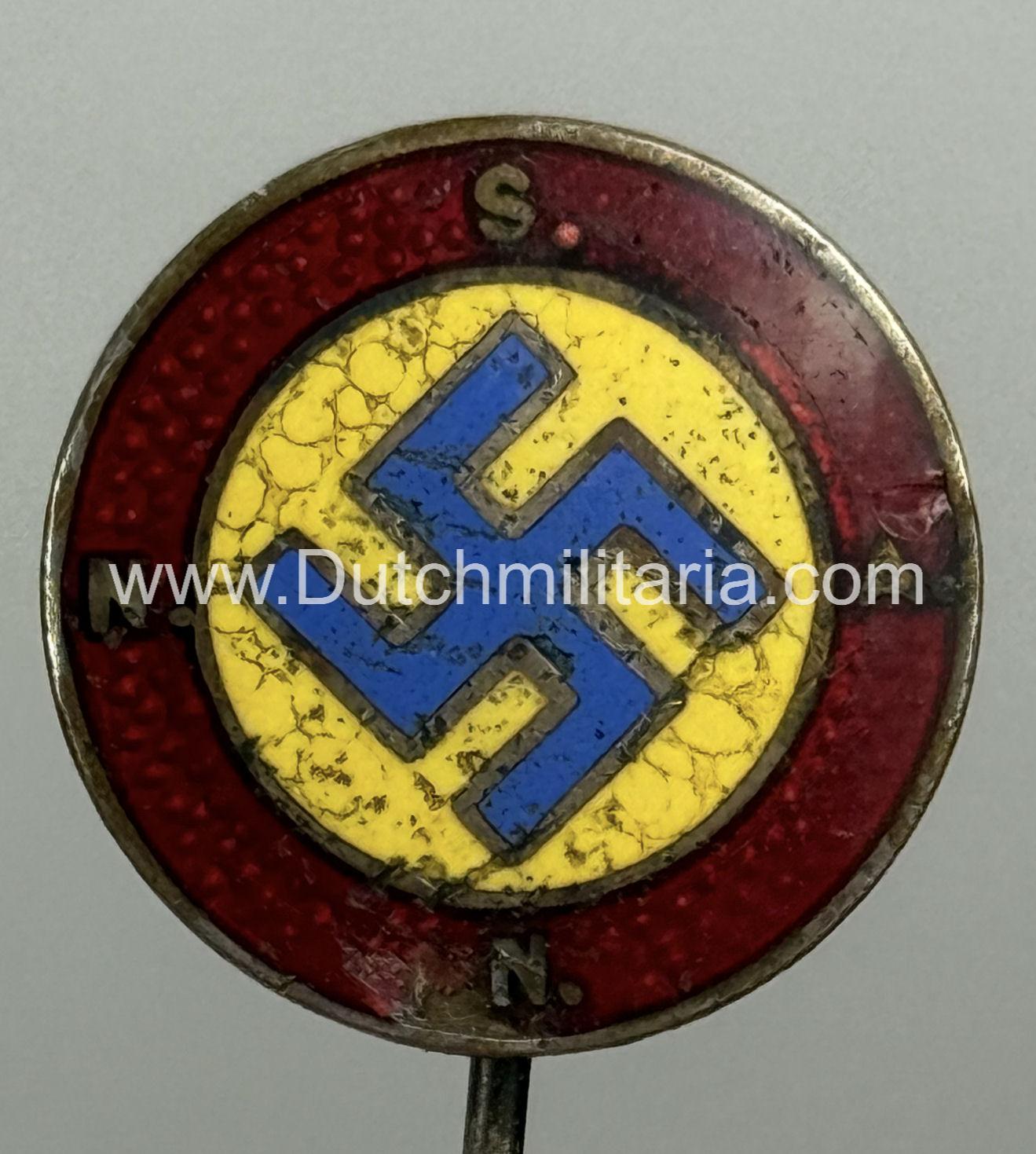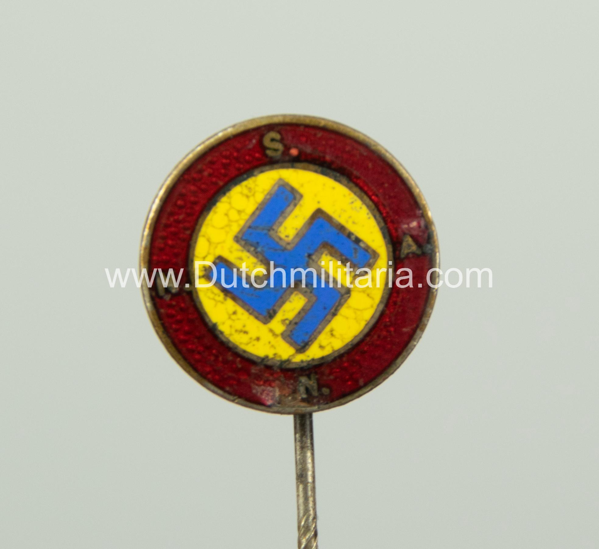 Stickpin badge. Yellow enamel with blue swastika and red border, in which the letters N.S.A.N. are running around the border. In worn condition with a bit wear and tear. Inthis instance the condition is of not too much concern as no other badge was known yet!!! Yes, it is THAT rare!