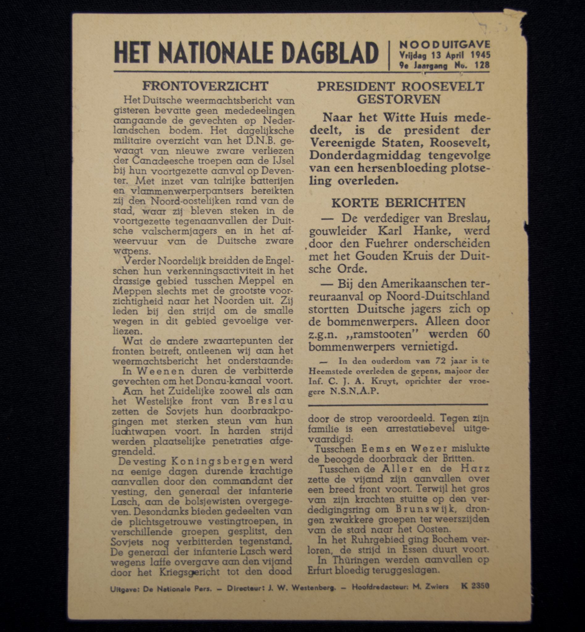 (NSB) het Nationale Dagblad NOODUITGAVE 13 April 1945 – 9e Jrg. No. 128..