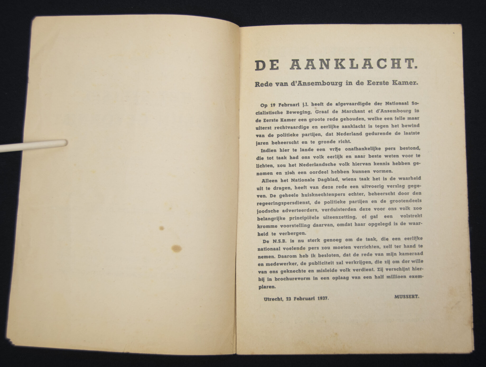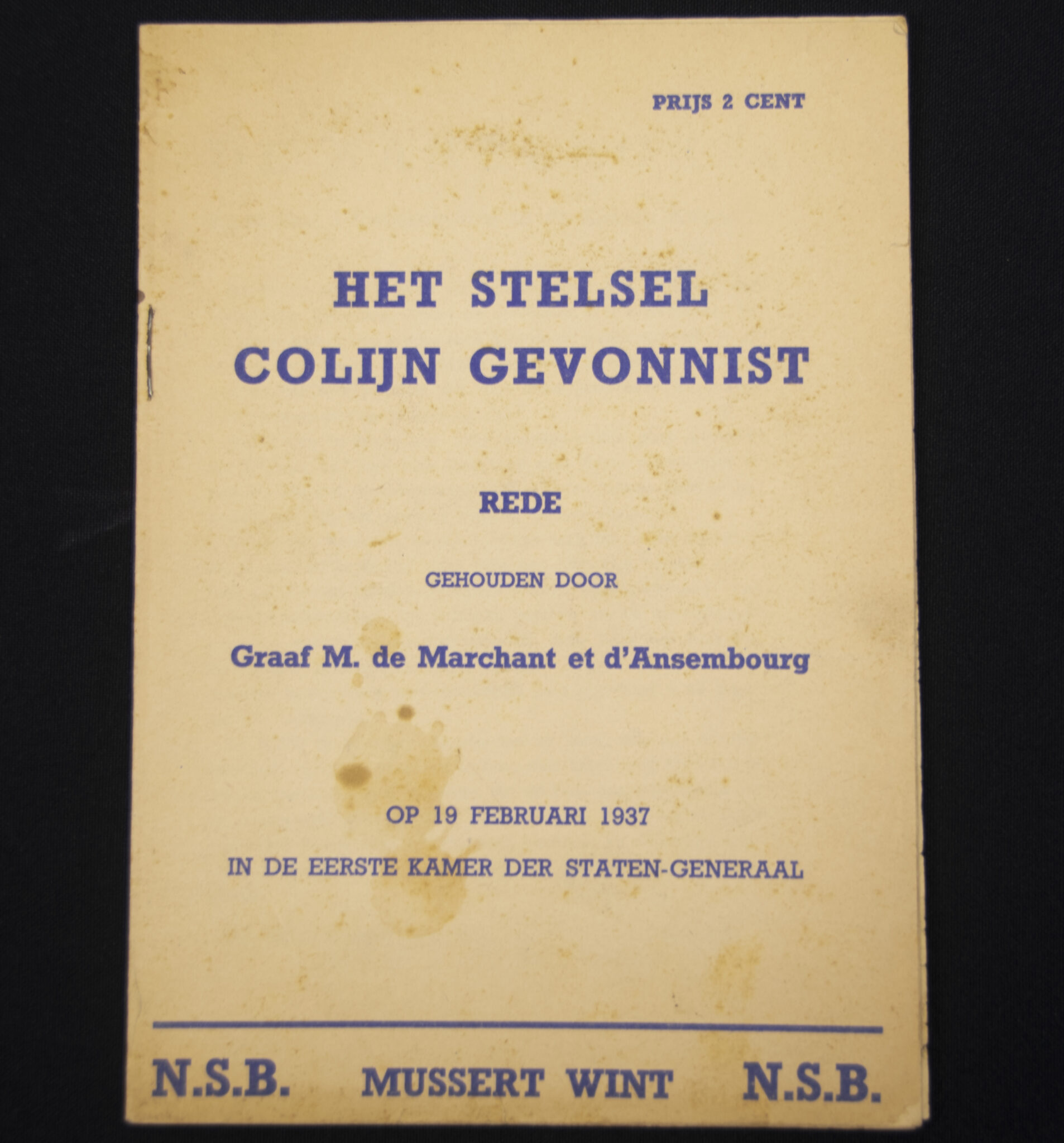 (NSB) – Graaf M. de Marchant et d’Ansembourg, Het stelsel Colijn gevonnist, (1937) 16 pp. Softcover. 19 x 13 cm.