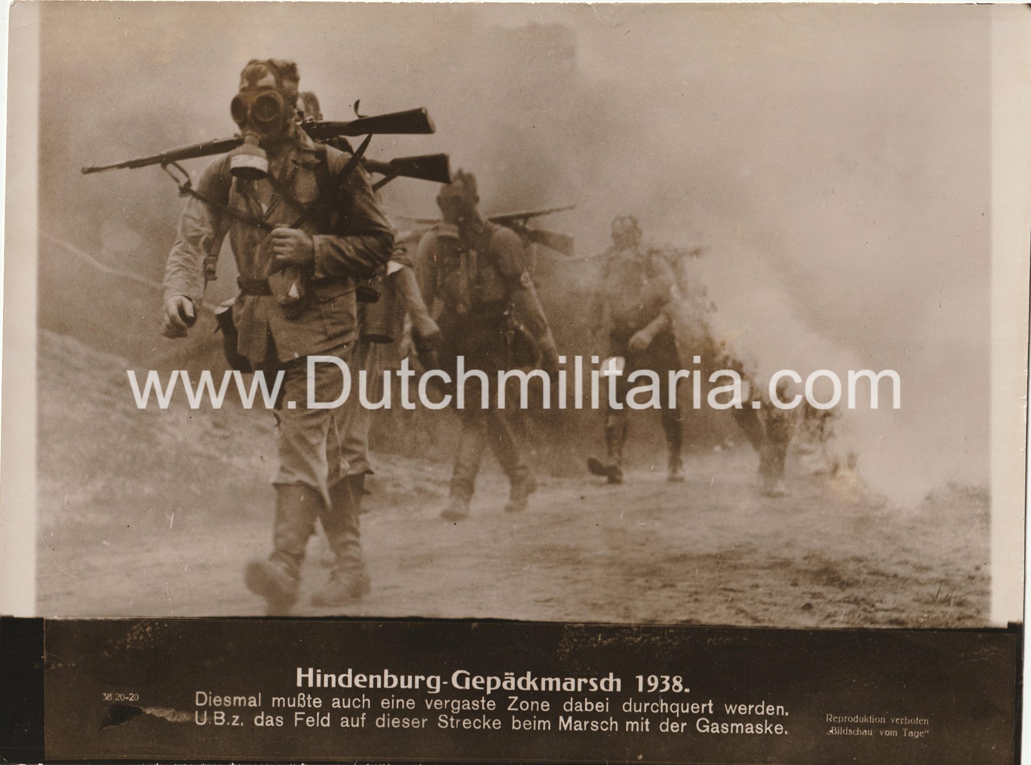 (Pressphoto) Hindenburg Gepäckmarsch 1938 (Gasmaske) (24x18cm).
