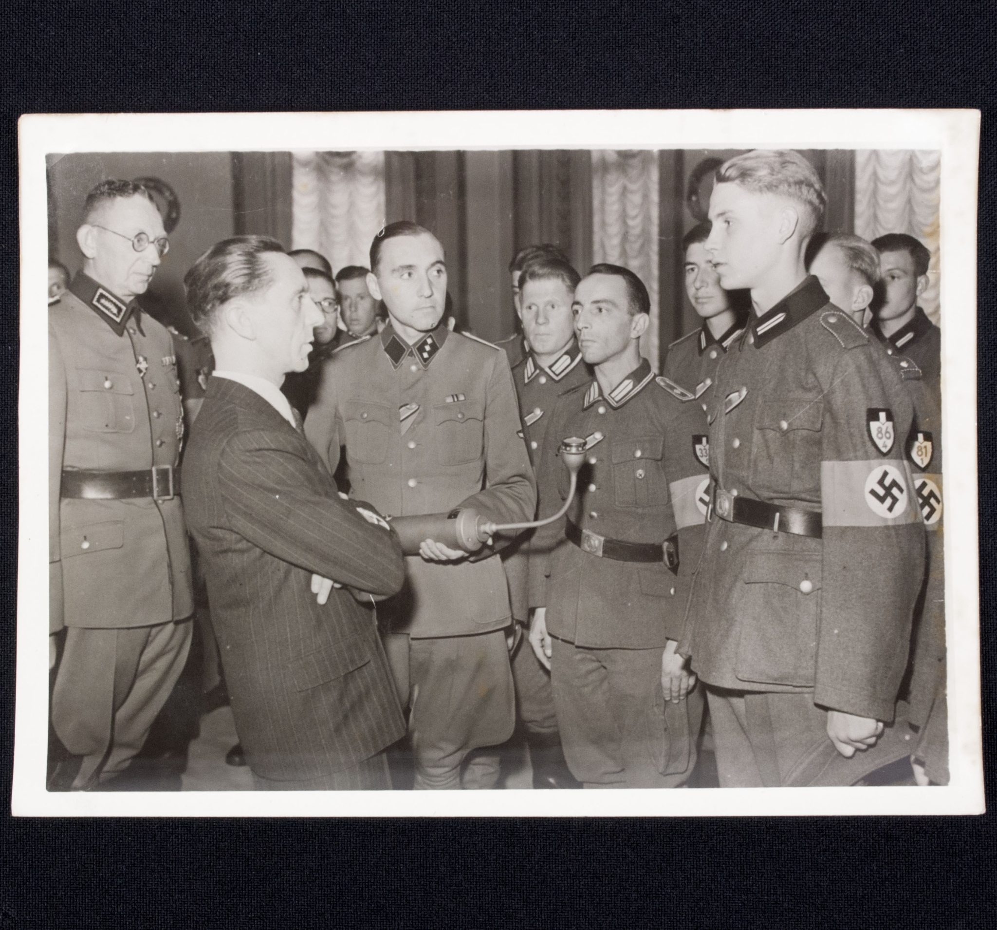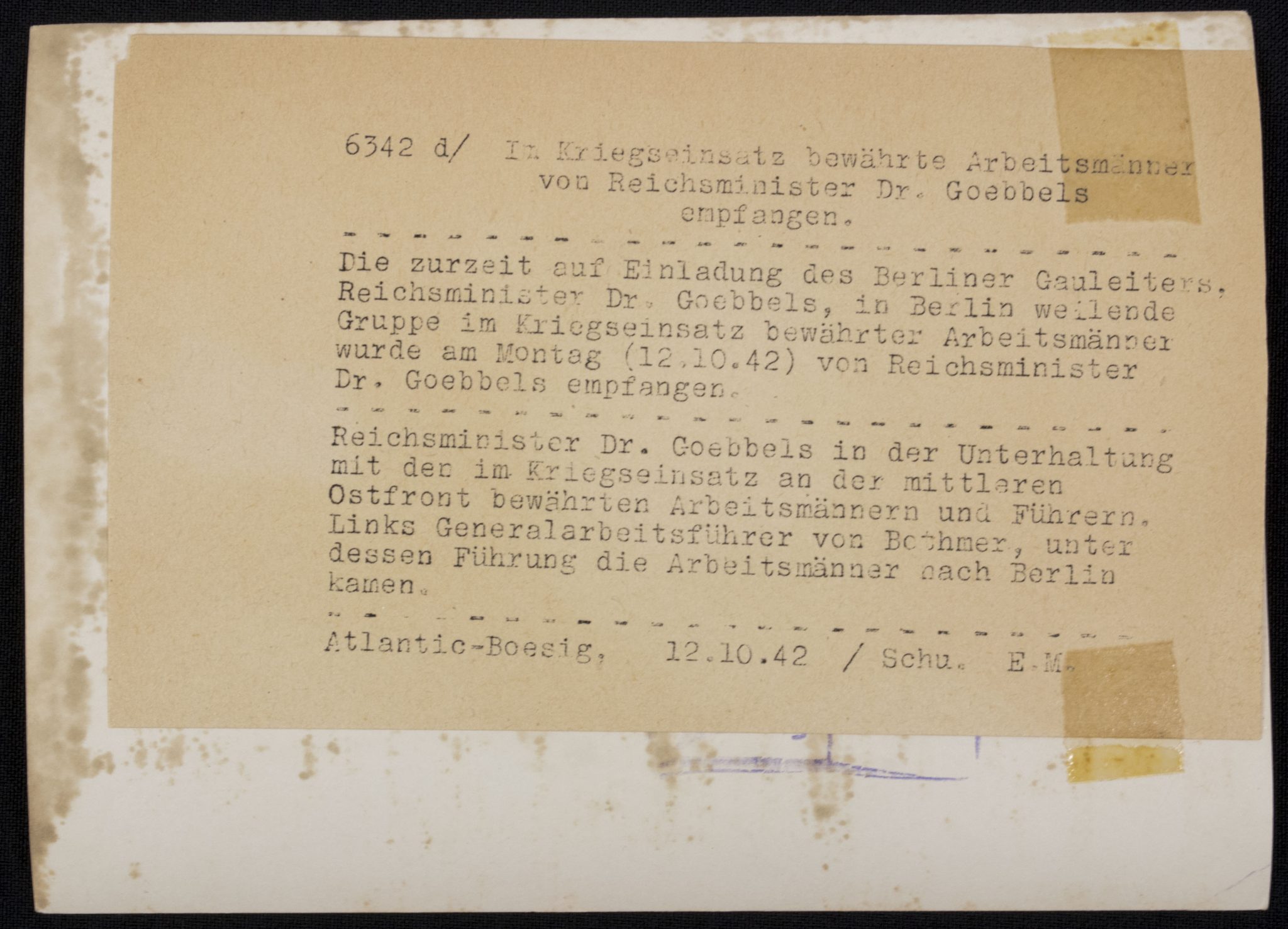 (Pressphoto) Im Kreigseinsatz bewährte Arbeitsmänner von Reichminister Dr. Goebbels empfangen (1942)
