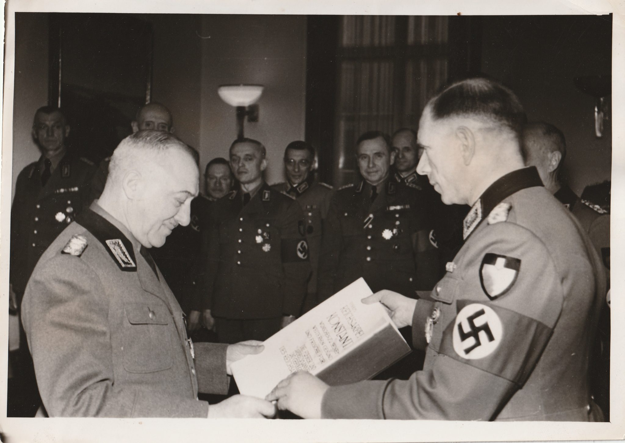 (Pressphoto) Obergeneralarbeitsführer Dr. Decker übergibt die Spendenurkunde an Reichsarbeitsführer Reichsleiter Konstantin Hierl (1943).