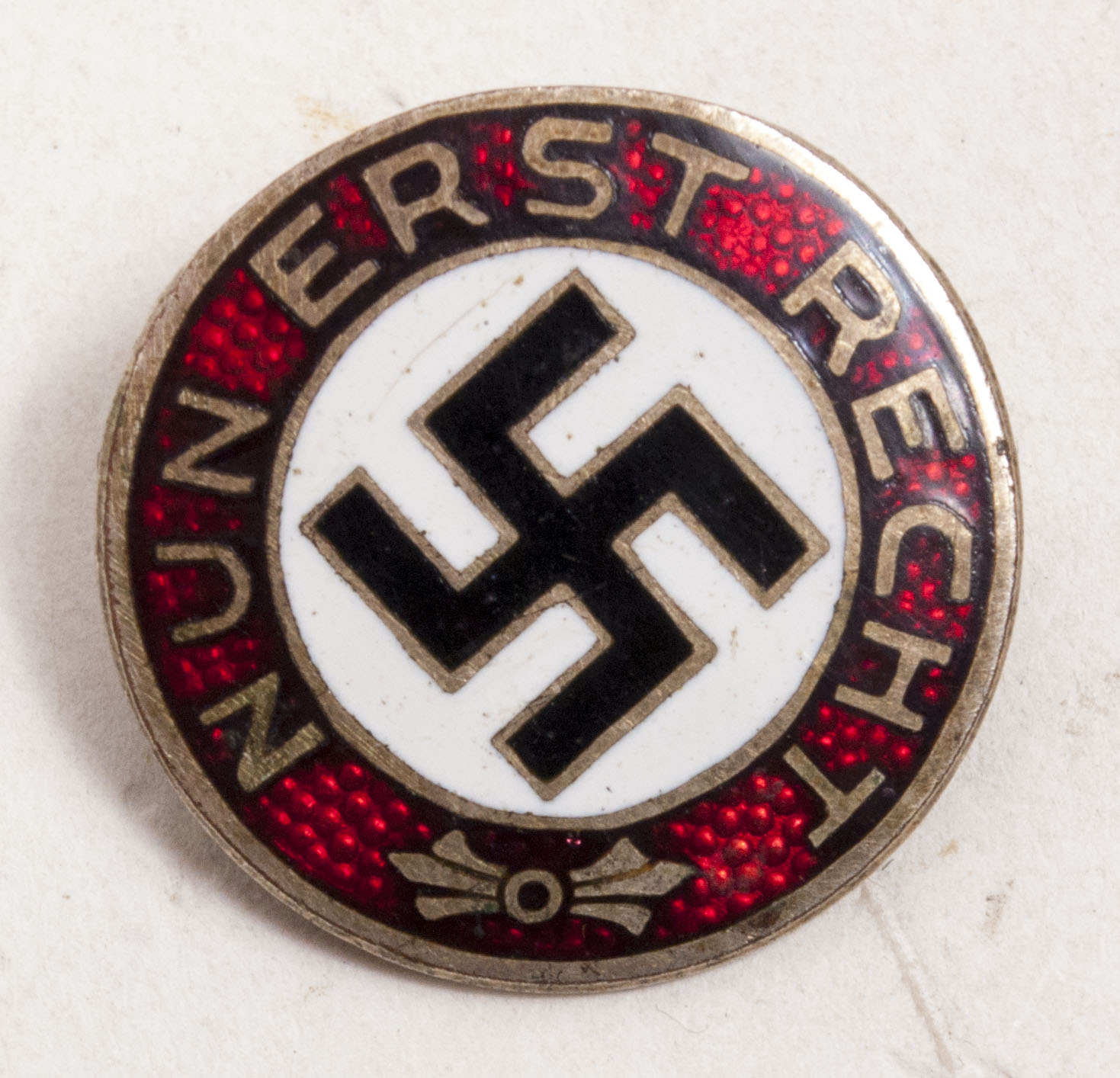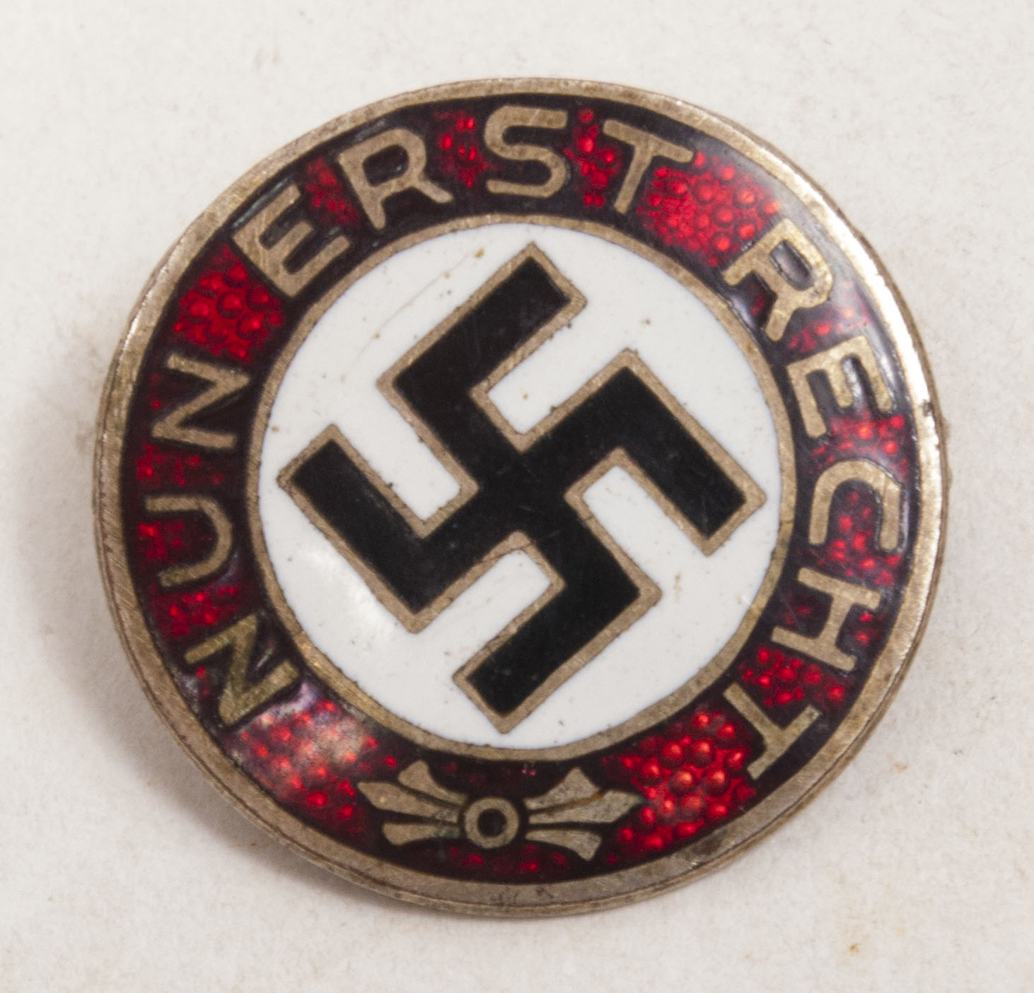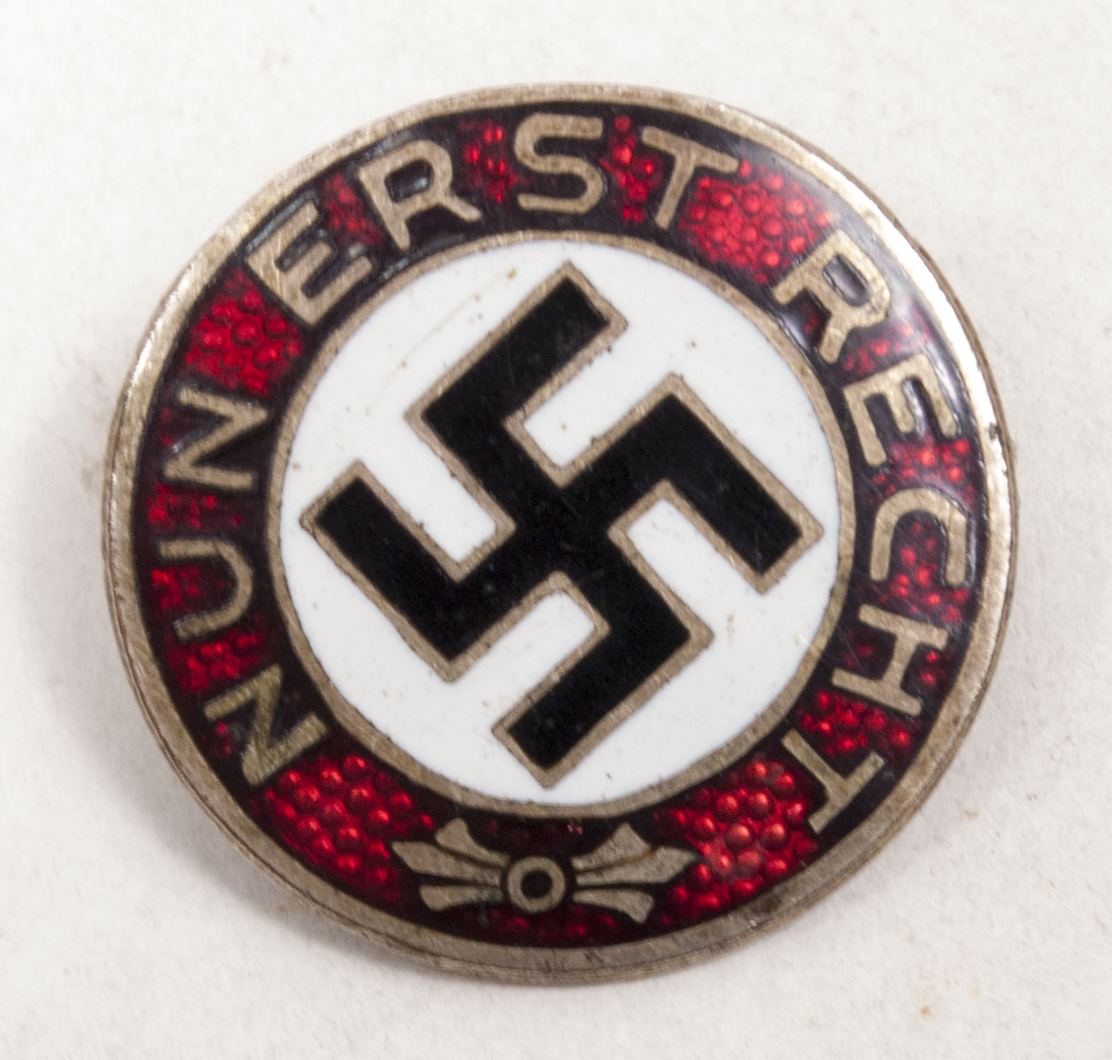 (Slogan) Full size NSDAP “Nun Erst Recht” badge.