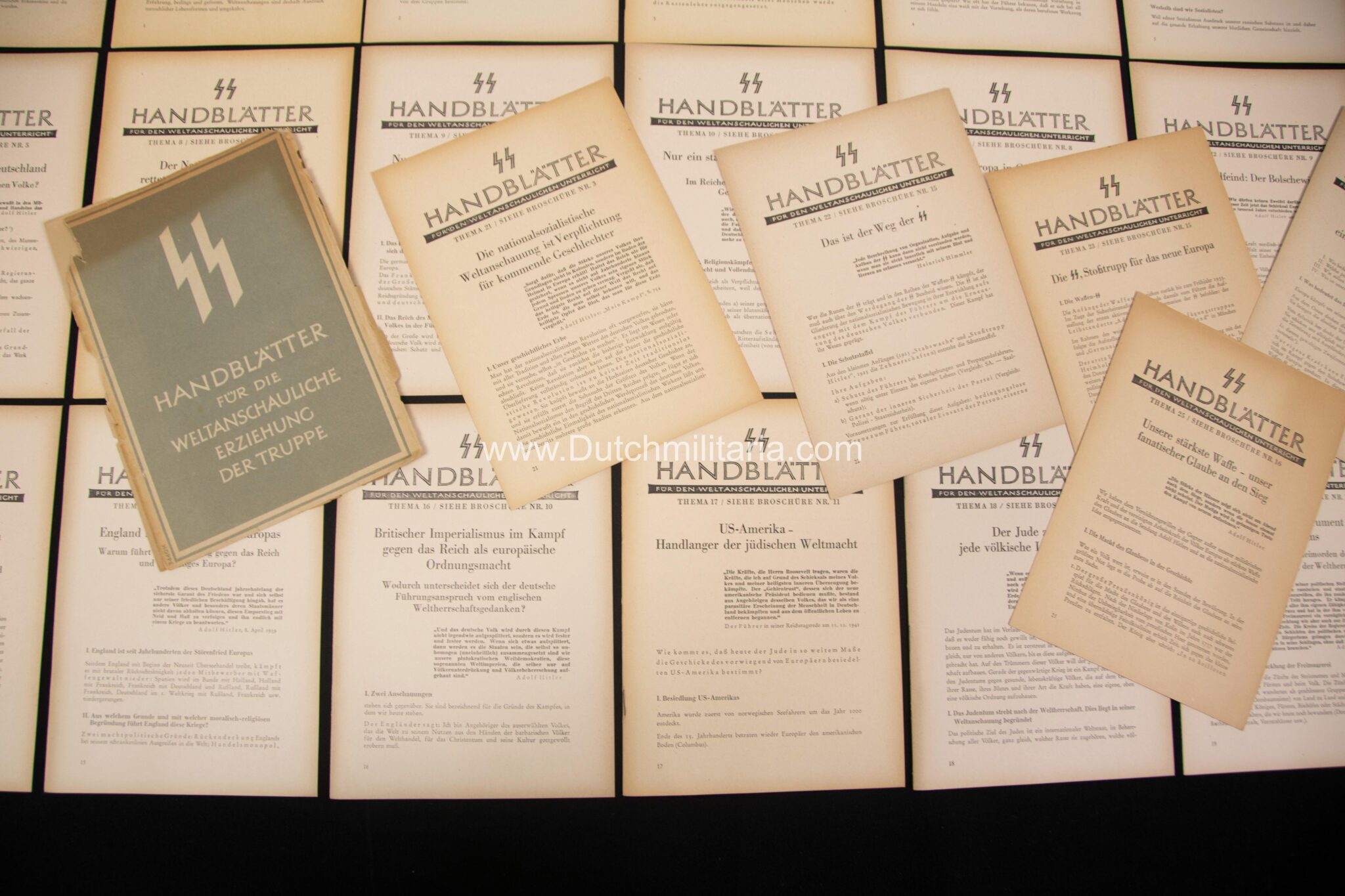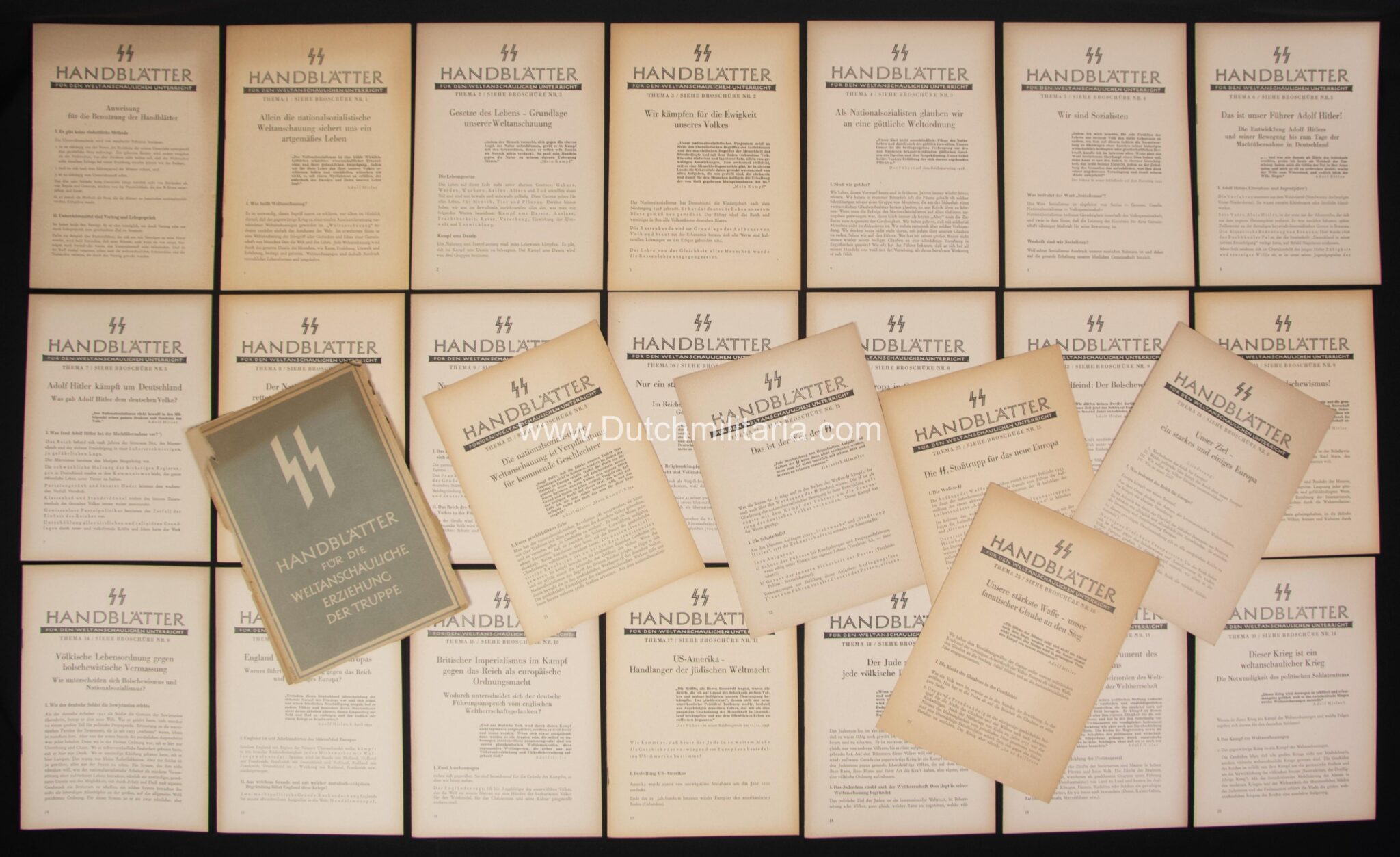 Folder with 26 numbered “Handblätter” [hand out sheets] for the SS troops. Complete. Most hand out sheets contain 4 or more pages. There are 25 numbered ones and one unnumbered. All sheets are in excellent condition. The cover is there but the spine is open and the brittle paper has some age damage.