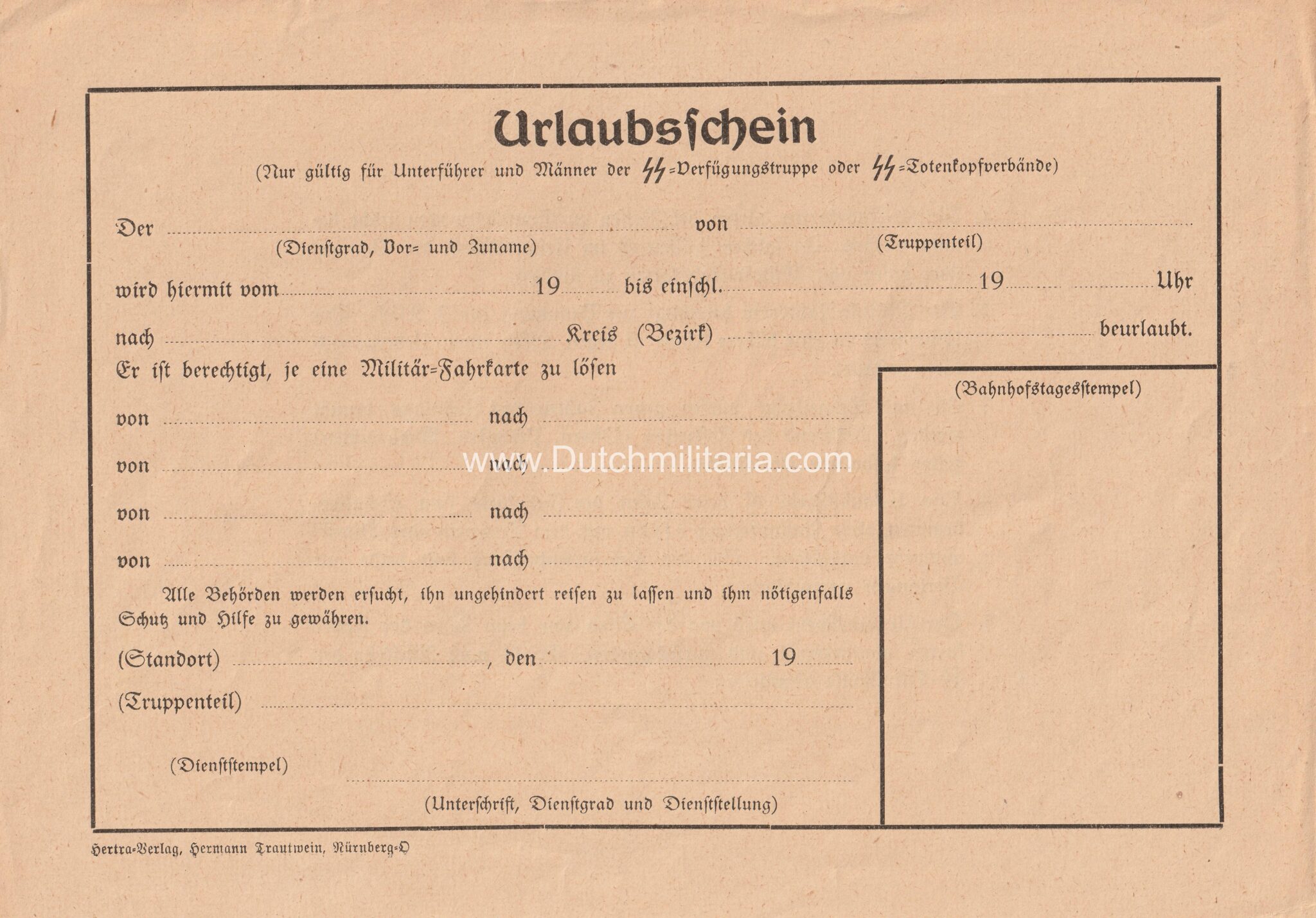 SS-Urlaubschein für Unterführer und Männer der SS-Verfügungstruppe oder SS-Totenkopfverbände.