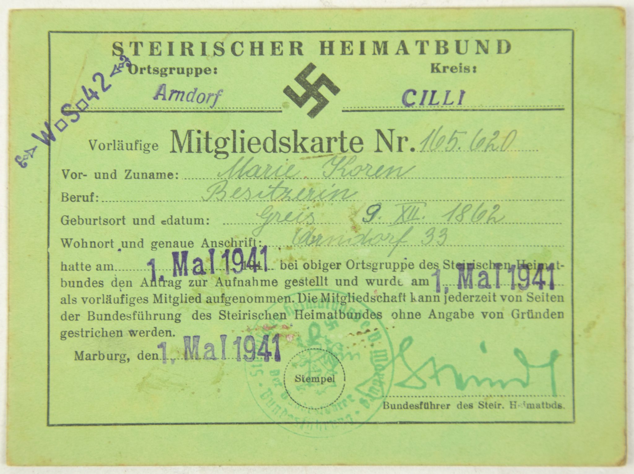 Steirischer Heimatbund Mitgliedskarte (1941).