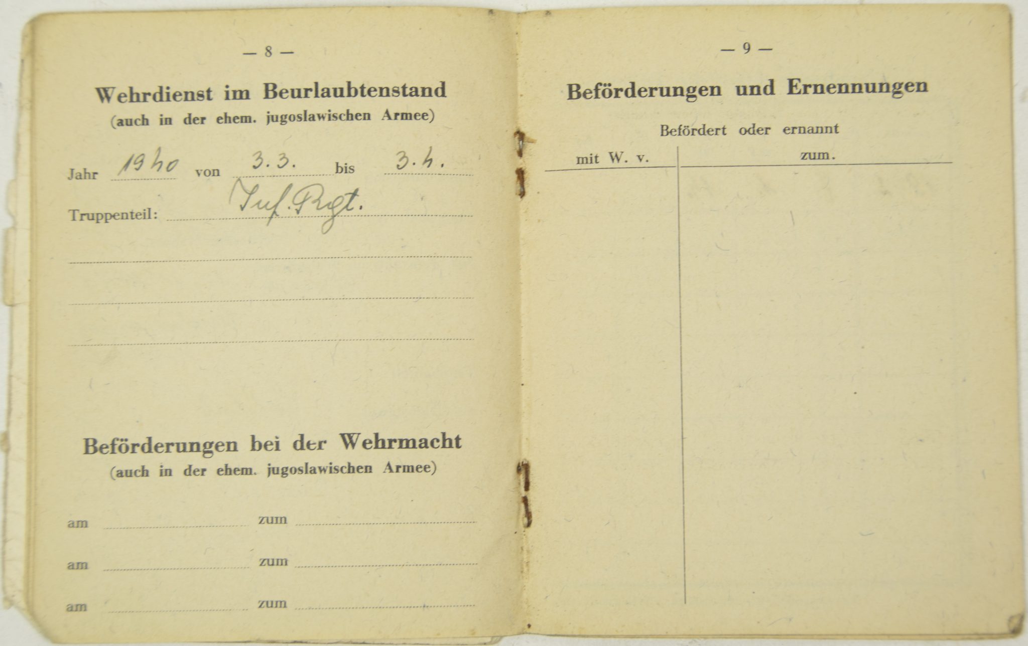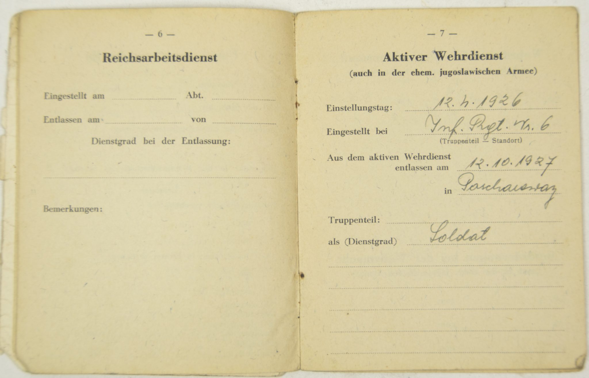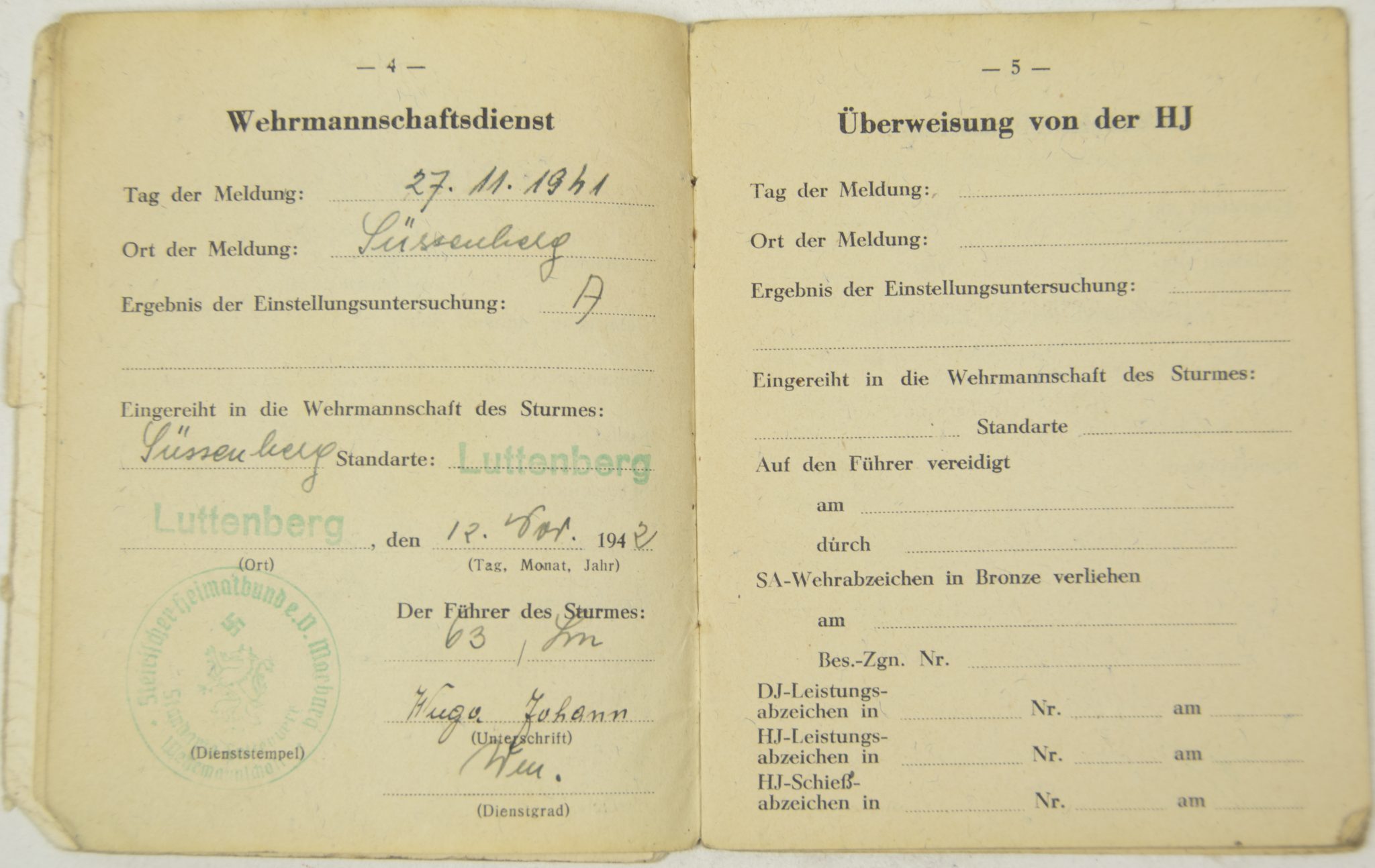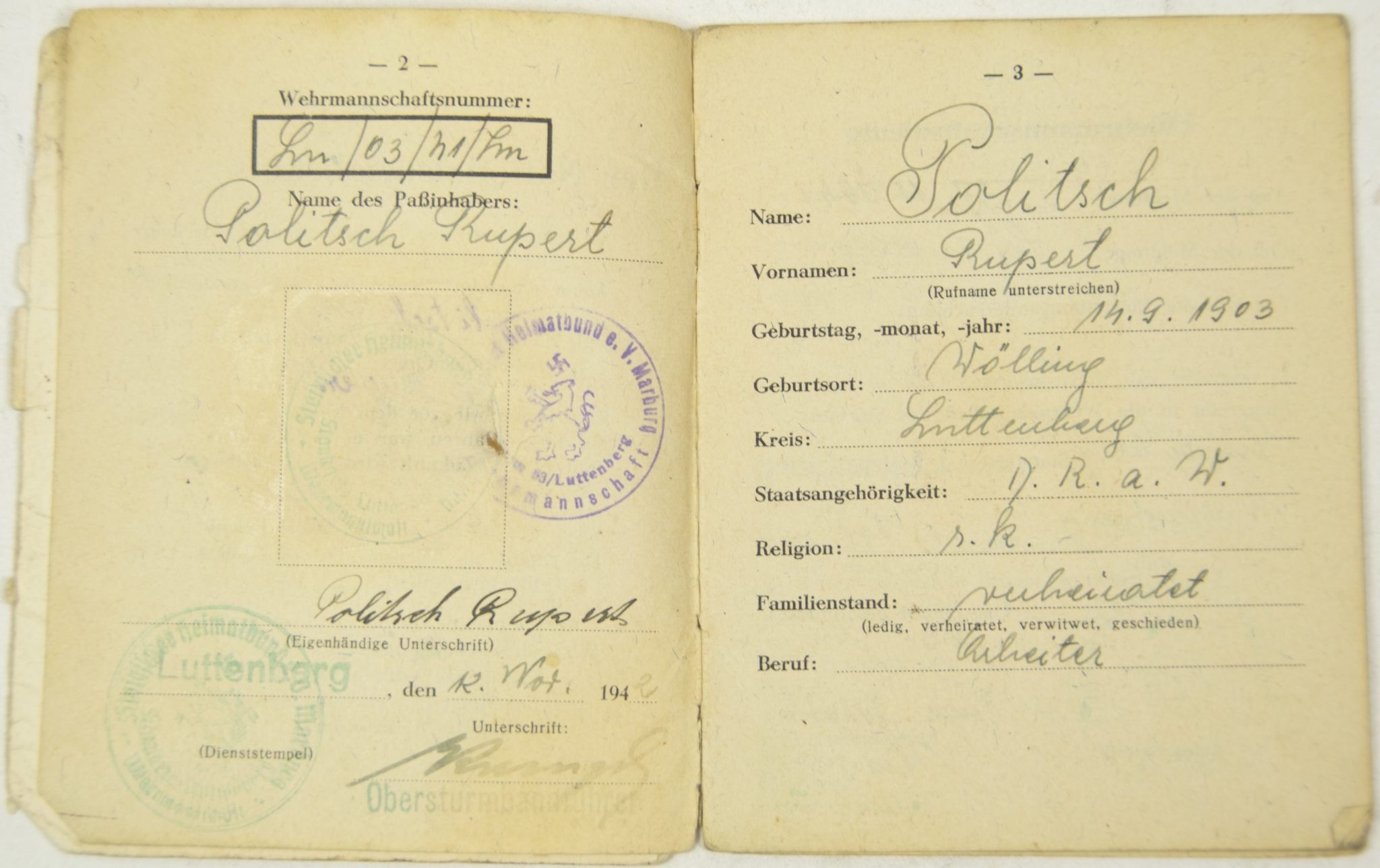 The Wehrmannschaftspass is named and filled in, but in bad and very used condition. Priced accordingly.