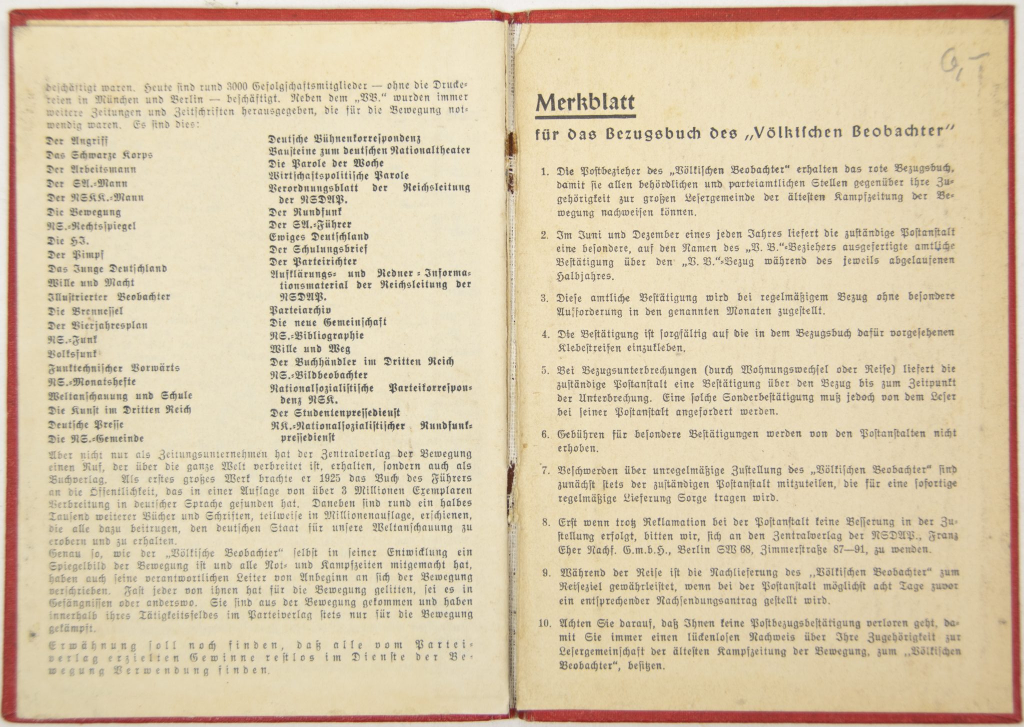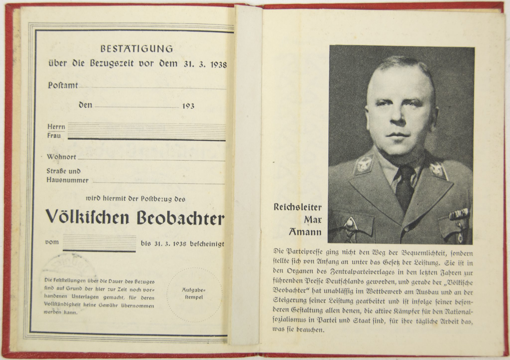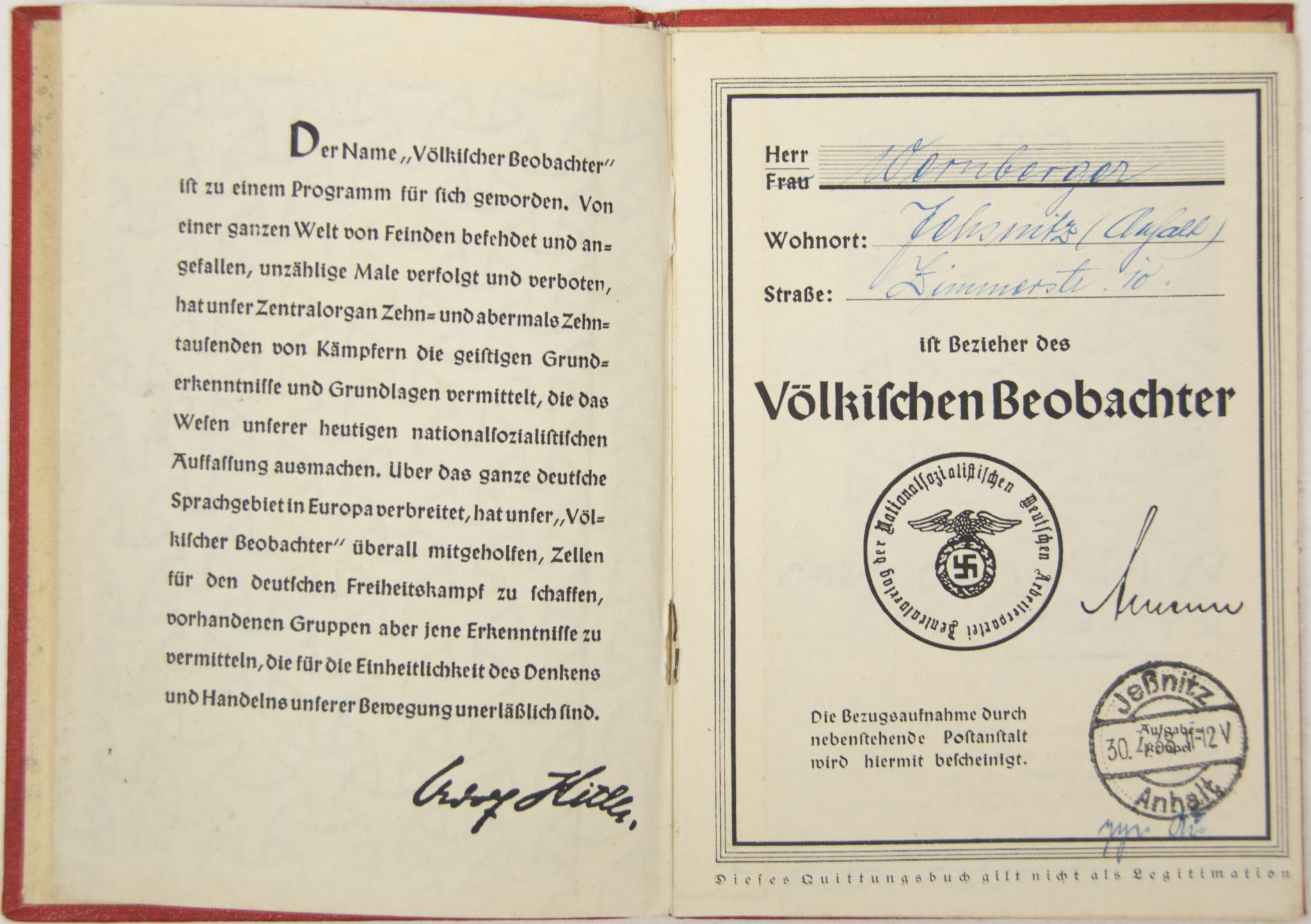 Völkischer Beobachter employee/sales or canvassing pass (1938).