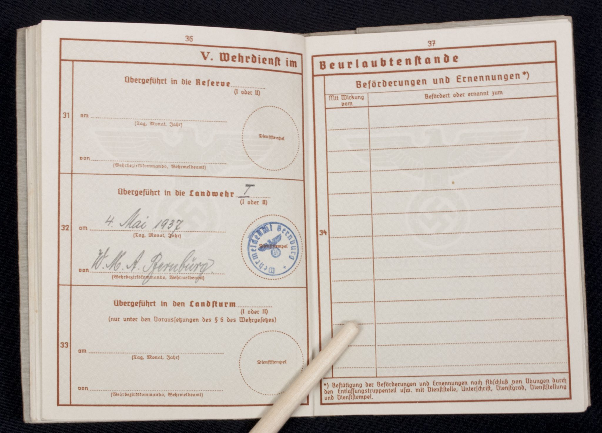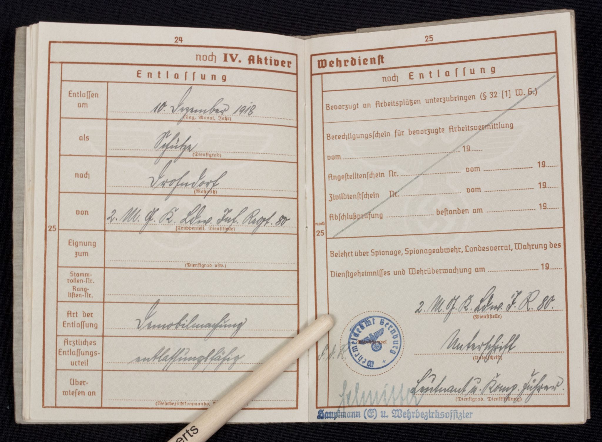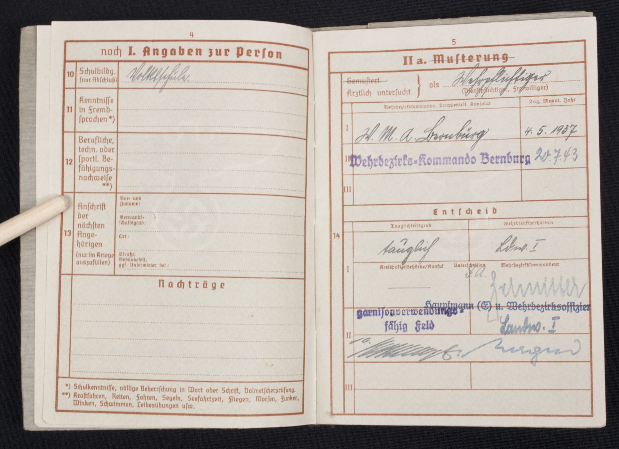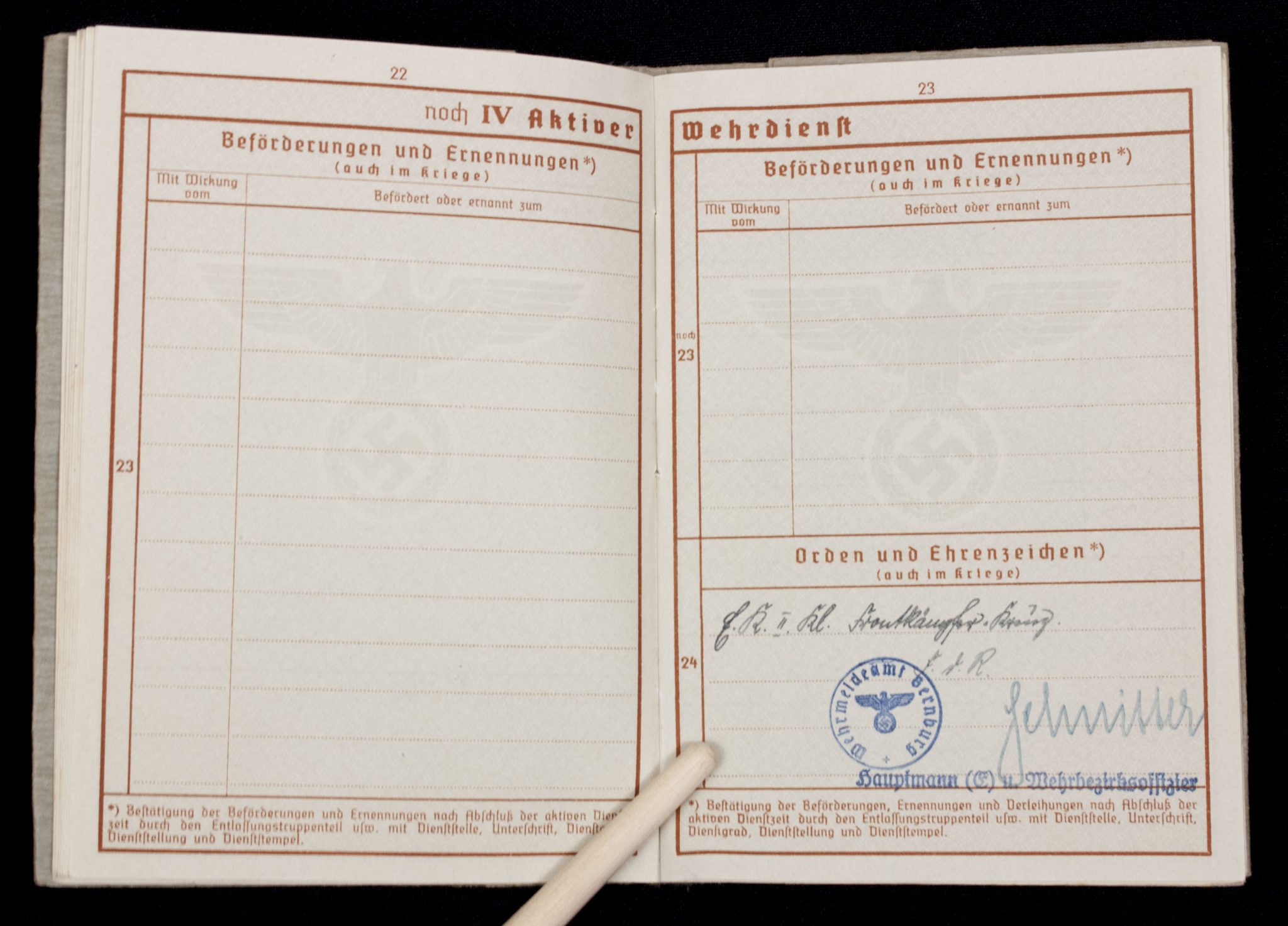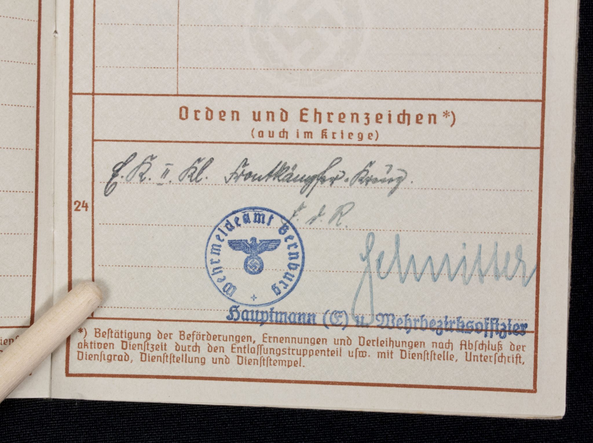 Wehrpass Wehrbezirkskommando Bernburg (Iron cross + Frontkämpfer cross entry).