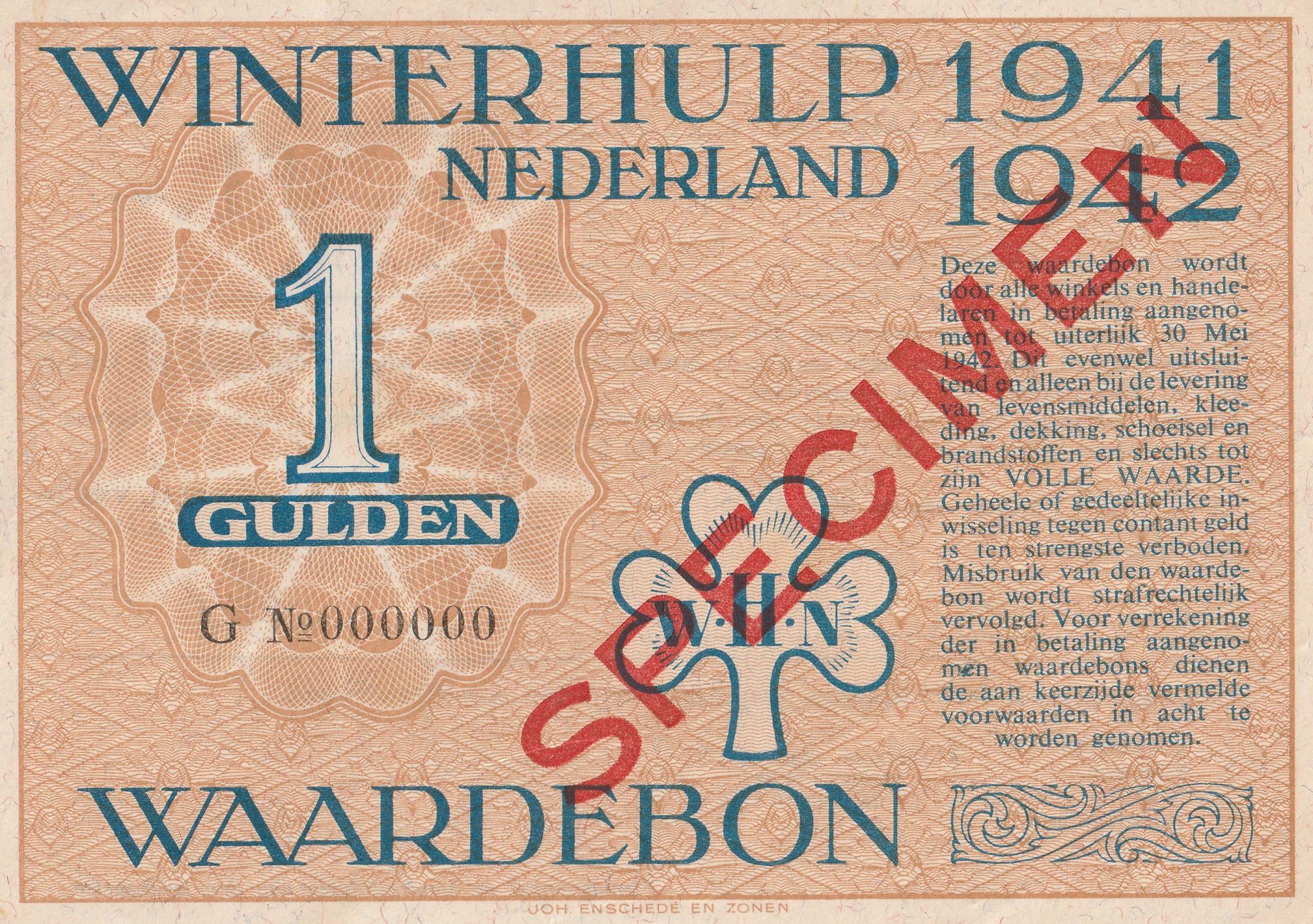 Winterhulp Nederland 1941-1942 (WHN) 1 Gulden Waardebon (Specimen).