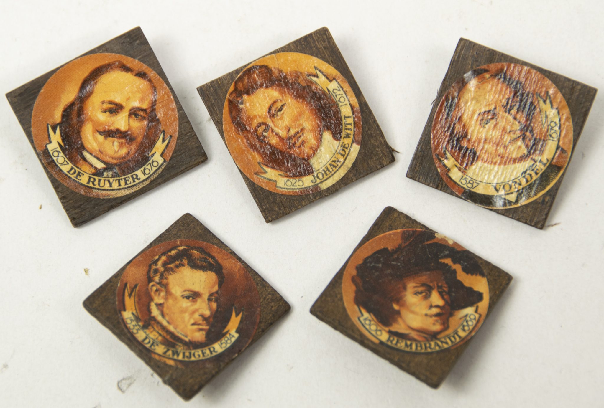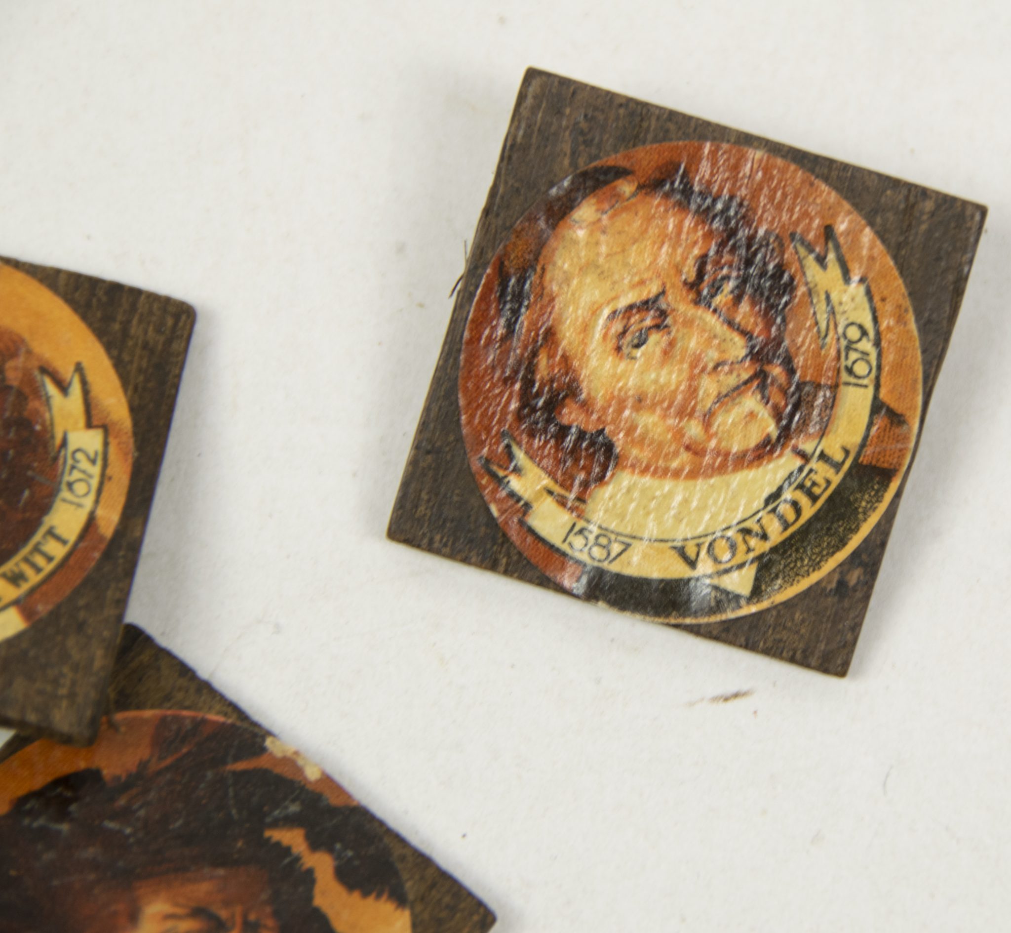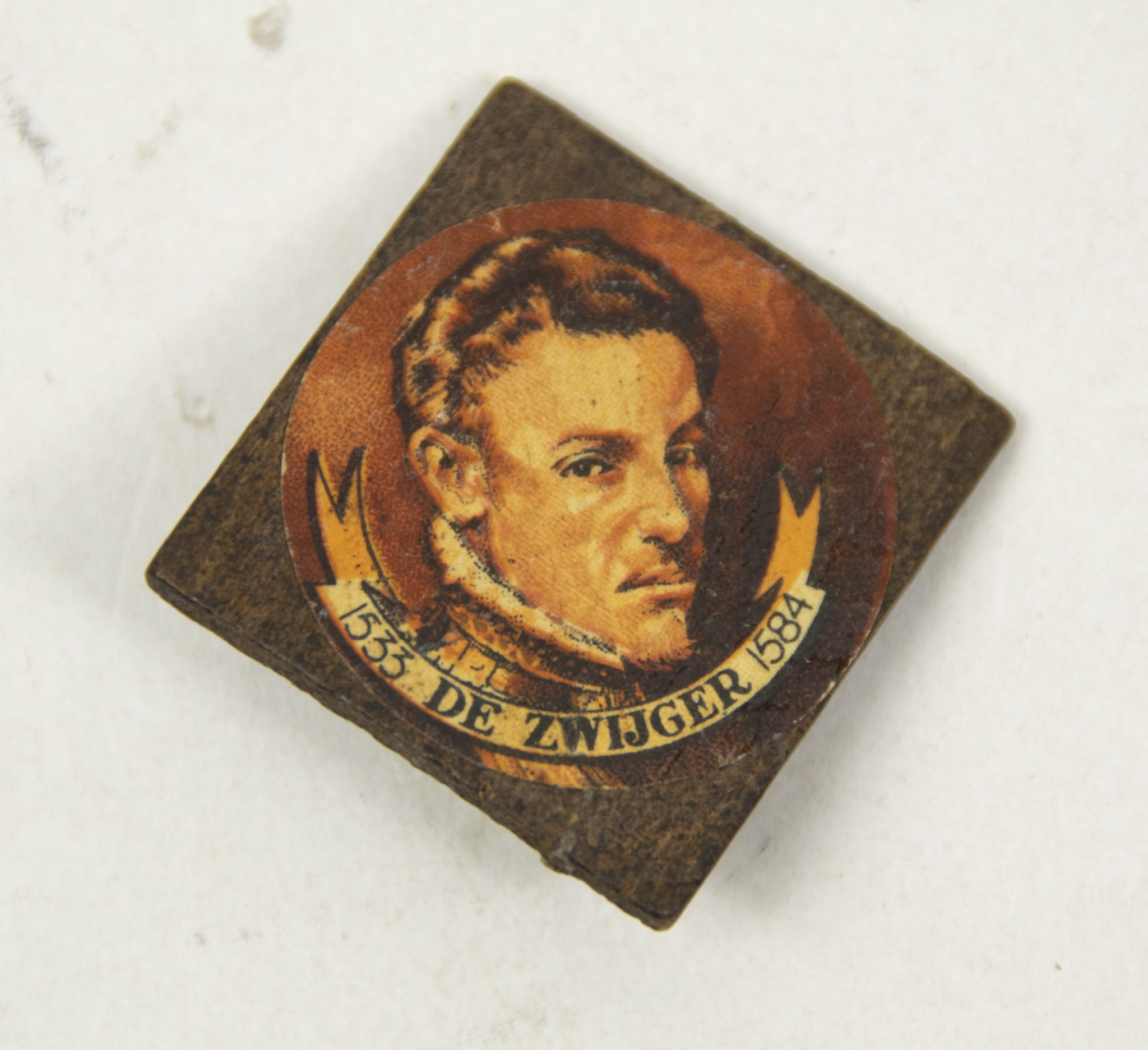 The 5 badges of this series were sold on 27 + 28 februari 1942. They show “famous” dutch historical persons: Joost van den Vondel, Willem de Zwijger, Michiel de Ruijter, Johan de Witt en Rembrandt van Rijn.