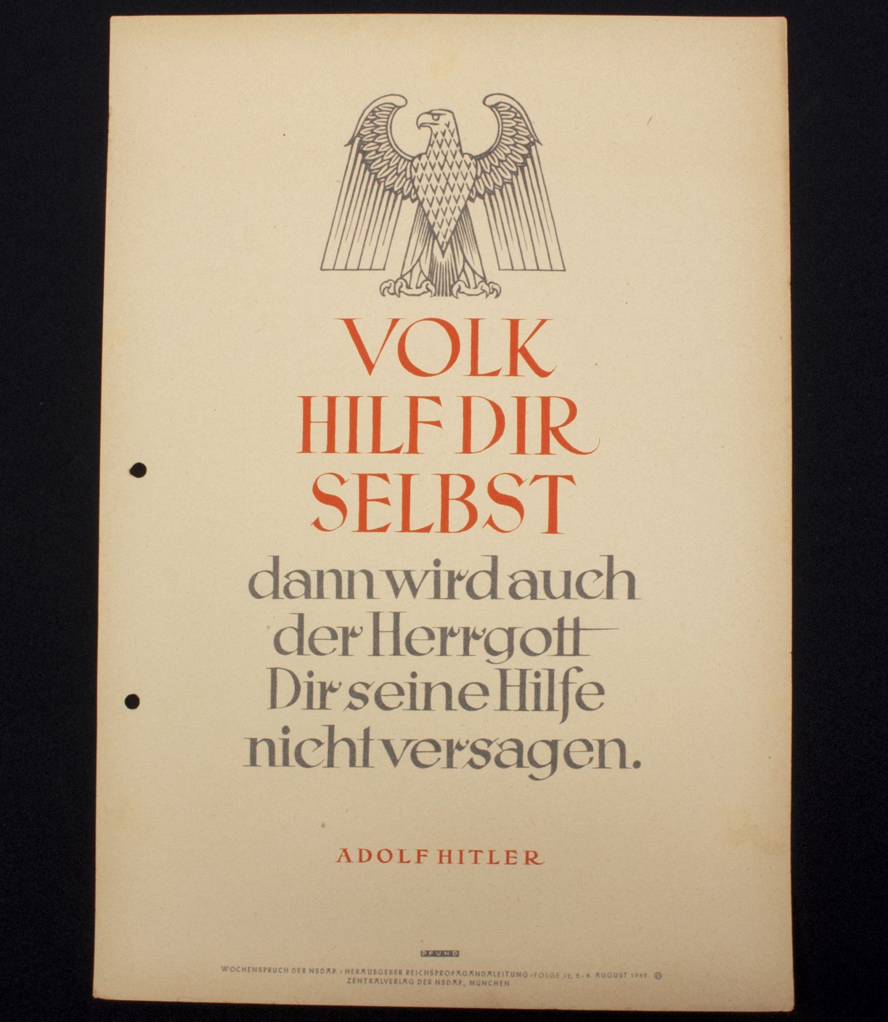 These “Wochensprucher” were official by the NSDAP published little propagandaposters, that could because of their small sizes easily be hung up in houses (e.g. in the kitchen), but also in public buildings, et cetera.