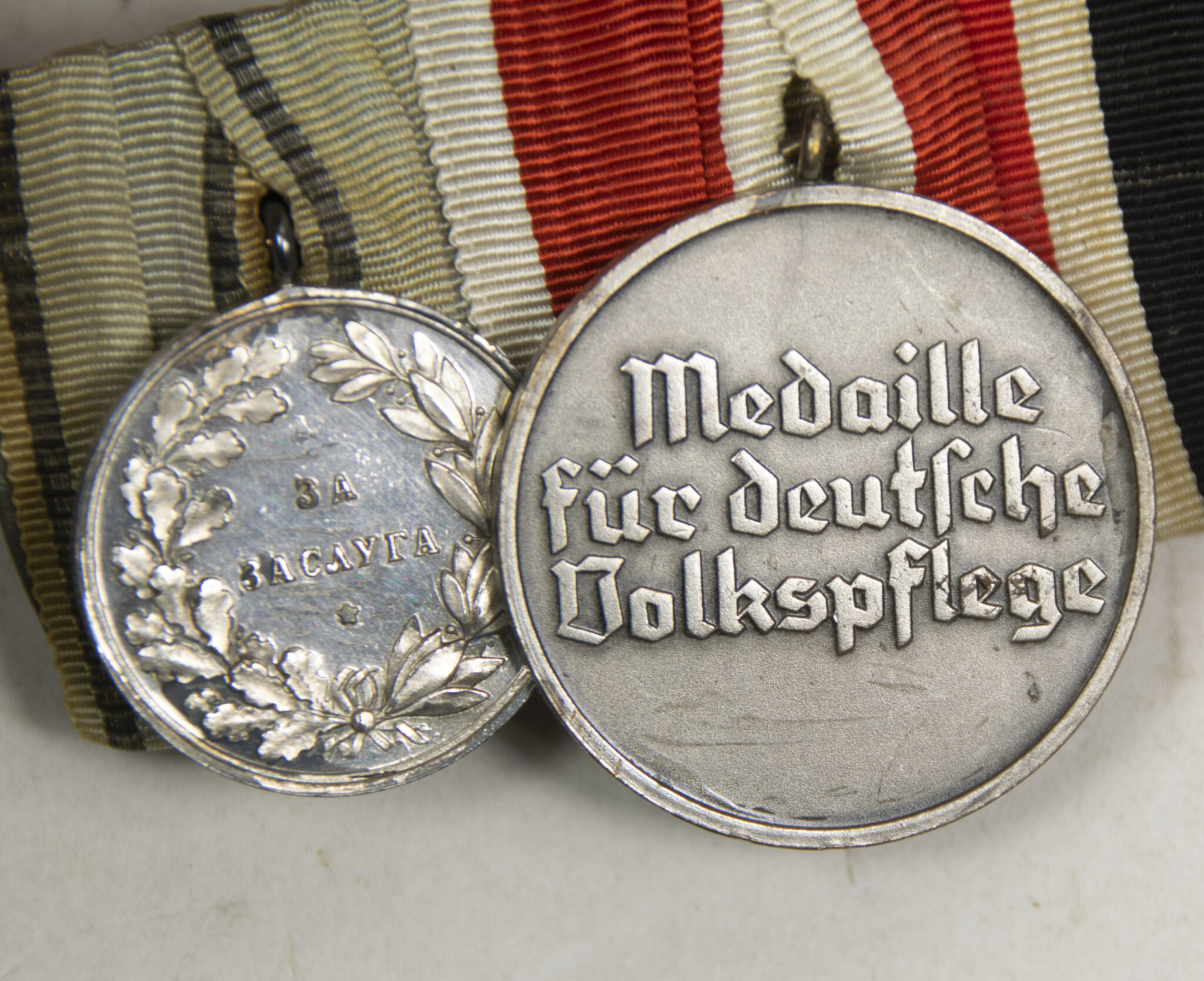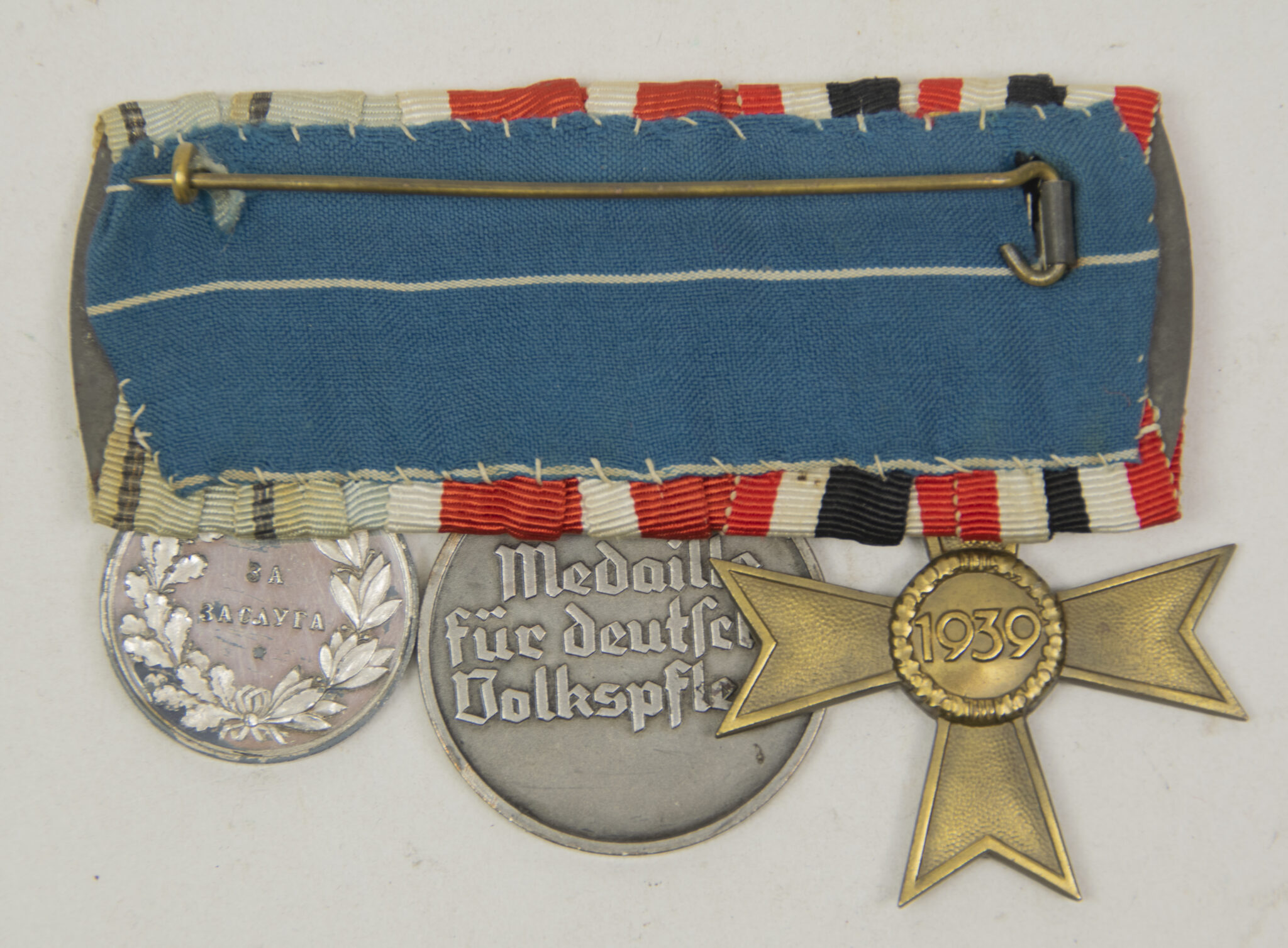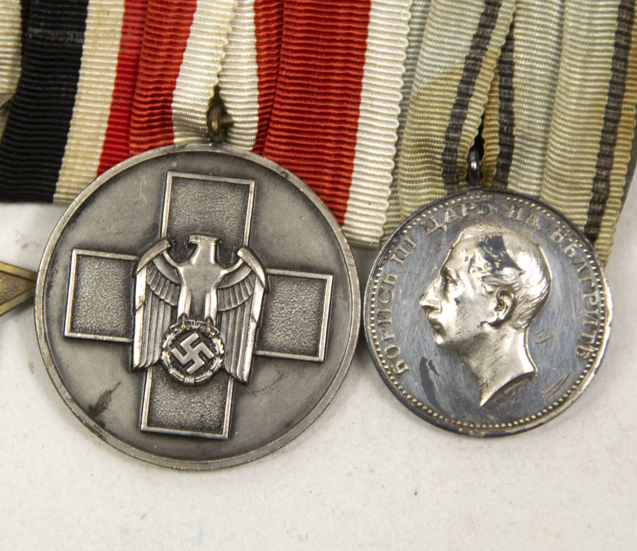 This is a WWII Medalbar with Kriegsverdienstkreuz ohne Schwerter/War Merit Cross withouth swords + Volkspflege medal + Bulgarian Boris III Tsar medal for merits.
